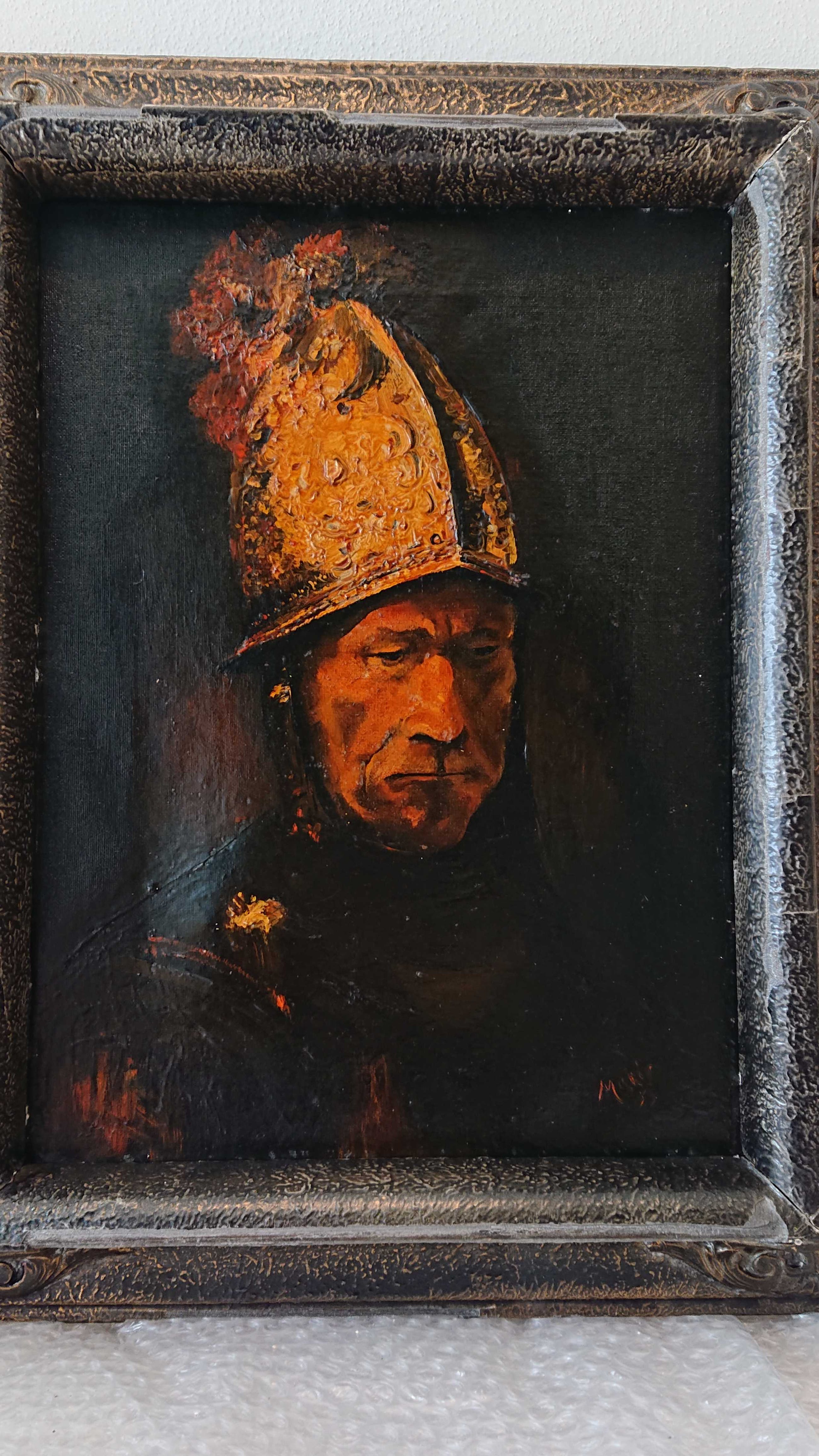 Er van uitgaande dat dit een studie of wel kopie van Rembrandts ‘Man met de gouden Helm’ betreft door een van de broers Maris (de datering ’53 zou dan 1853 betekenen); zou Matthijs Maris 14 jaar zijn geweest en het ligt daarmee in lijn met de periode waarin zij kopieën van bekende meesters maakten. Al op jonge leeftijd blijkt Matthijs een groot talent. Op zijn dertiende gaat hij naar de ‘Haagsche Teekenacademie’. Om wat bij te verdienen kopieert hij met zijn broer Jacob voor een kunsthandel werk van schilders als Schelfhout en Koekkoek. Beide broers hanteren echter doorgaans een aan elkaar geschreven ‘r’ in hun signatuur in plaats van een vrije ‘R’. Bij Matthijs is hierin in de jonge jaren af en toe een afwijking te ontdekken. Nogmaals, dit betreft een vermoeden. Evenzo is het een aardige studie van ‘Man met de gouden Helm’, en verkeerd het werk in prima staat. Het zou dus ook een werk van een andere Maris kunnen betreffen.