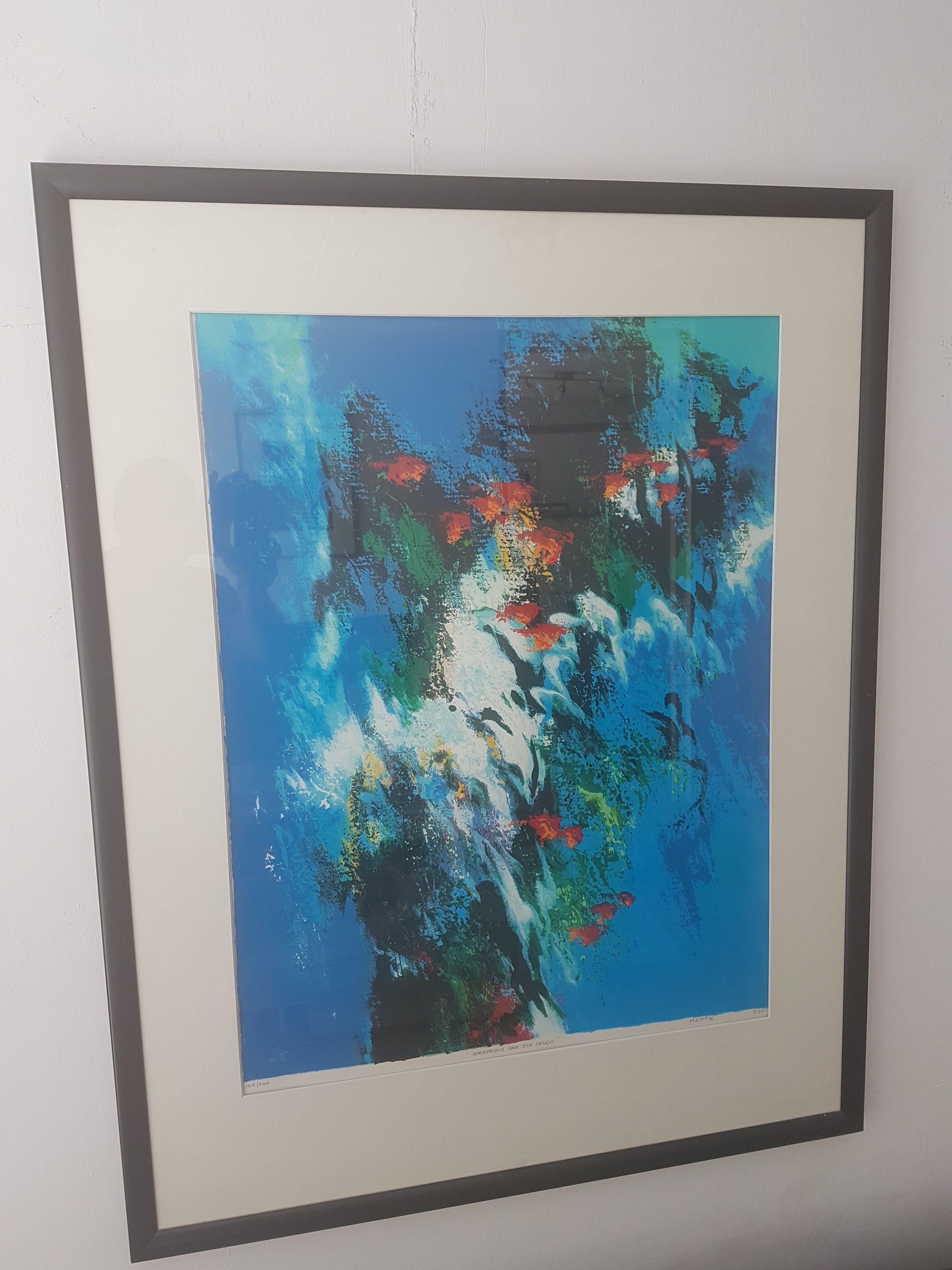 Grote zeefdruk maten 108x85 cm genummerd en gesigneerd in puntgave lijst .