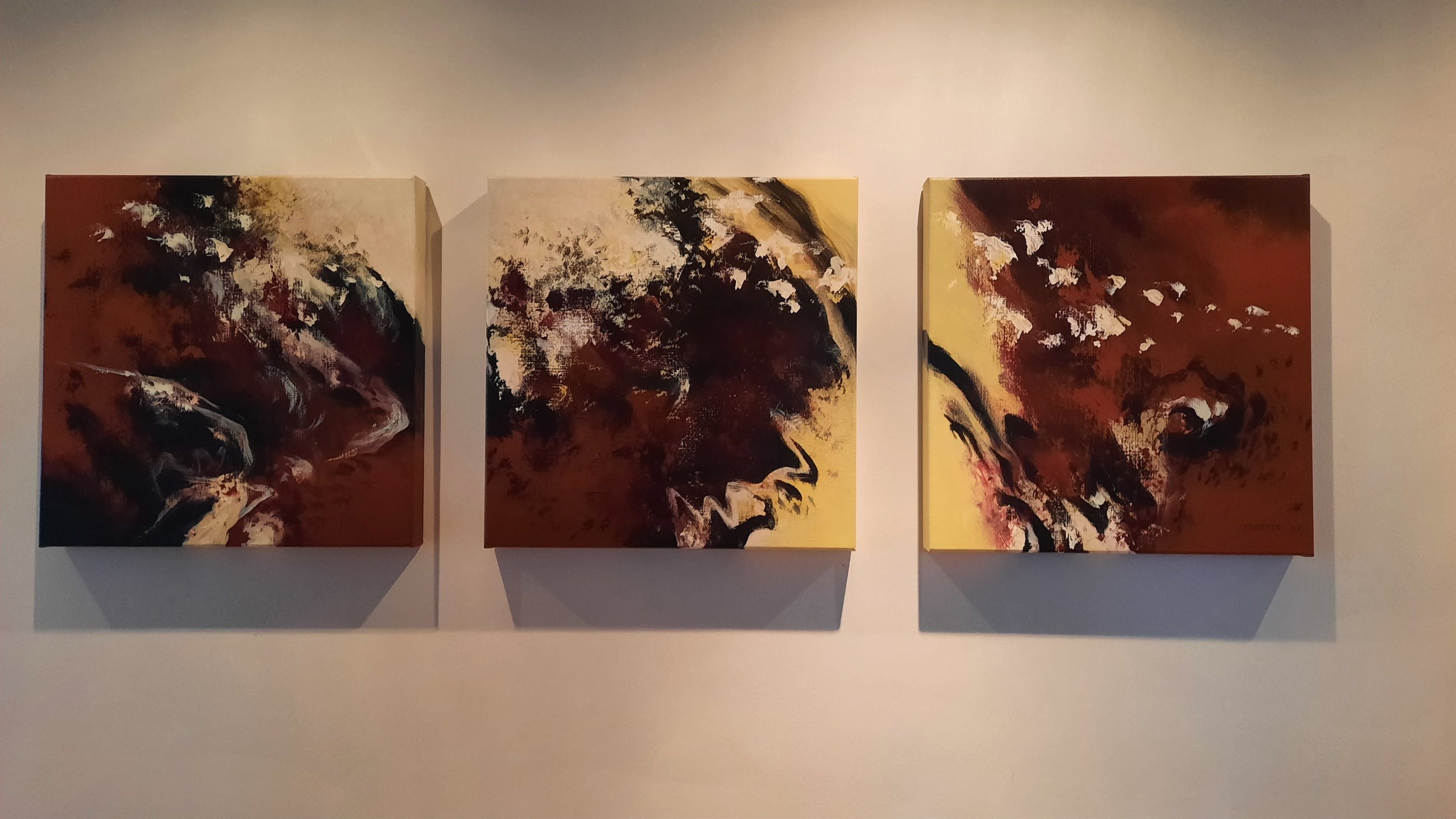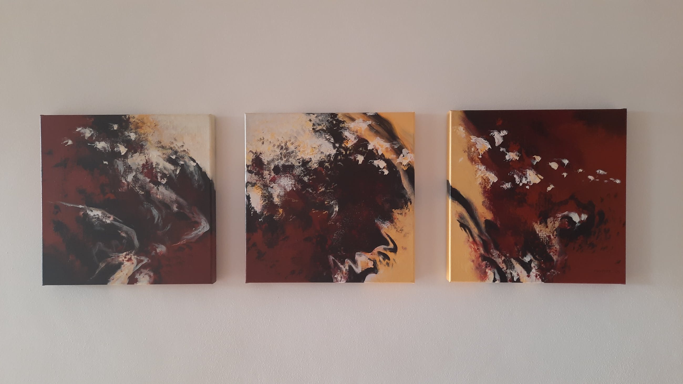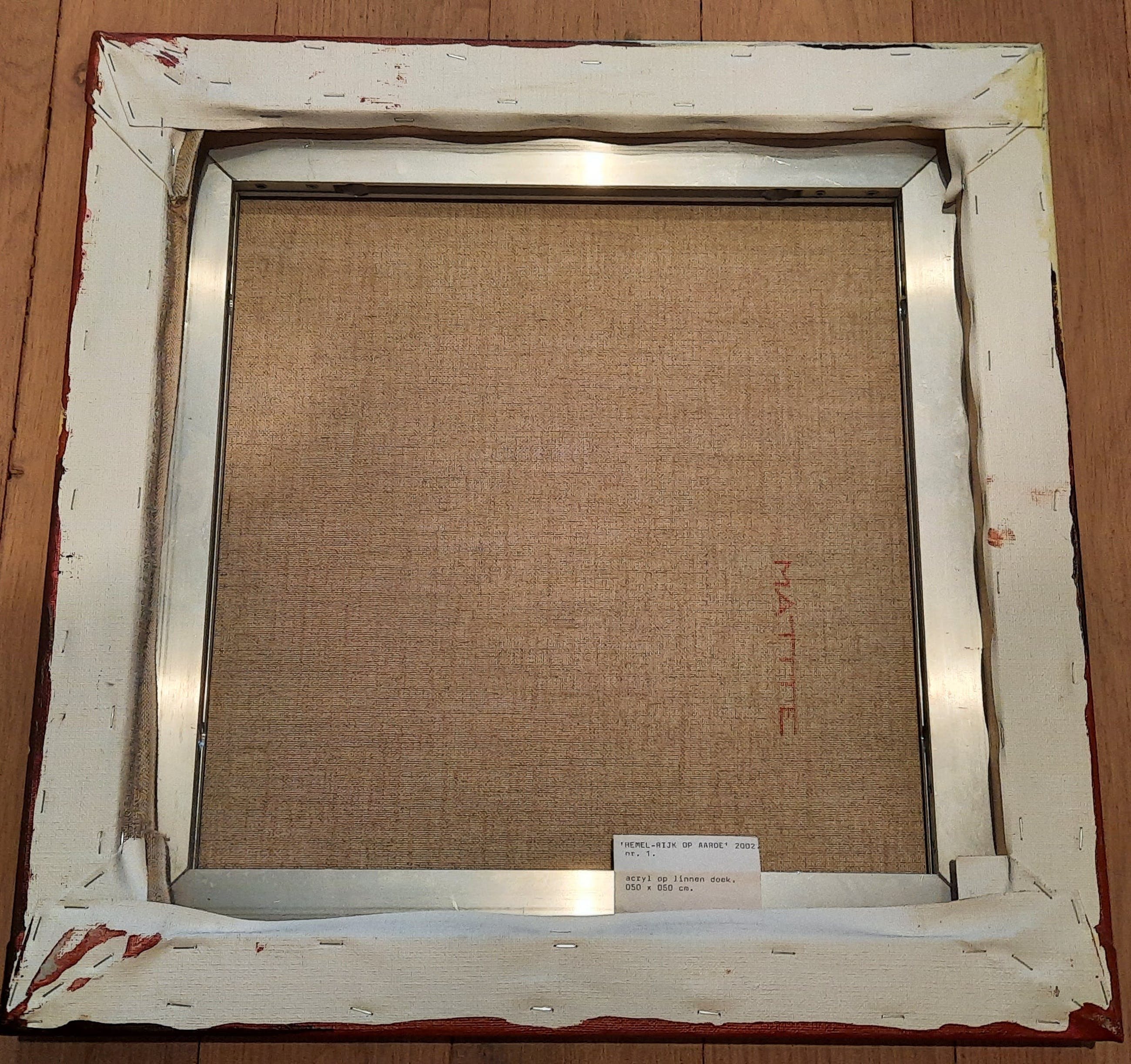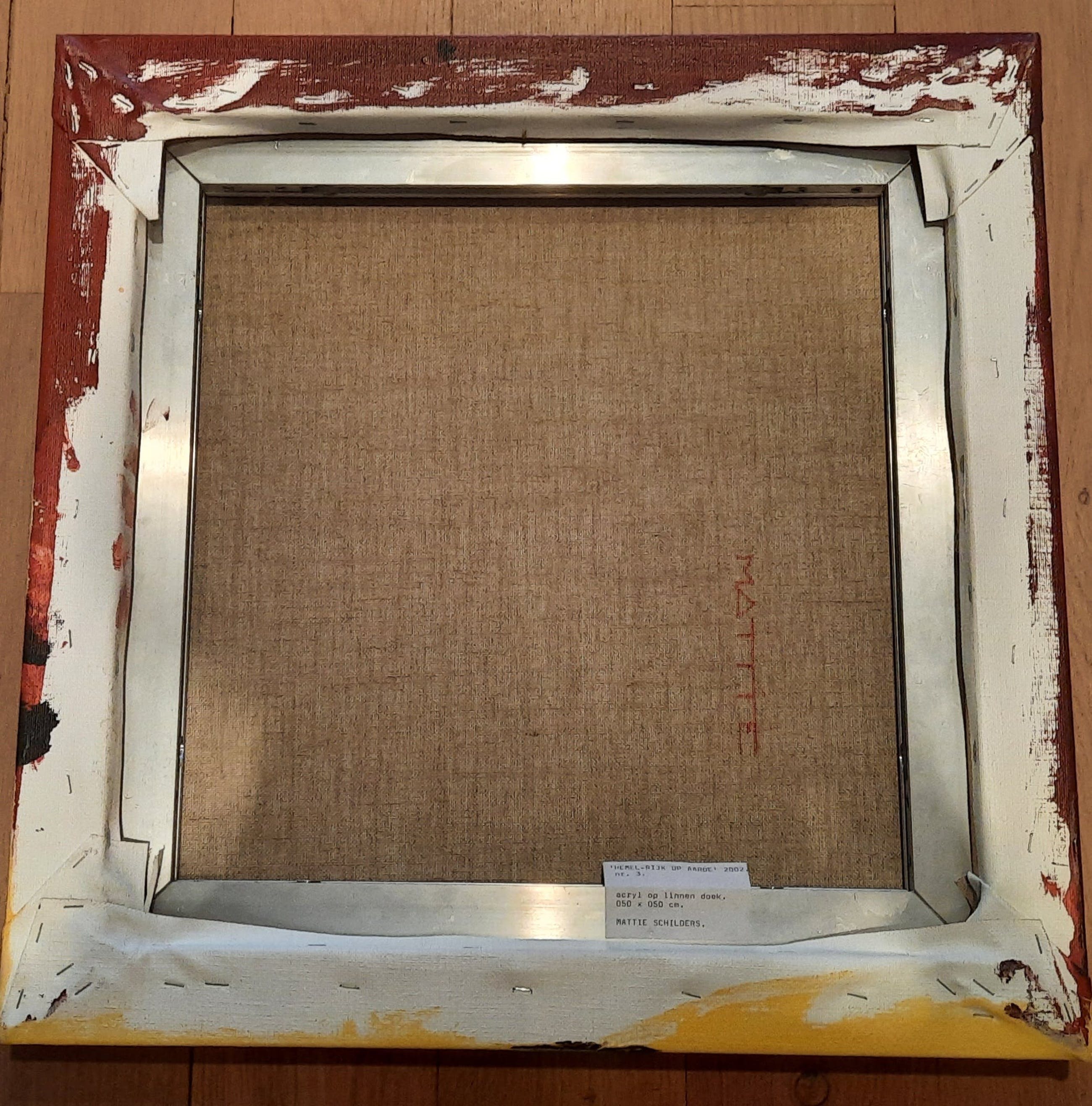 Drieluik (acryl op linnen doek, 3 x 50 x 50 cm). De doeken zijn hand gesigneerd en ingelijst op spieramen. Deze serie is in opdracht gemaakt in 2002 De conditie van de schilderijen is zeer goed Oorspronkelijke aankoopprijs 2268 euro.