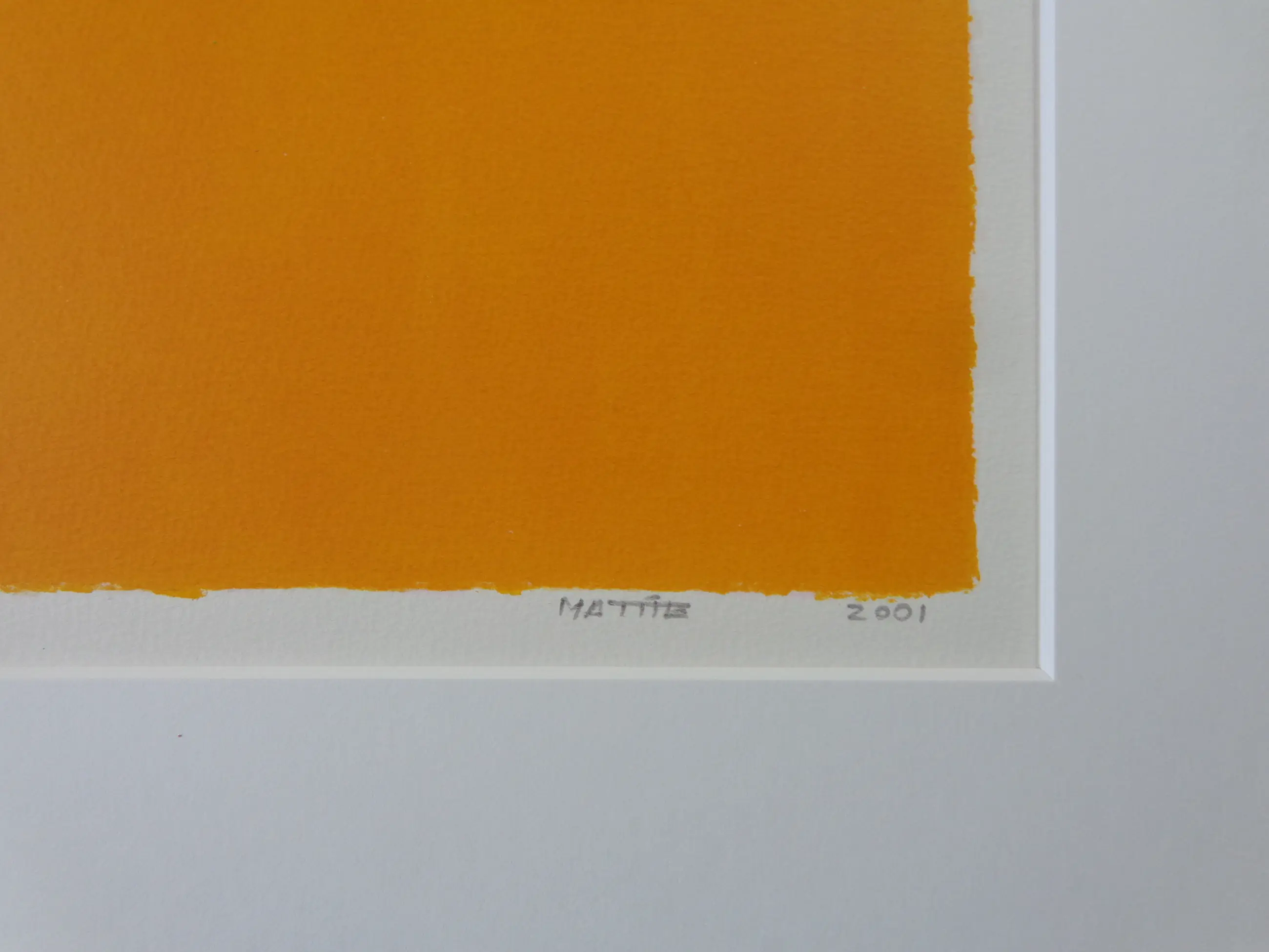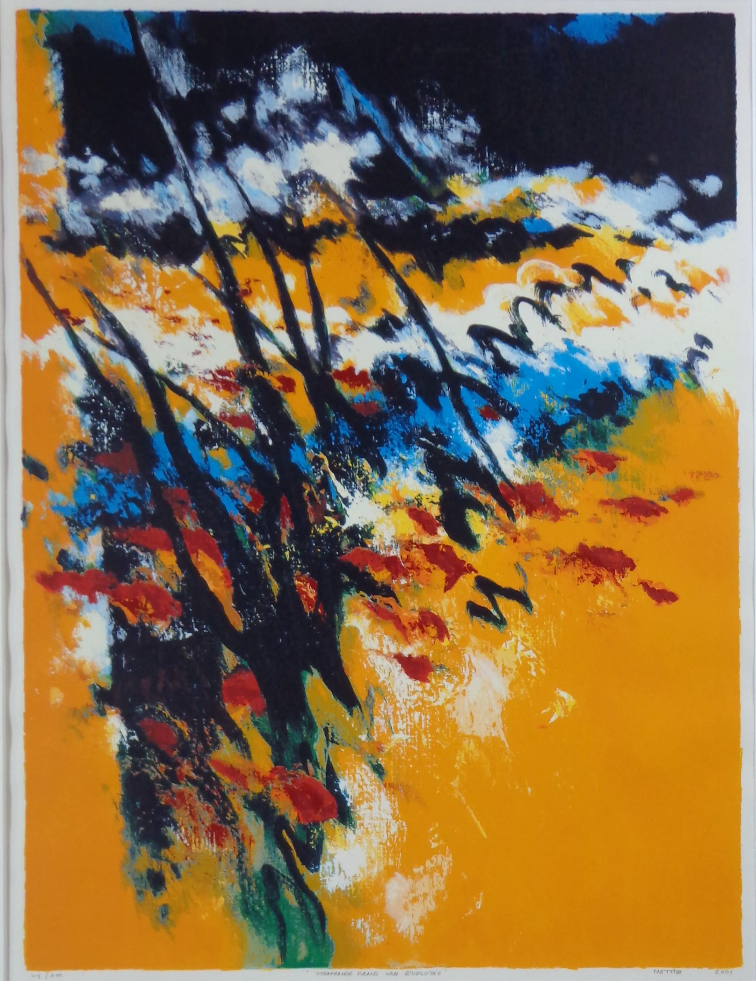 Mattie Schilders (°1951). Titel: "Vormende hand van evolutie". Kleurzeefdruk op papier. Gesigneerd met potlood. Ex.nr. 47/200. 2001. Verso etiket prijs 794 euro. Goede staat. Blad: 83x63cm. Kader: 113x88cm. Kader zonder glas.