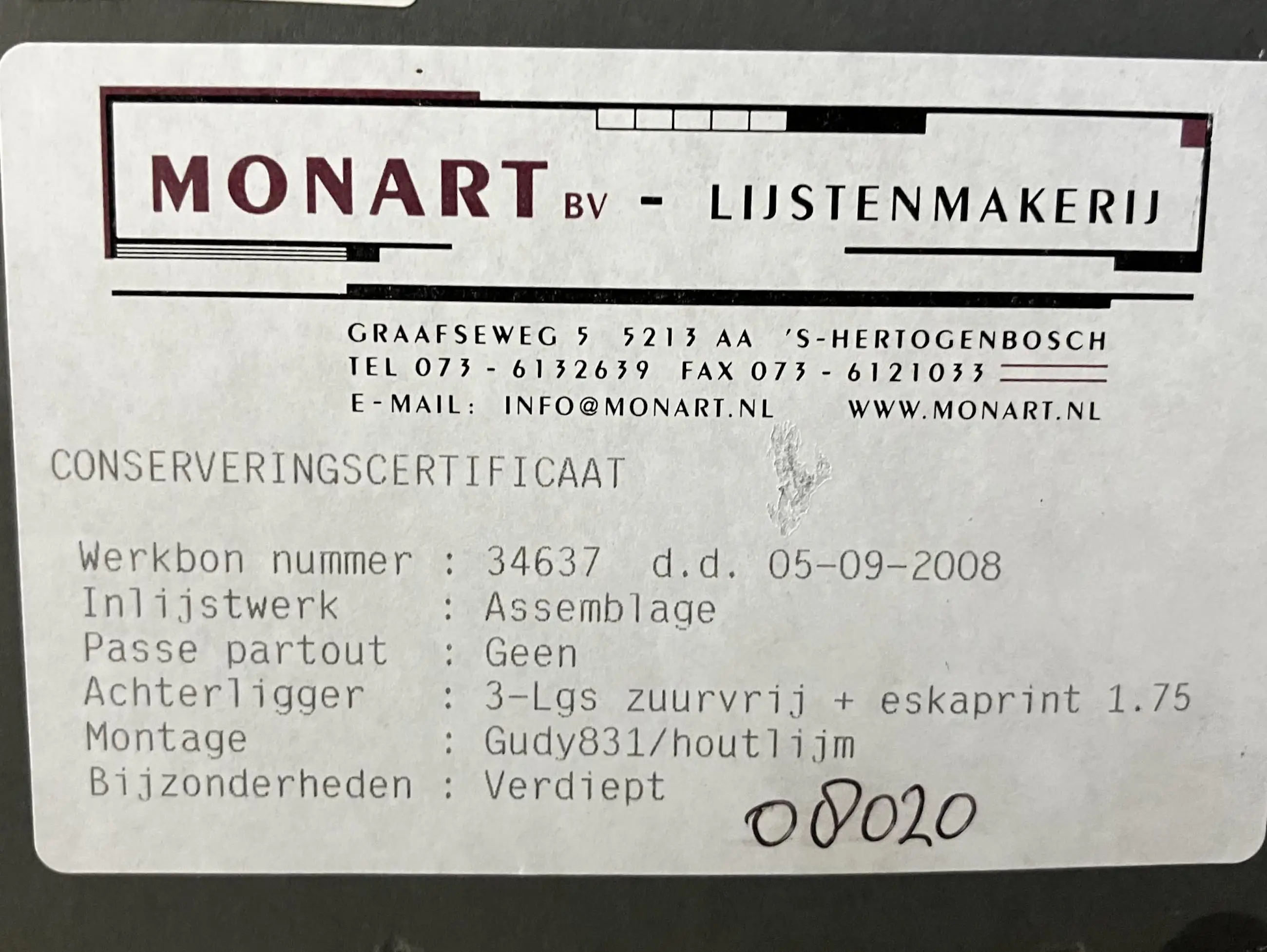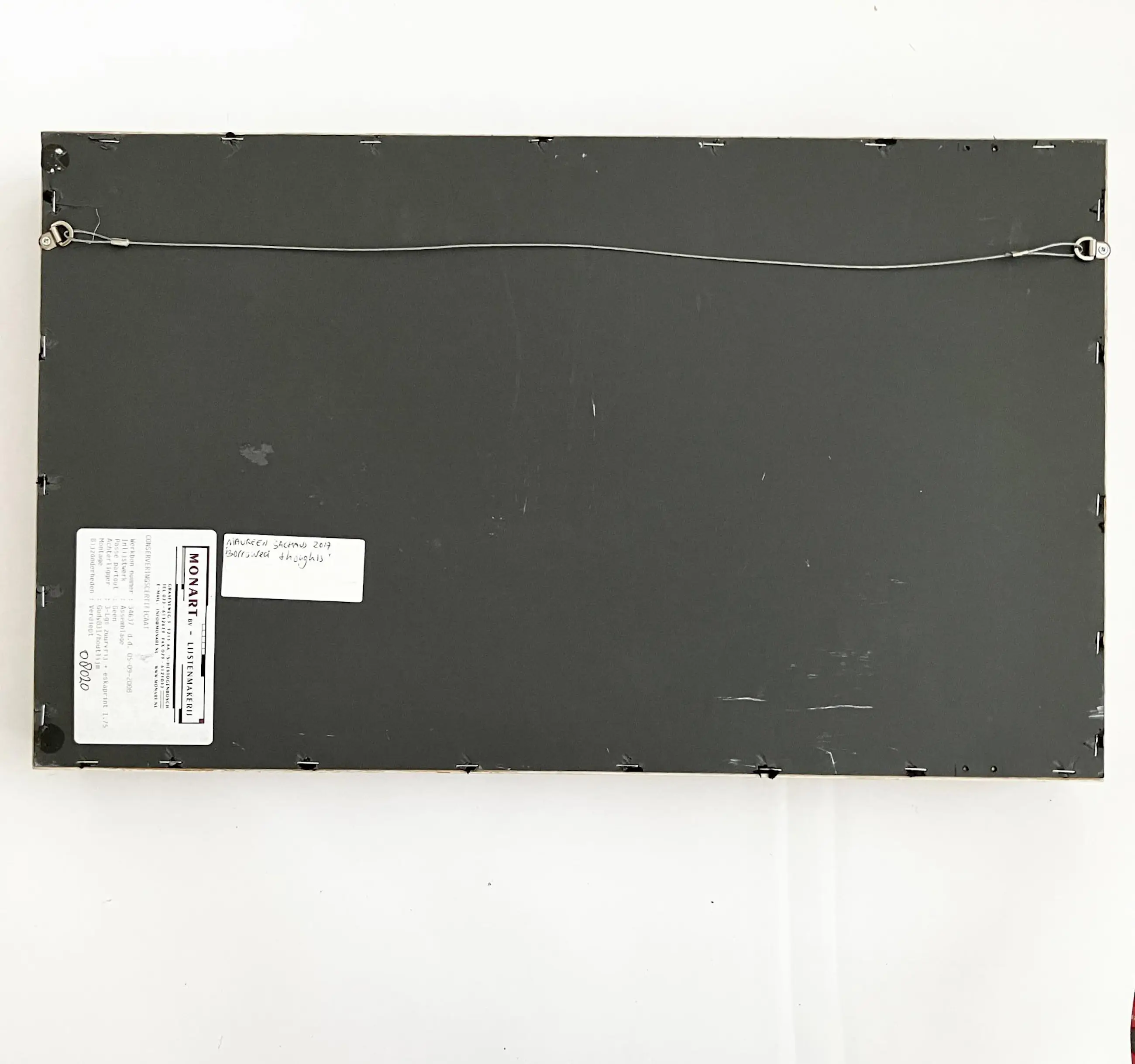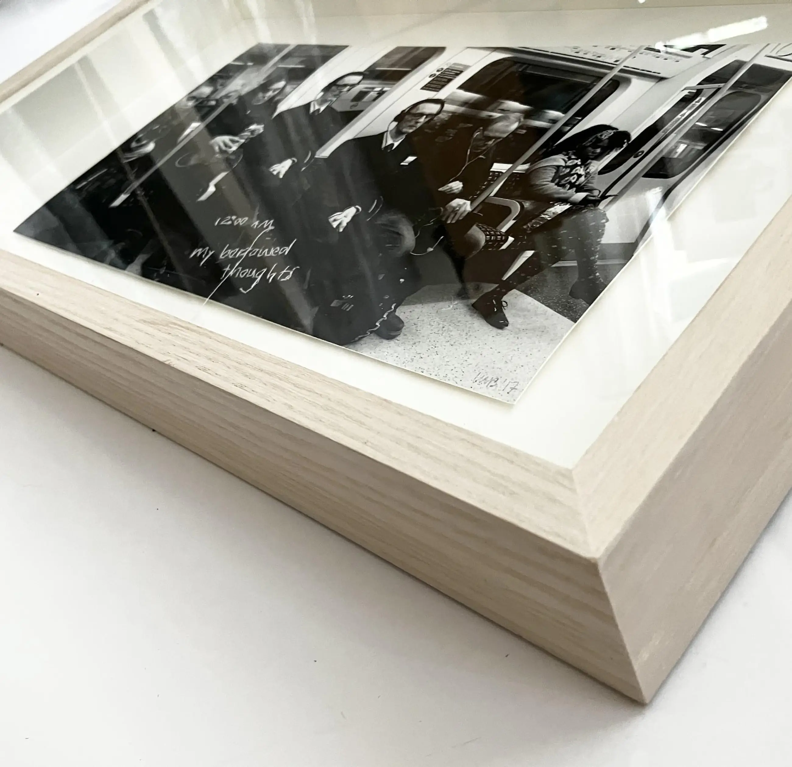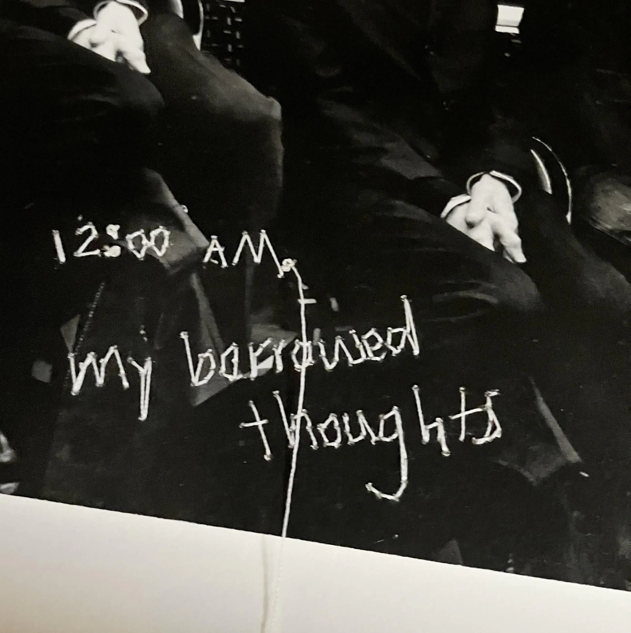 De foto is gedrukt op hoogwaardig Hahnemühle Fine Art-papier, wat de zwart-witcontrasten en de filmische sfeer versterkt. Op het oppervlak is met de hand de tekst "12:00 AM – my borrowed thoughts" geborduurd in witte draad — een poëtisch en tastbaar element. Deze handmatige toevoeging creëert een spanning tussen het digitale en het fysieke, het vluchtige en het blijvende. Het werk is professioneel ingelijst in een hoogwaardige witte lijst met glas ervoor, inclusief conserveringscertificaat, zodat het zowel inhoudelijk als materieel duurzaam bewaard blijft.