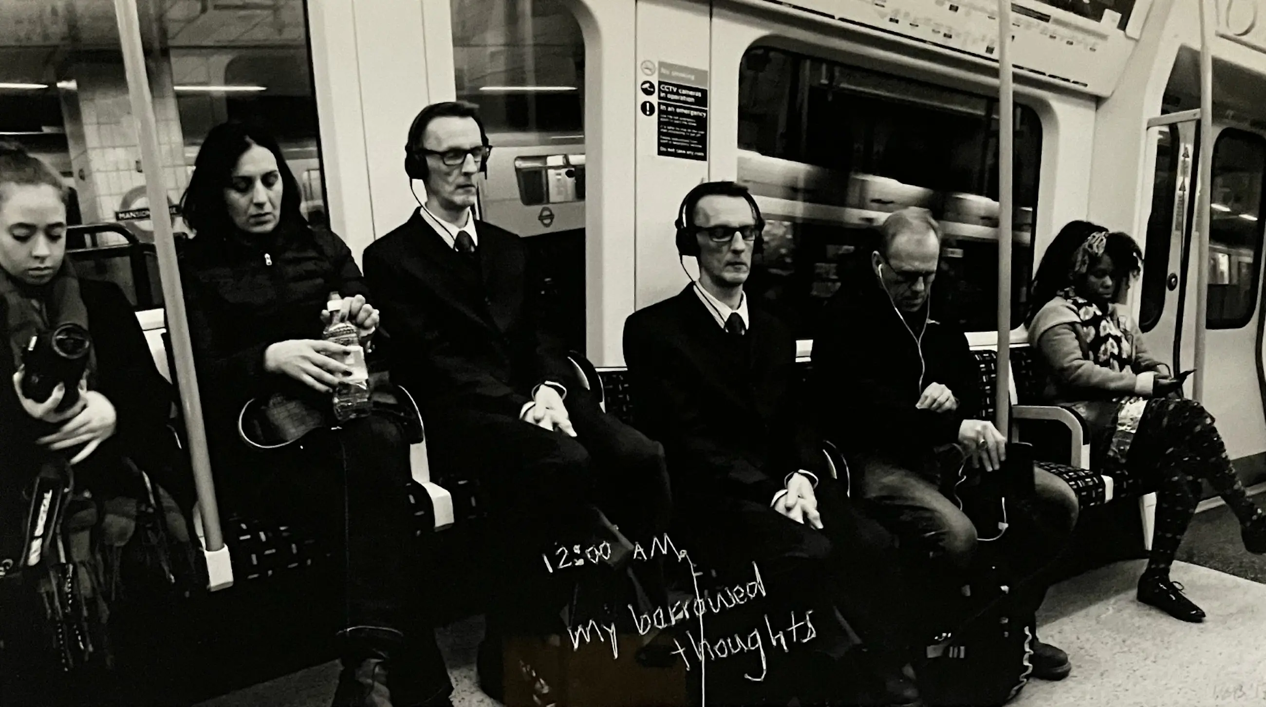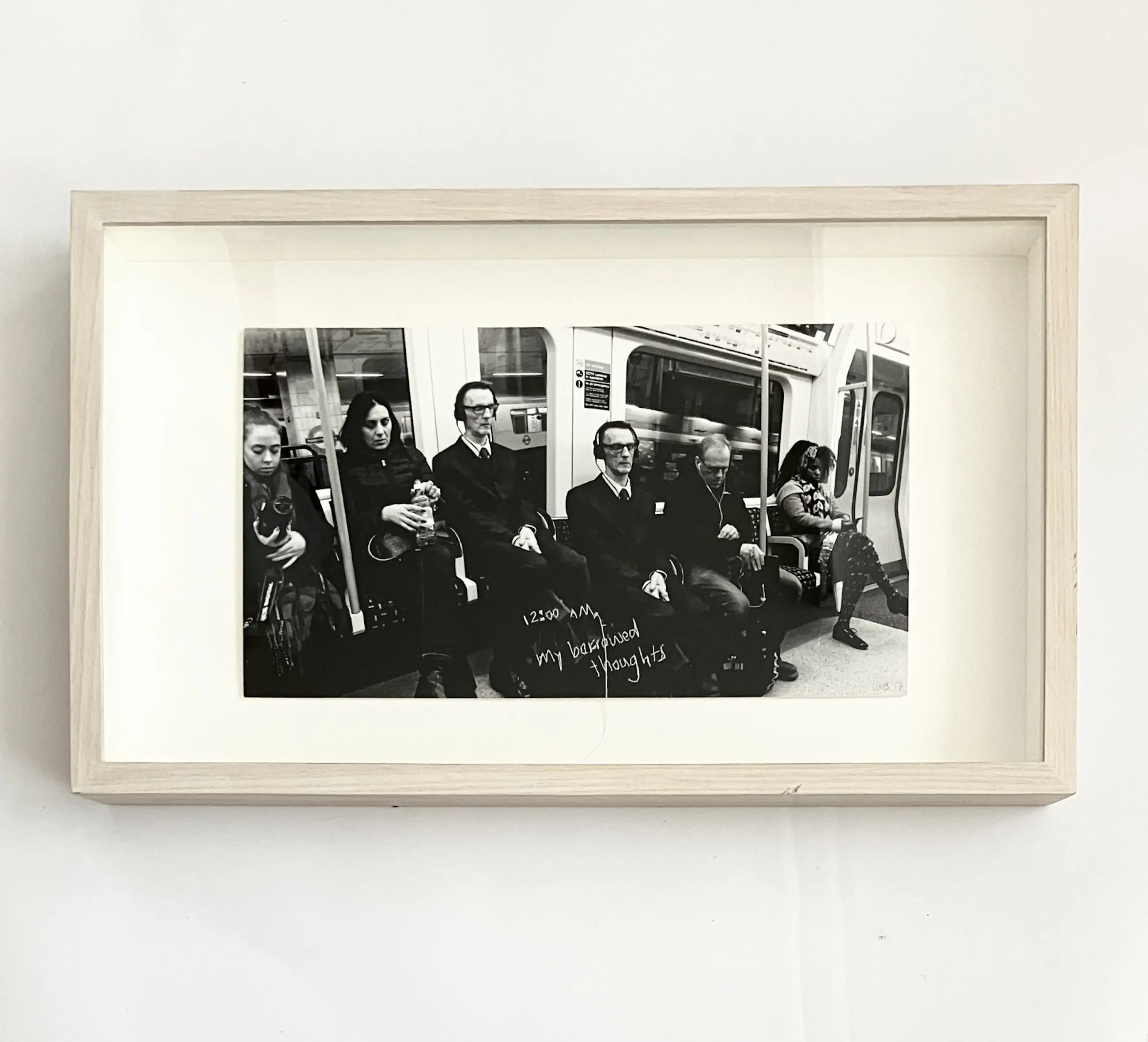 Dit werk is gefotografeerd in de Londense metro, een plek waar anonimiteit en verstilling samenkomen in het publieke domein. De scène toont reizigers die ieder verzonken zijn in hun eigen wereld, verbonden door routine maar gescheiden door gedachten. Te midden van hen is één persoon herhaaldelijk aanwezig — een subtiele visuele verstoring die verwijst naar herhalende gedachten. Het werk roept vragen op over identiteit, individualiteit en het collectieve bewustzijn in een wereld die altijd in beweging is.