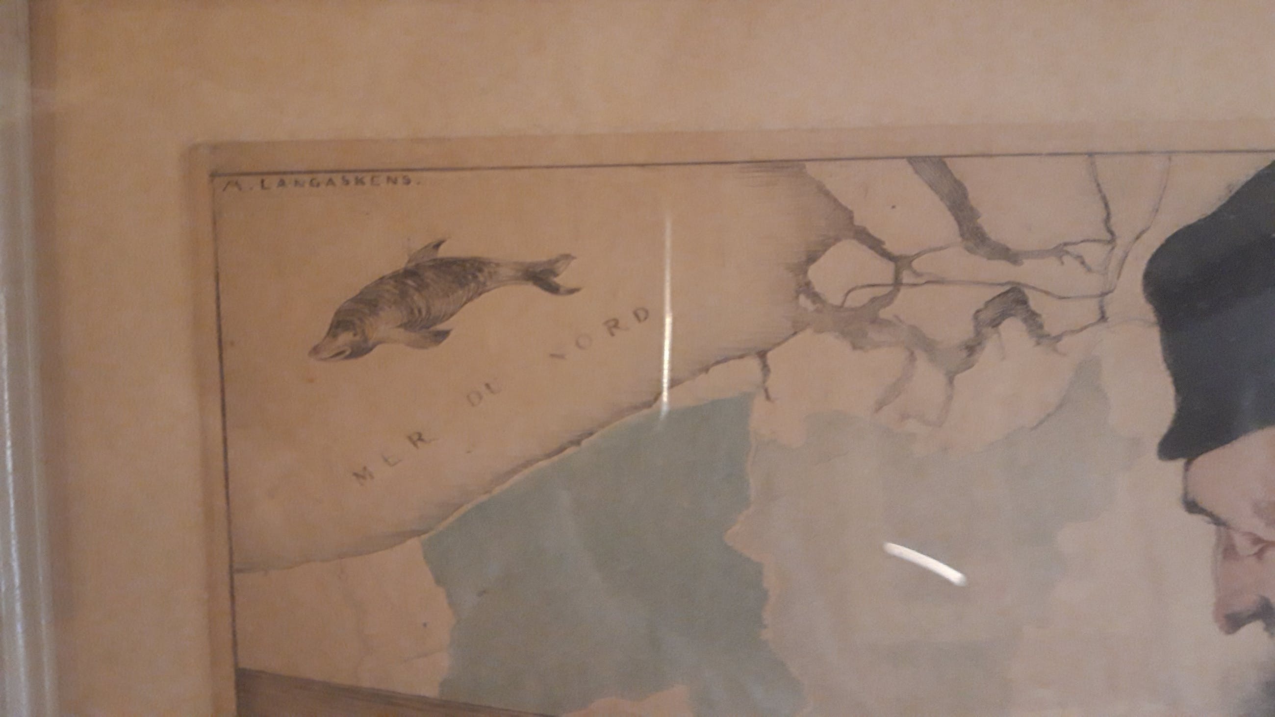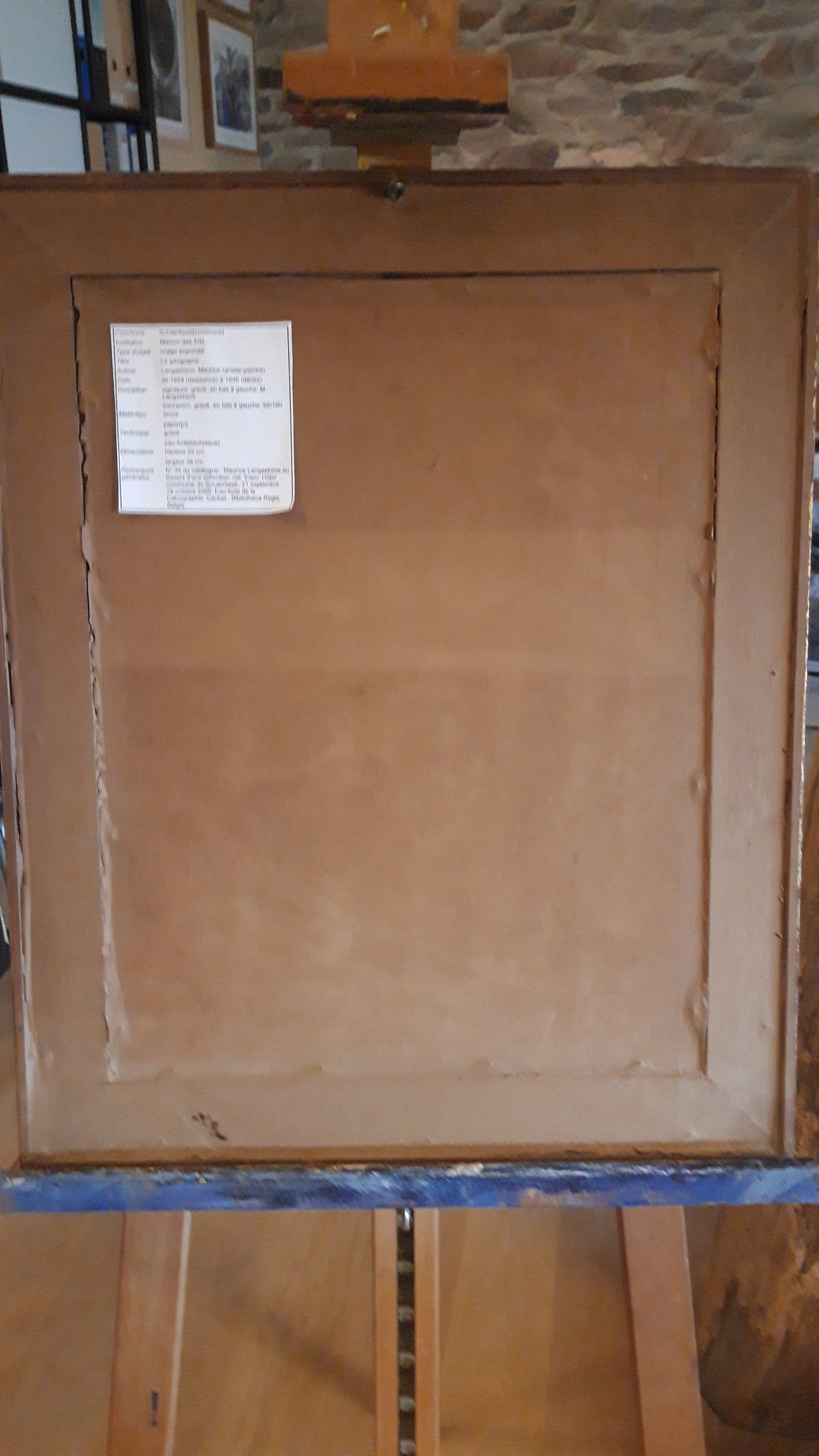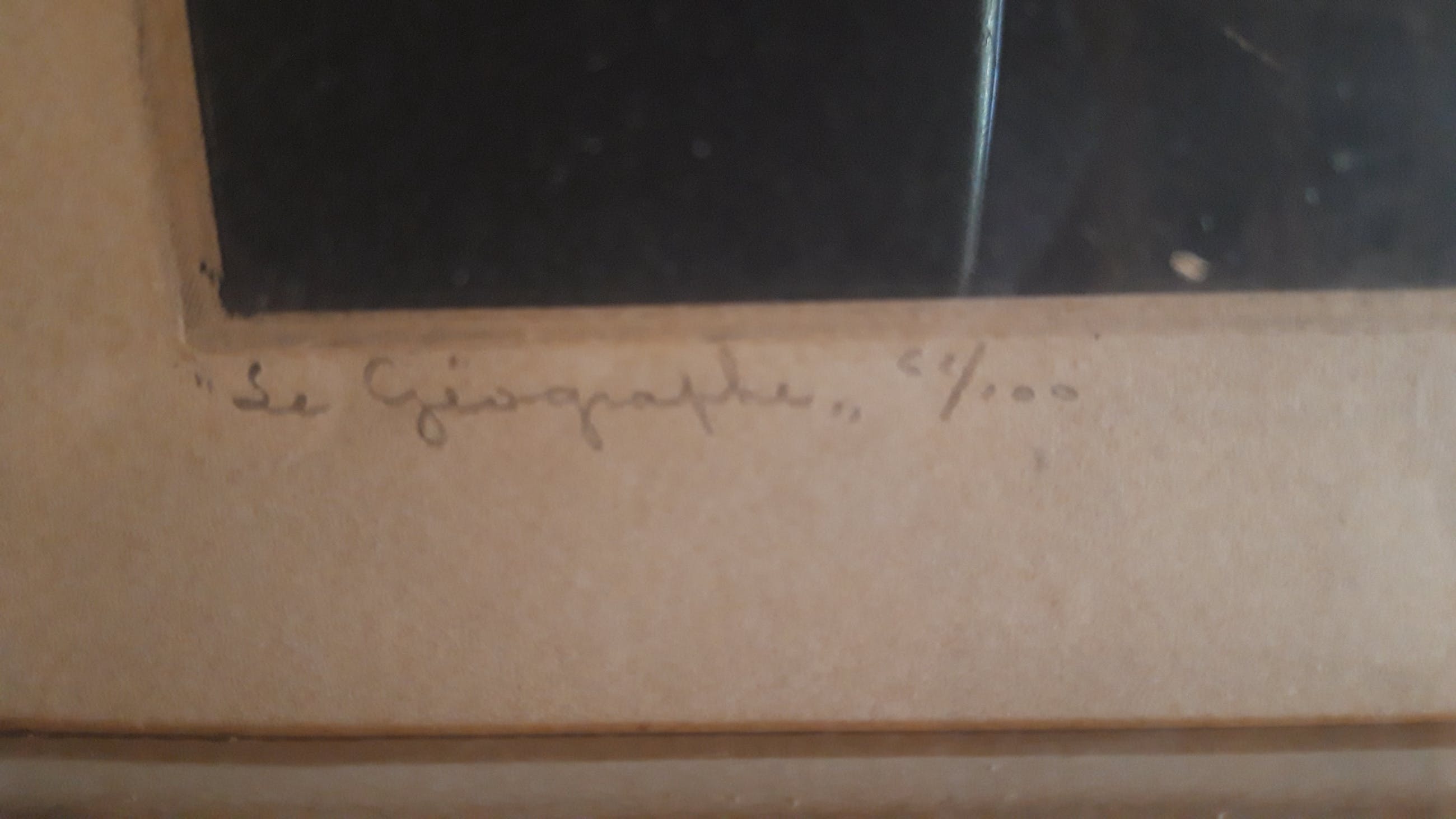 Le Géographe" ( de geograaf), exemplaar nr 61/100. Stelt een mooie prent van een geograaf naast zijn wereldbol en met op het achtergrond, een kaart van beide provincies Oost- en West Vlaanderen in België, en de noordzee. De kaart op het achtergrond is ook getekend Langaskens !