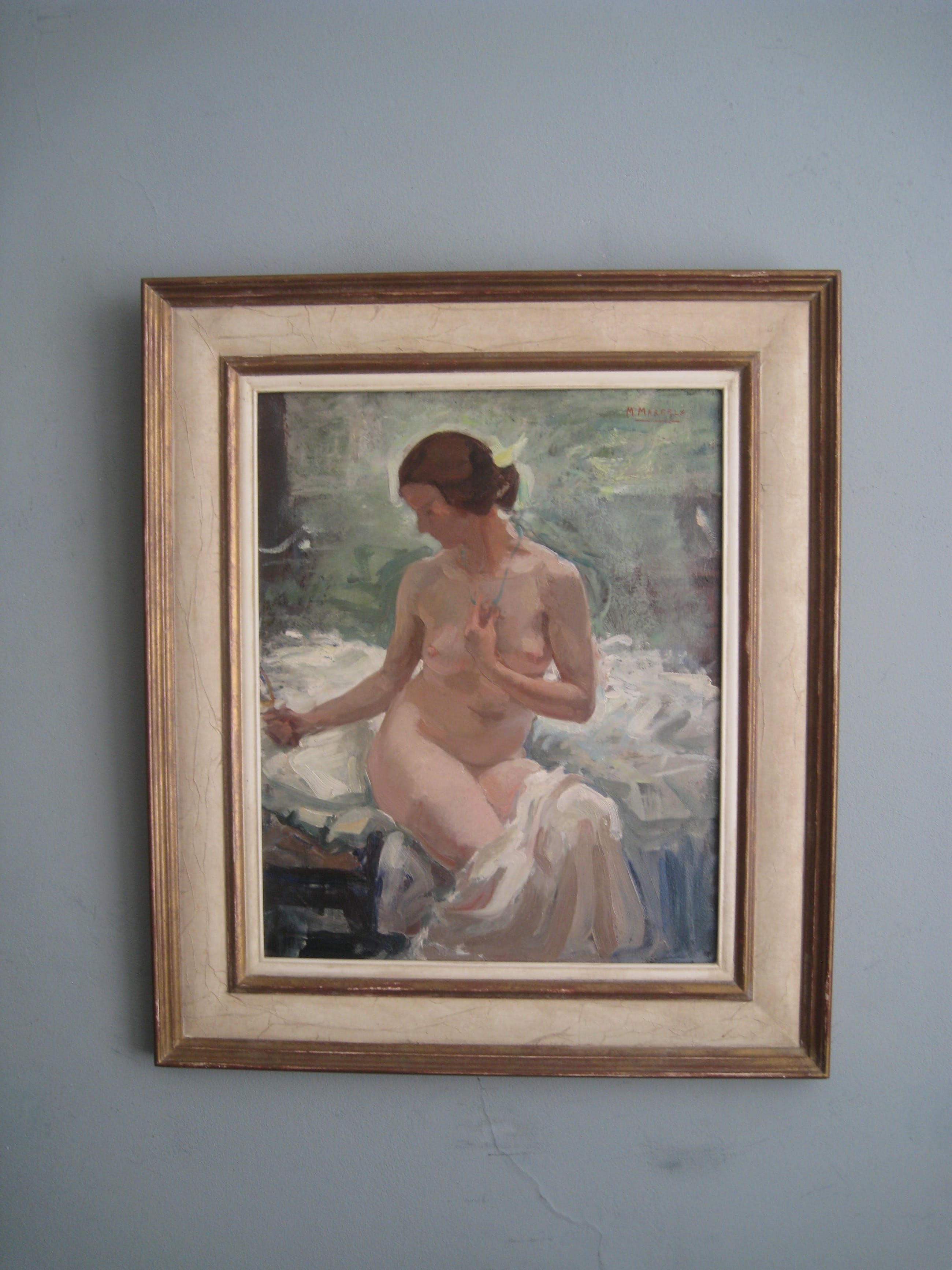 Intieme boudoir-scéne meesterlijk weergegeven door de belgische kunstenaar Maurice Mareels. r.b. in rood gesigneerd. Direct geschilderd op houten paneel in fraaie lijst . verso annotatie in de franse taal met de datum 1937. In perfecte staat en bij mij in Amsterdam-met goedvinden van kunstveiling nl.- te zien.