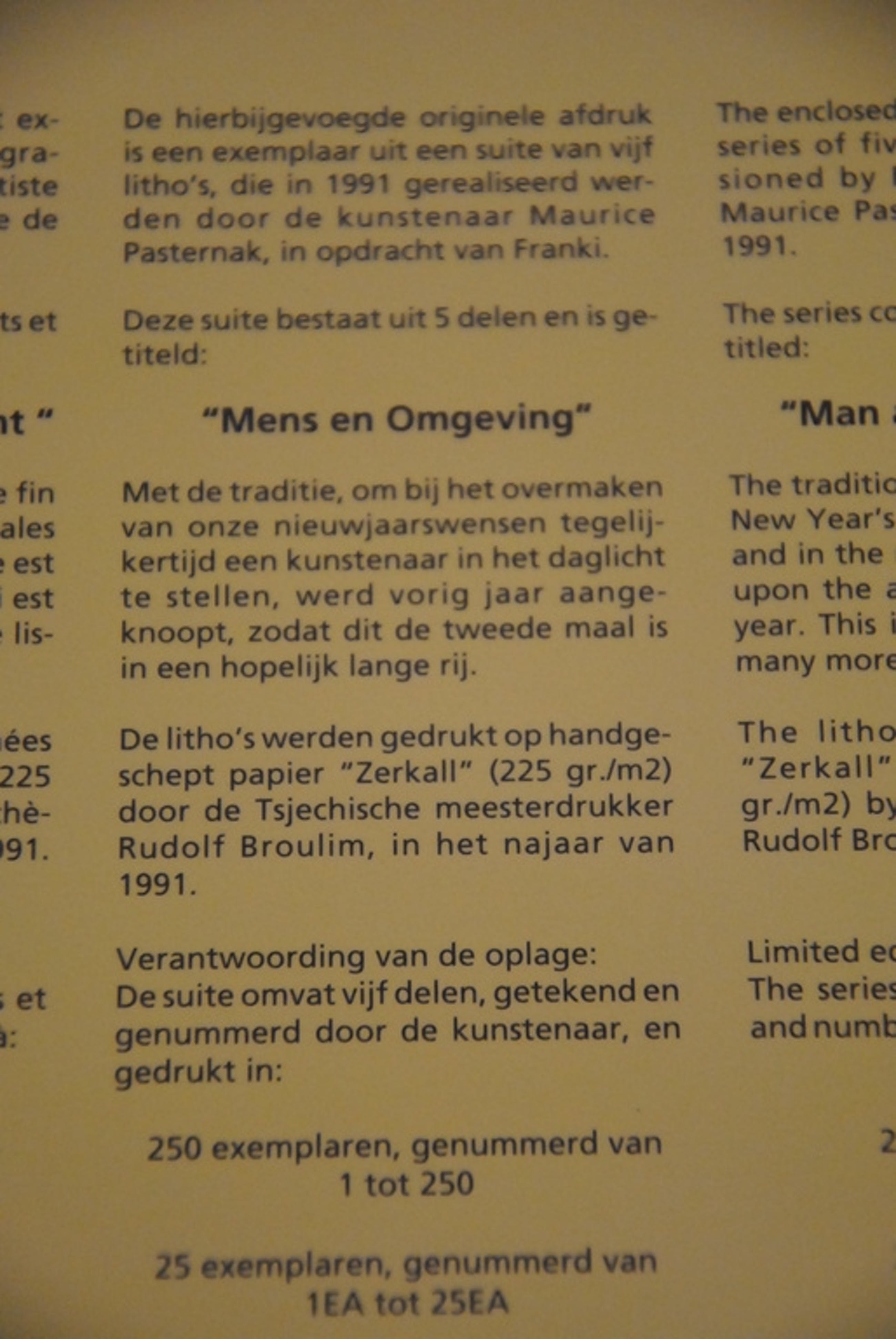 Het betreft de originele afdruk van een litho op A4-formaat, gerealiseerd door Maurice Pasternak in 1991. Het is een exemplaar uit een suite van 5 delen, getiteld “Mens en Omgeving”. Het is getekend en genummerd door de kunstenaar. Het draagt nr. 186/250. Niet ingelijst.