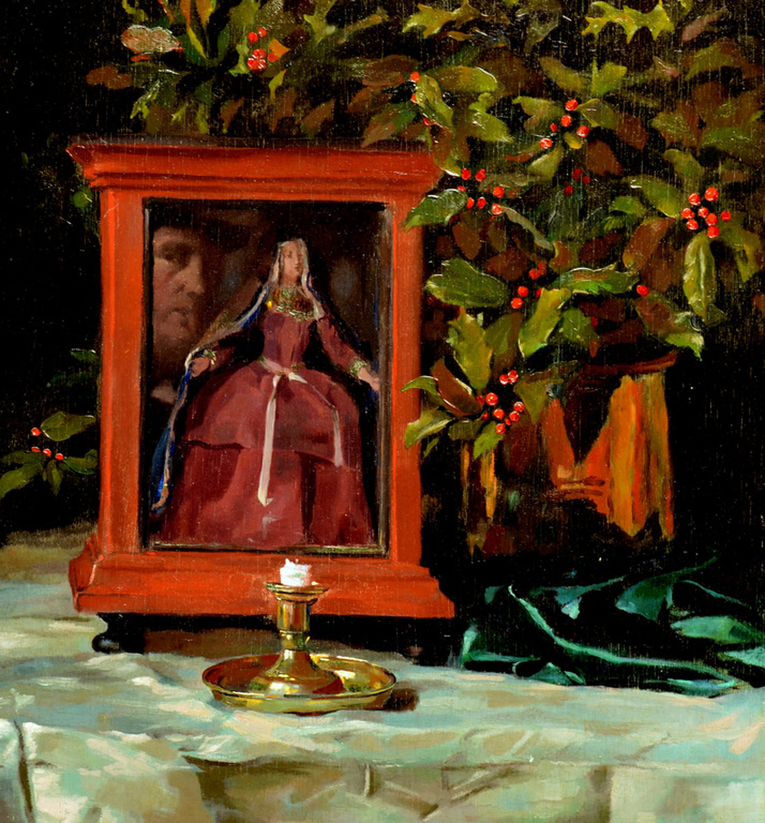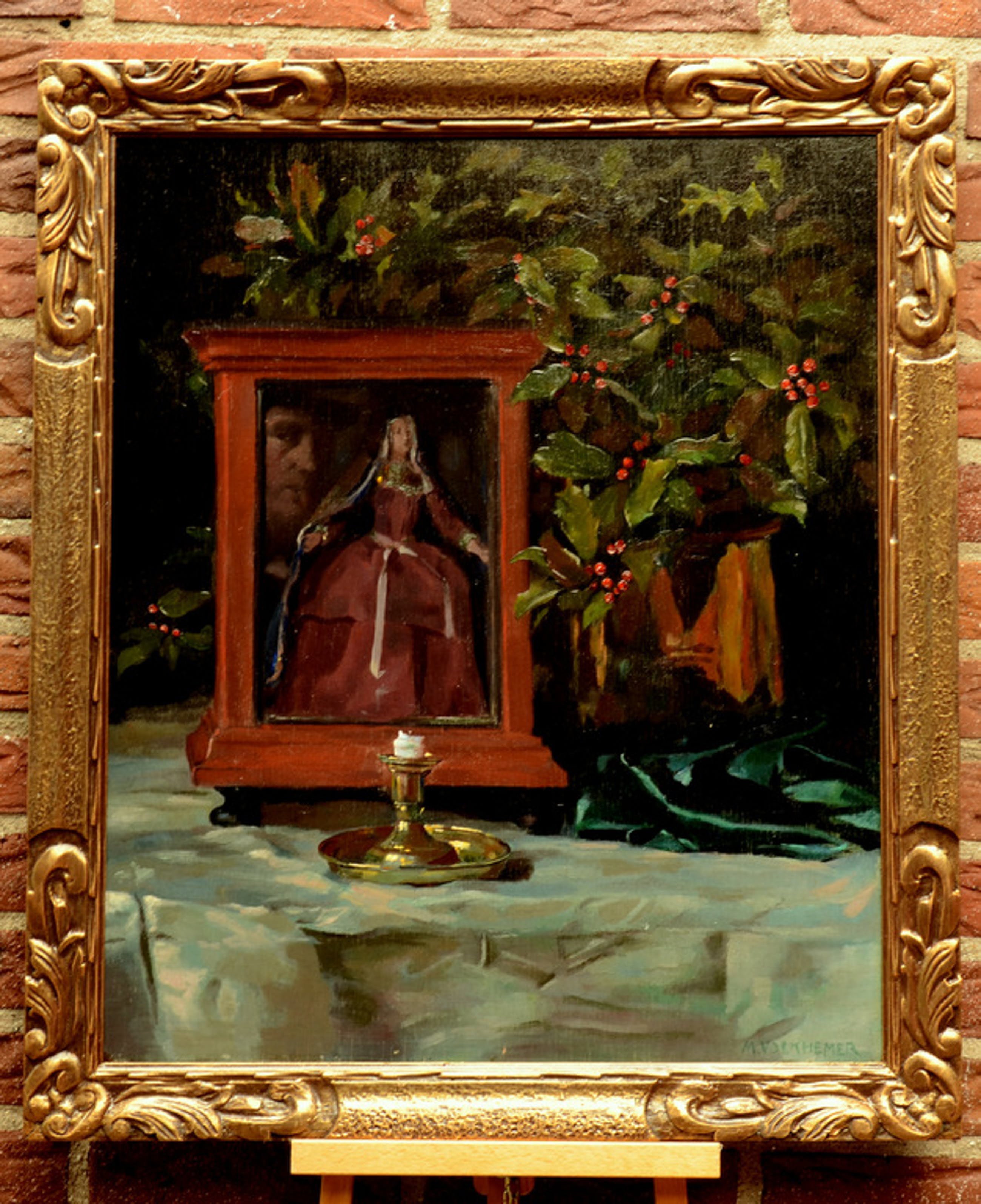 Indrukwekkend stilleven op paneel, mooi en krachtig geschilderd, zie mans portret naast madonna beeldje.