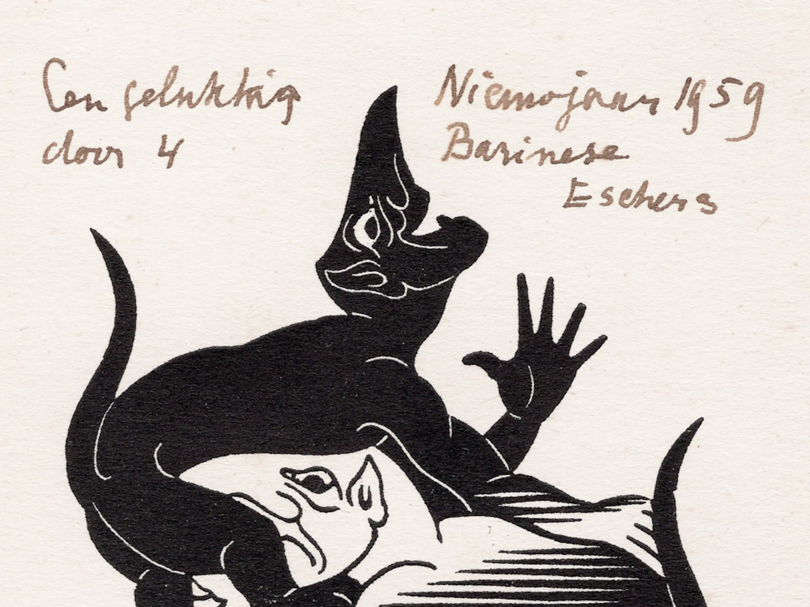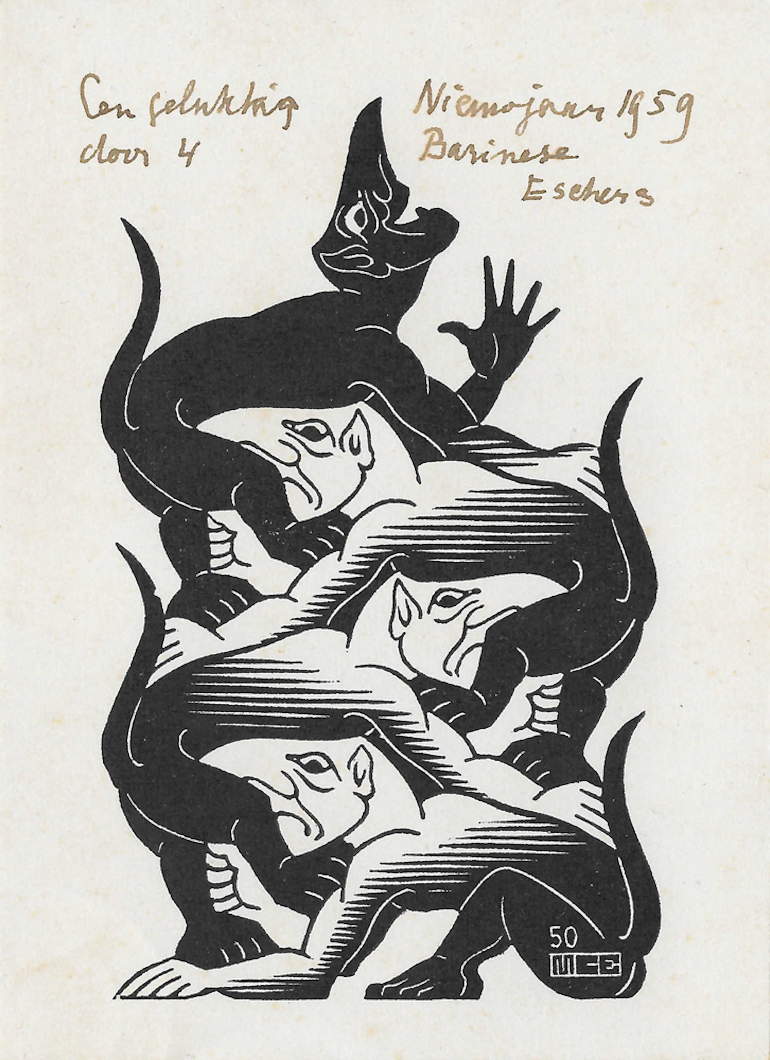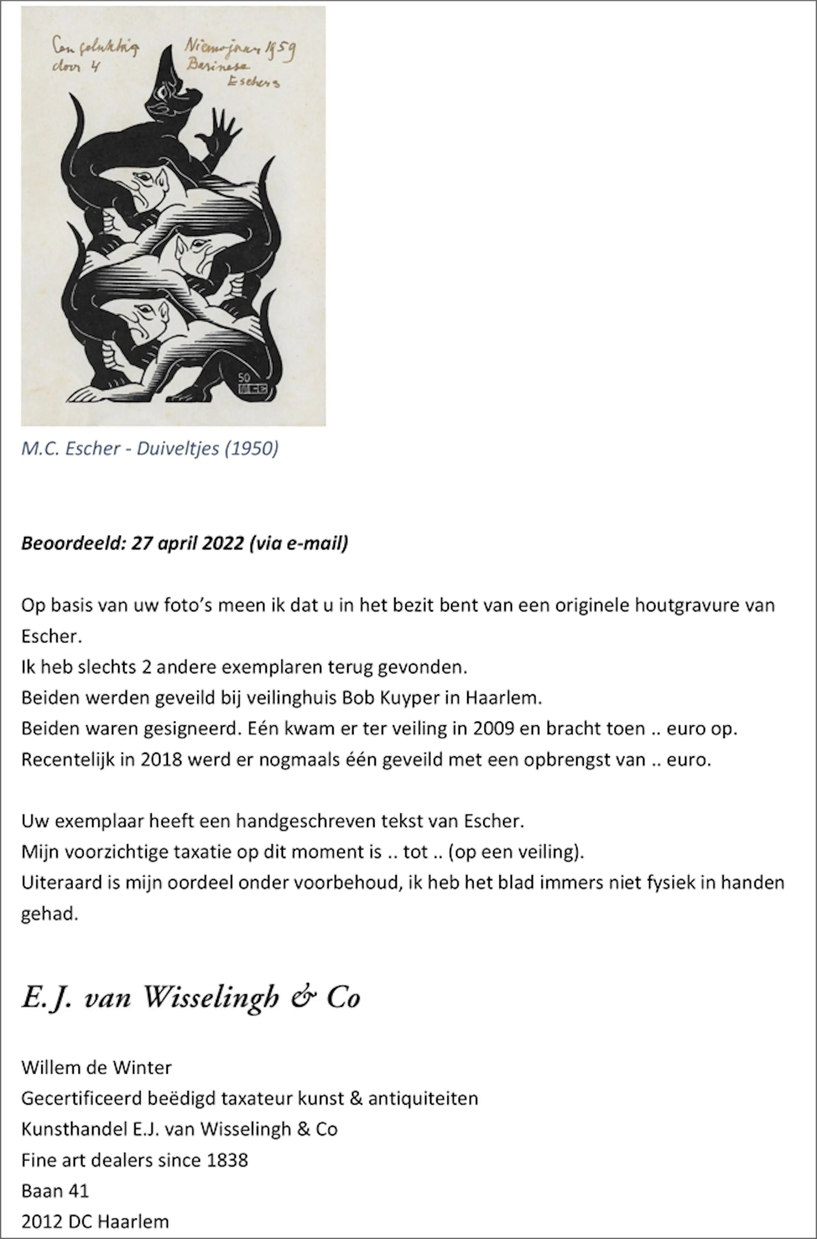 Houtgravure uit 1950 van M.C. Escher getiteld ‘Duiveltjes’. Dit exemplaar is een Nieuwjaarswens voor 1959, waarschijnlijk aan zijn vriend / collega-kunstenaar Hans van Dokkum, (dit werk zat in een collectie van Nieuwjaarswensen van Hans van Dokkum). Het heeft een handgeschreven tekst van Escher: ‘Een gelukkig Nieuwjaar 1959 door 4 Barinese Eschers’. Waarschijnlijk heeft Escher de figuren die hij voor dit werk heeft gebruikt in Bari (Italië) gezien, (Escher heeft een tijd in Italië gewoond en reisde ook veel door dit land). Deze gravure is rechtsonder druk gesigneerd met MCE. Dit werk is beoordeeld door Willem de Winter (eigenaar van kunsthandel E.J. van Wisselingh & Co), zie bijgevoegde foto.