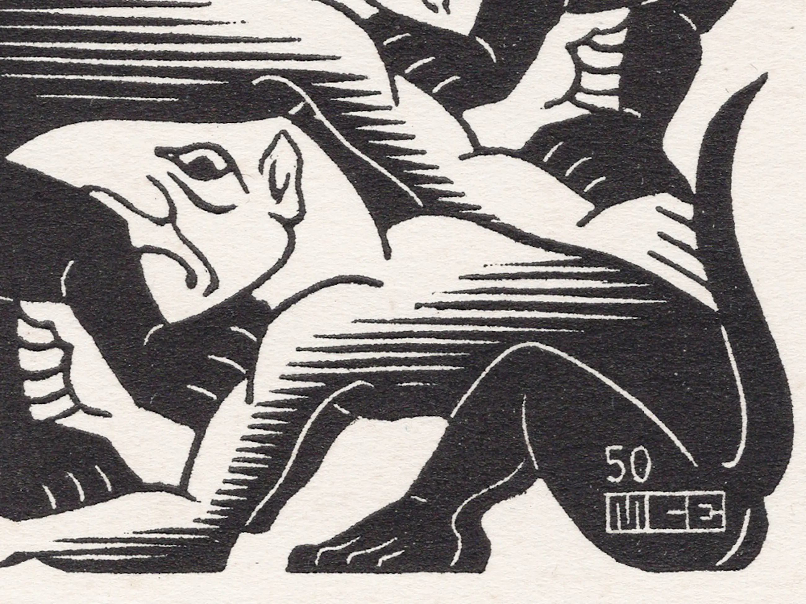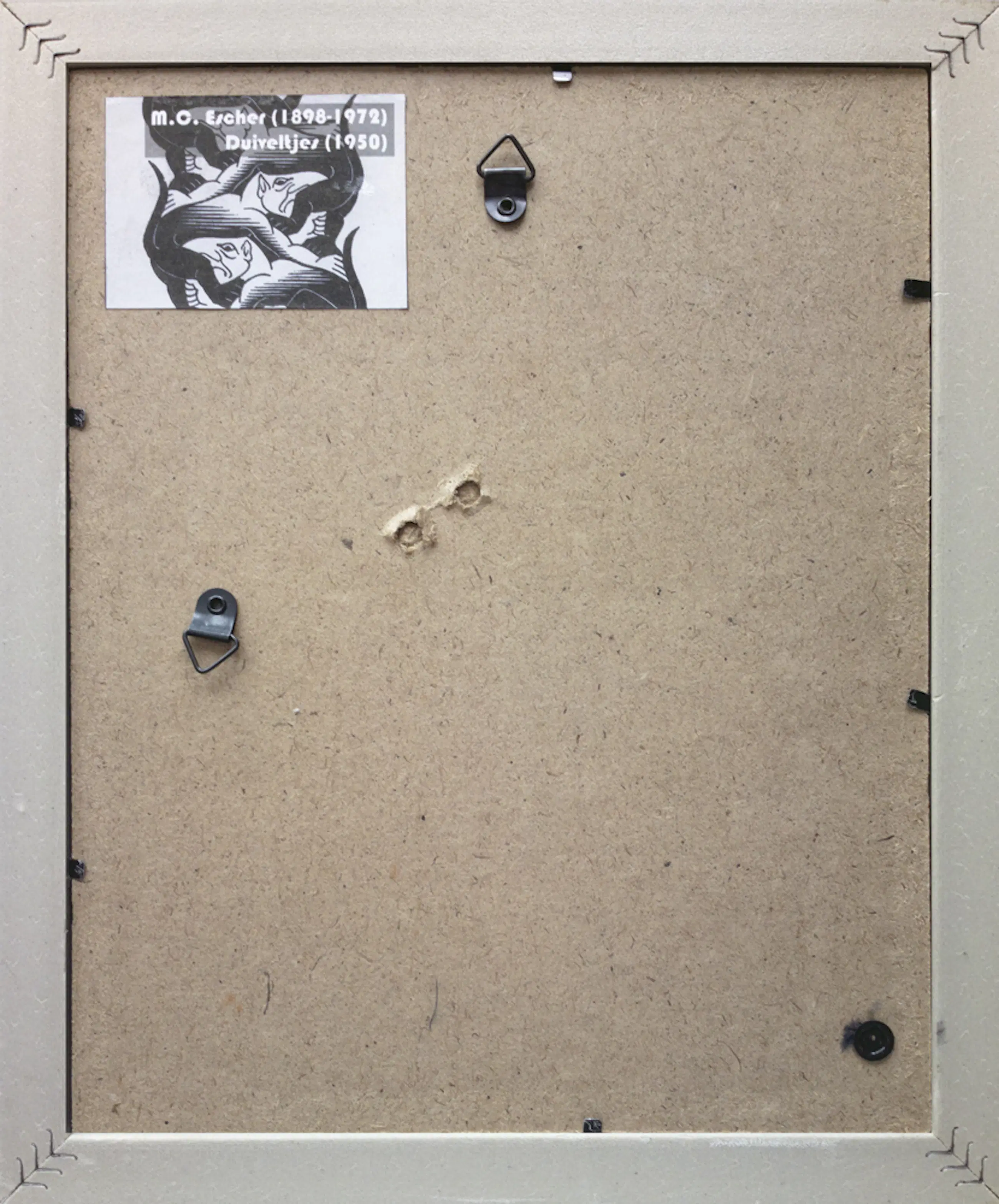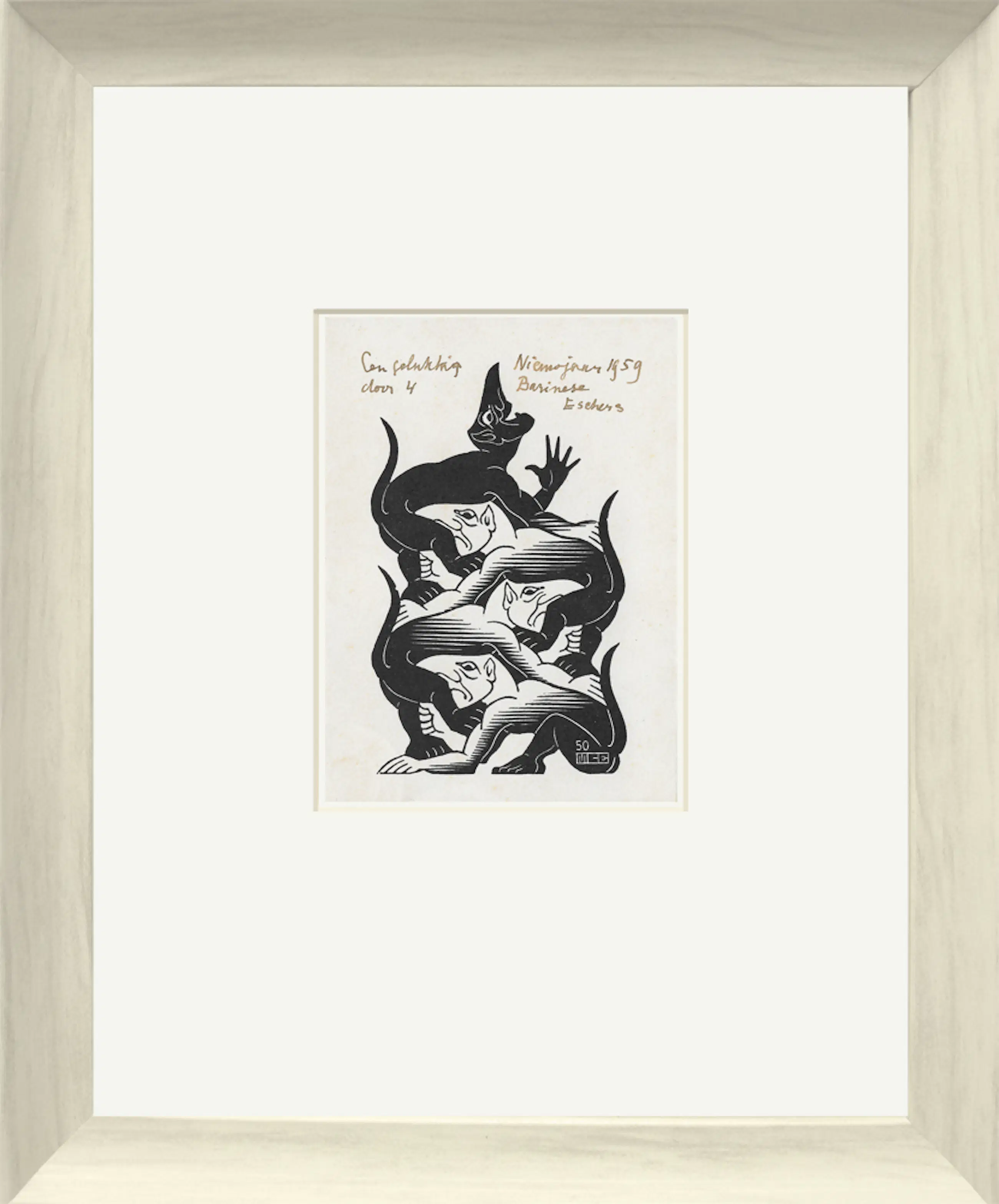 Houtgravure uit 1950 van M.C. Escher getiteld ‘Duiveltjes’. Dit exemplaar is een Nieuwjaarswens voor 1959, waarschijnlijk aan zijn vriend / collega-kunstenaar Hans van Dokkum, (dit werk zat in een collectie van Nieuwjaarswensen van Hans van Dokkum). Het heeft een handgeschreven tekst van Escher: ‘Een gelukkig Nieuwjaar 1959 door 4 Barinese Eschers’. Waarschijnlijk heeft Escher de figuren die hij voor dit werk heeft gebruikt in Bari (Italië) gezien, (Escher heeft een tijd in Italië gewoond en reisde ook veel door dit land). Deze gravure is rechtsonder druk gesigneerd met MCE. Dit werk is beoordeeld door Willem de Winter (eigenaar van kunsthandel E.J. van Wisselingh & Co), zie bijgevoegde foto.