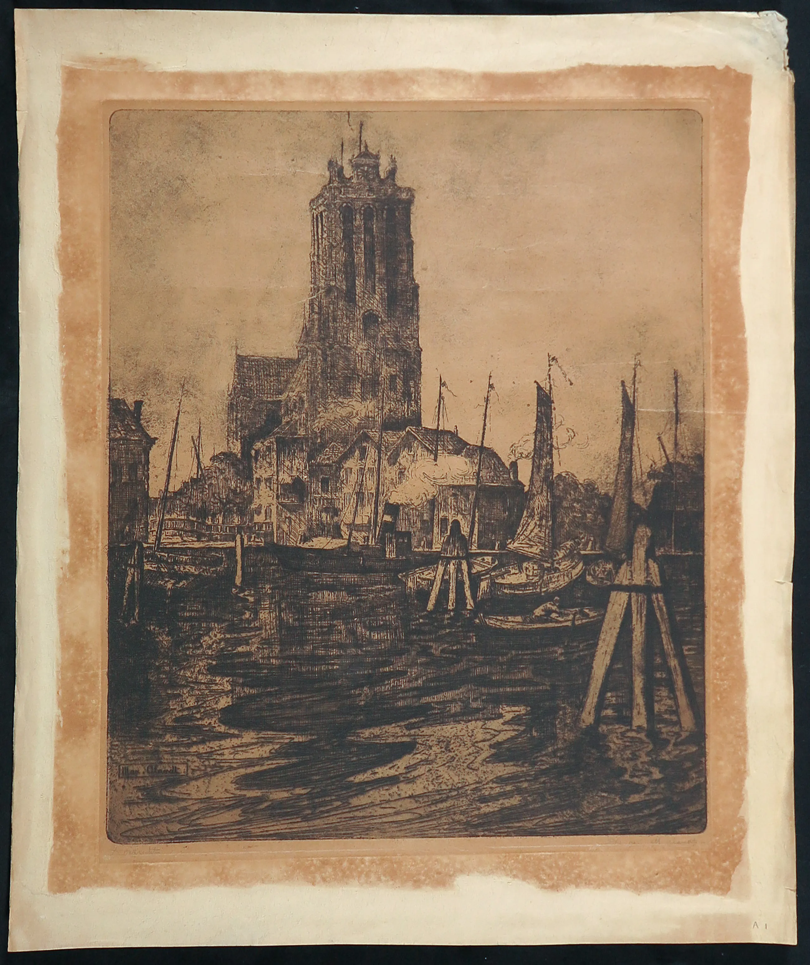 | Het papier is sterk verkleurd. Langs de randen van het blad, buiten de voorstelling, wat kreukjes. | |||||||||||