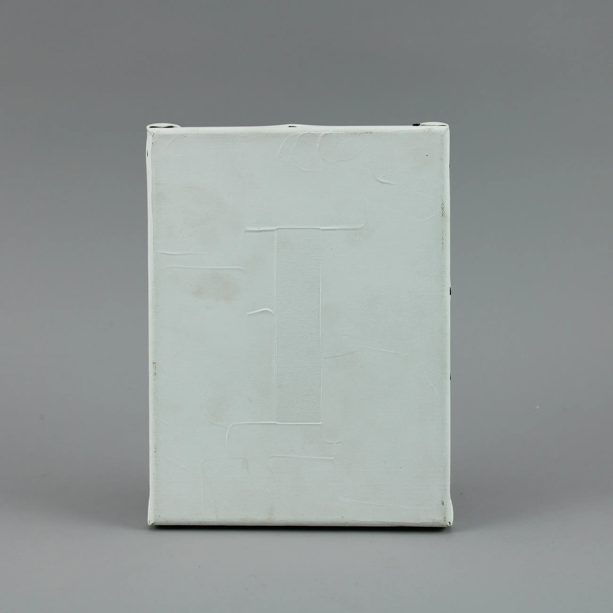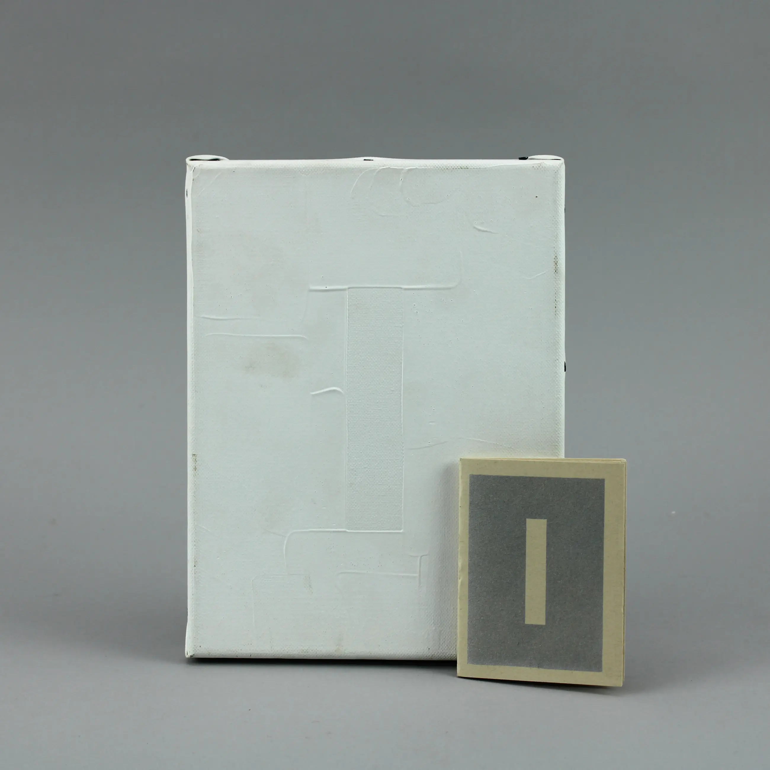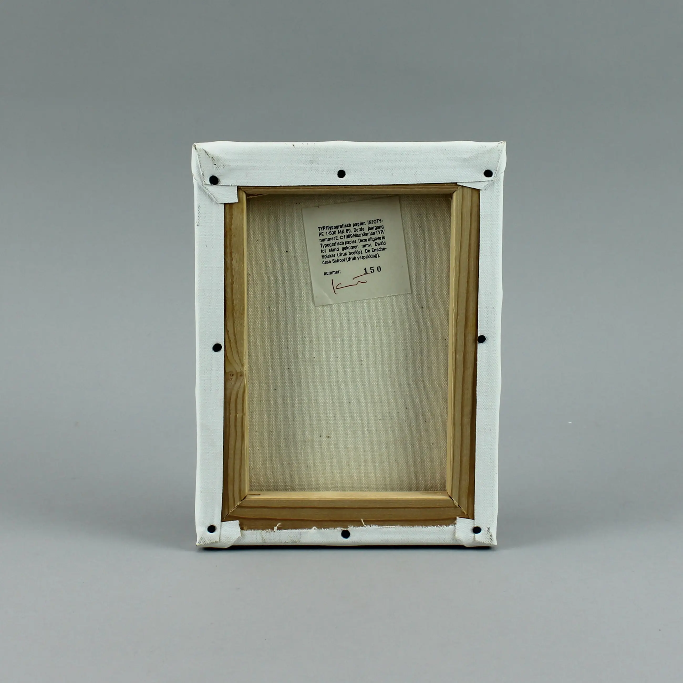 Houten spieraam met doek, hierop geschilderd een I, op de achterkant een label met signatuur.