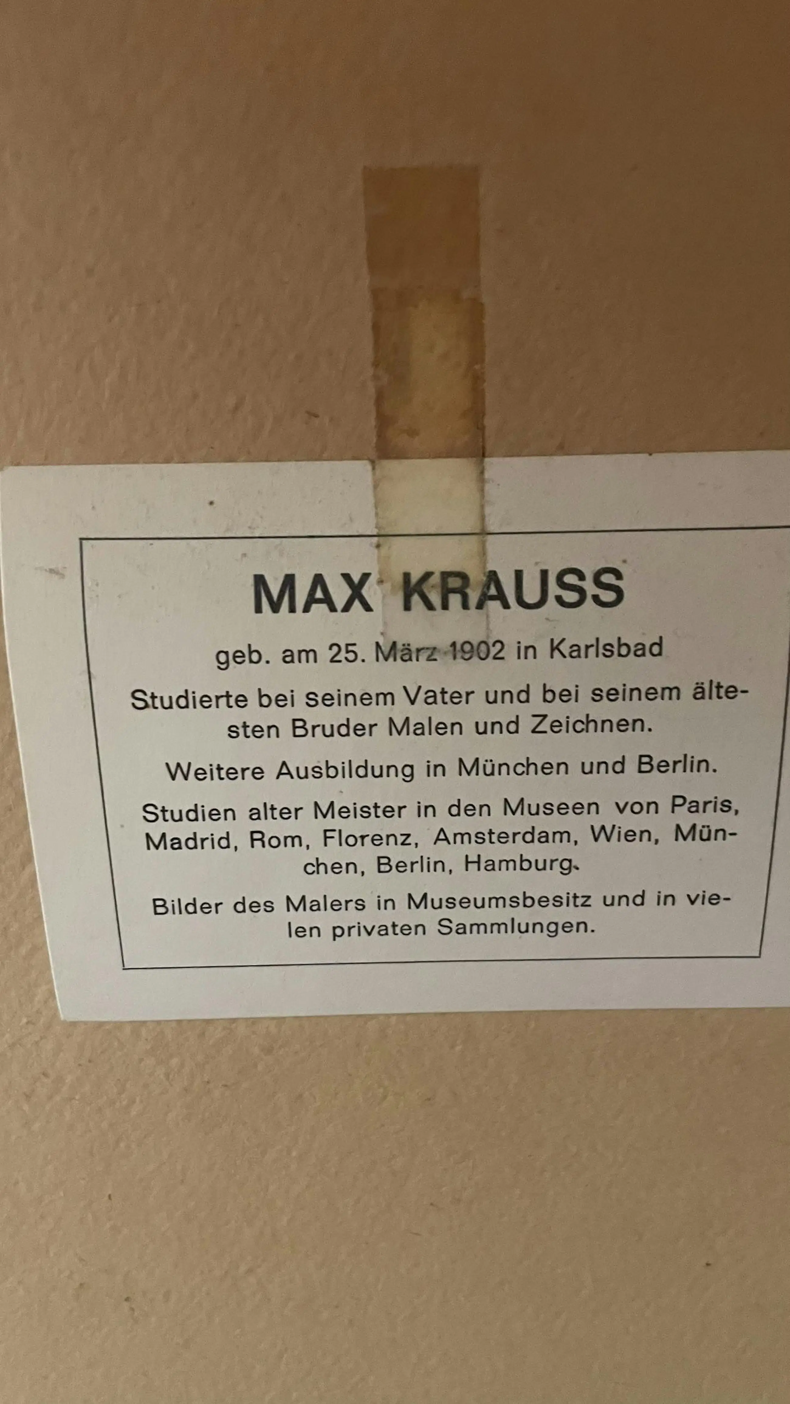 Max Kraus werd geboren op 25 maart 1902 in Karlsbad. Hij was een Duitse genreschilder en stamde uit een lange lijn van schilders. Hij studeerde bij zijn vader en oudere broer en vervolgde zijn opleiding in München en Berlijn. Zijn schilderstijl en onderwerpkeuze doen denken aan die van Otto Kirchner (1887-1960). Bron: Internet
