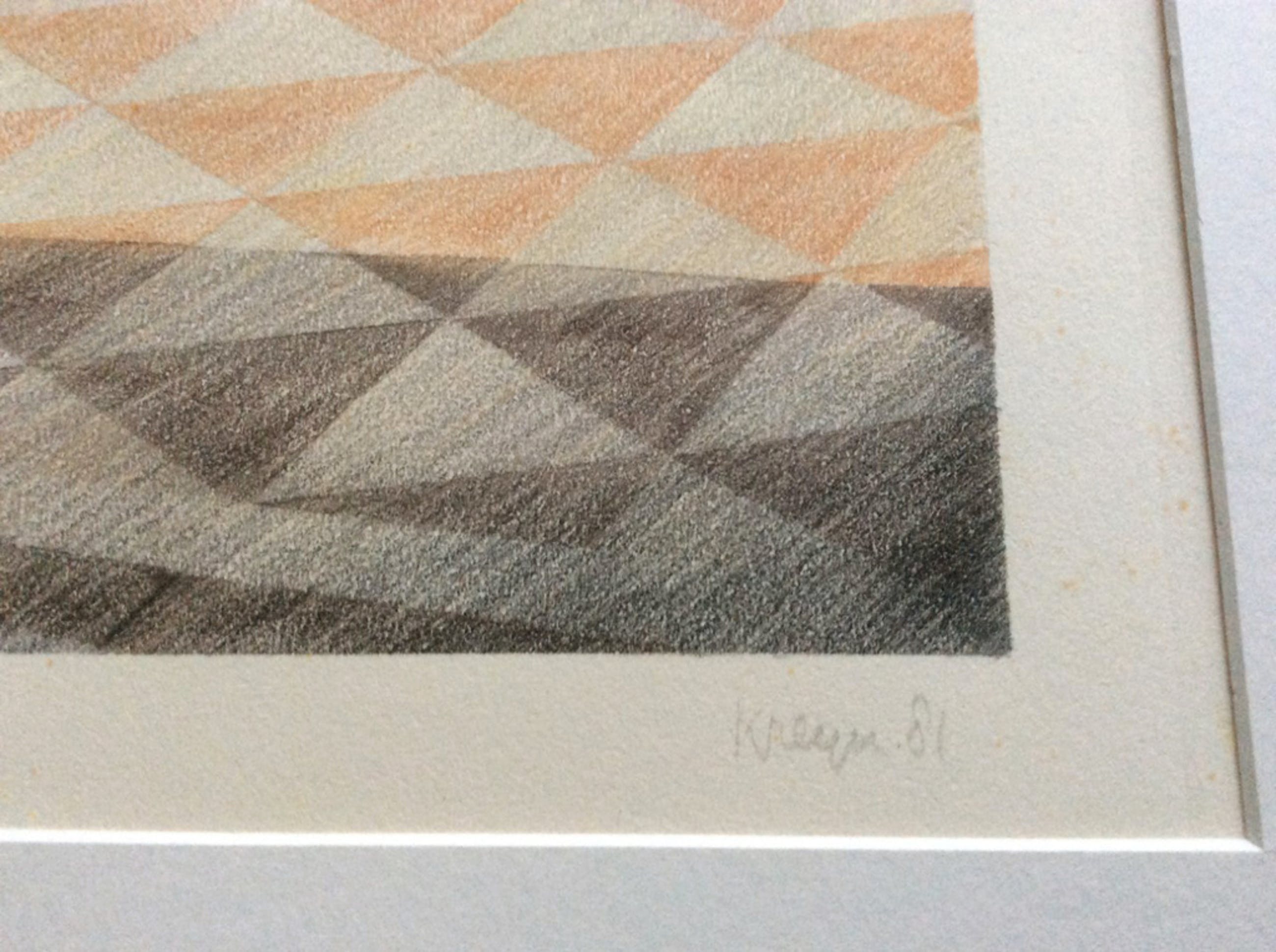 Origineel werk op papier van Max Kreijn: Ital. Interieur. Aquarel en potlood. Minutieus vakmanschap. Potlood gesigneerd en gedateerd r.o. 1981. Achterop tevens van info voorzien. Formaat tekening 31 x 36 cm, incl. omlijsting (zonder glas) 54 x 68 cm. Hier en daar wat oneffenheden, behalve in de tekening zelf.
