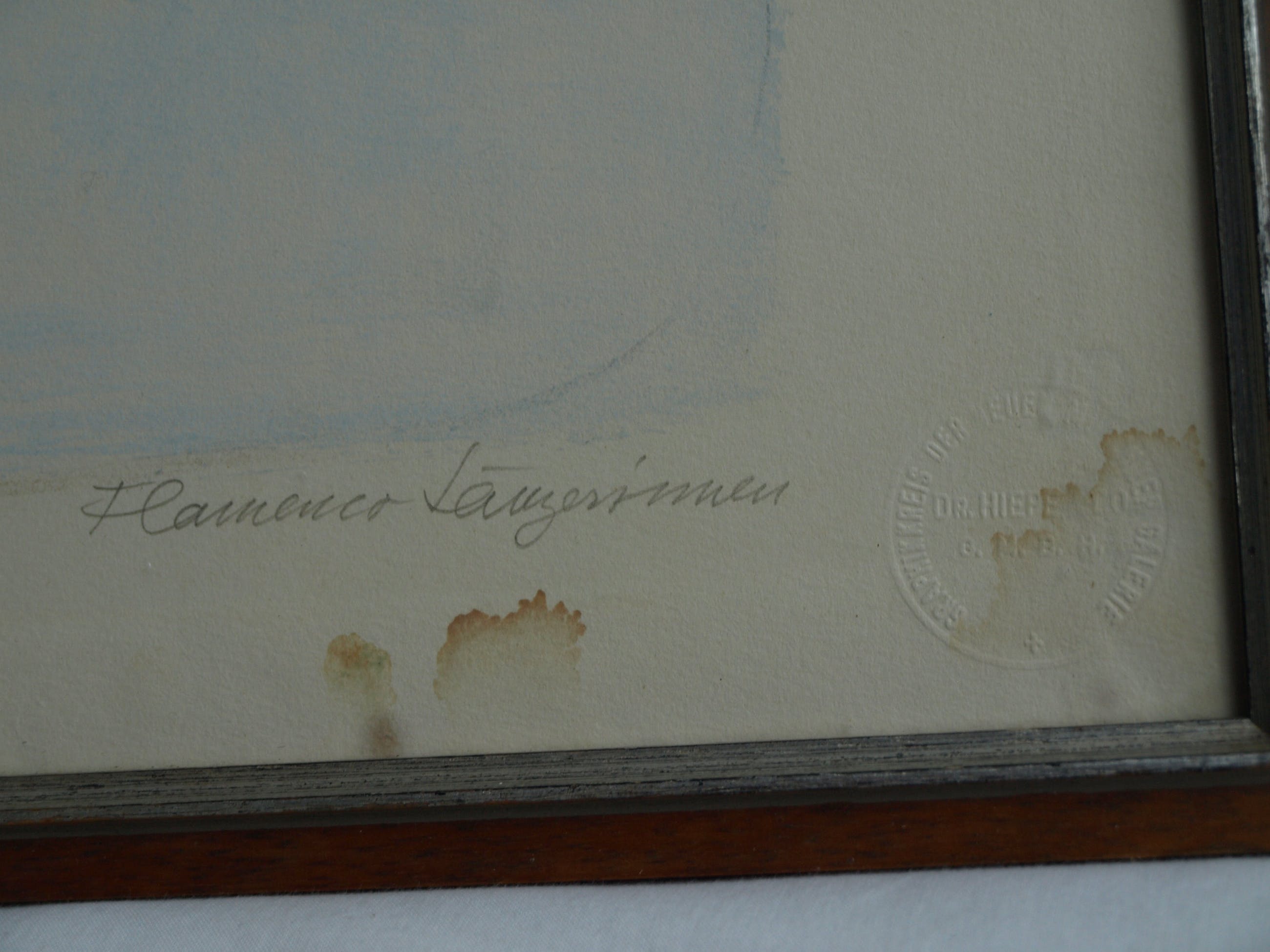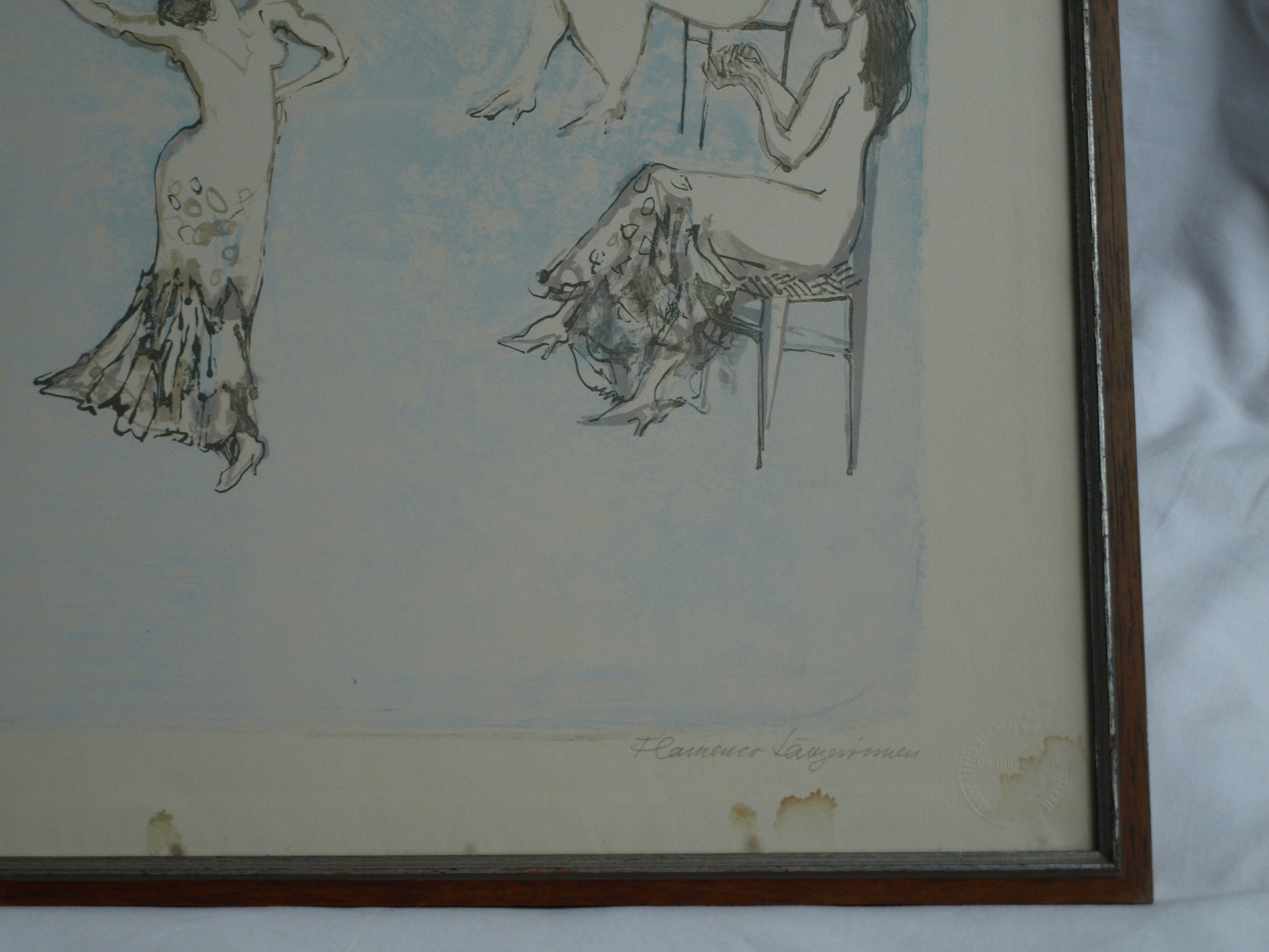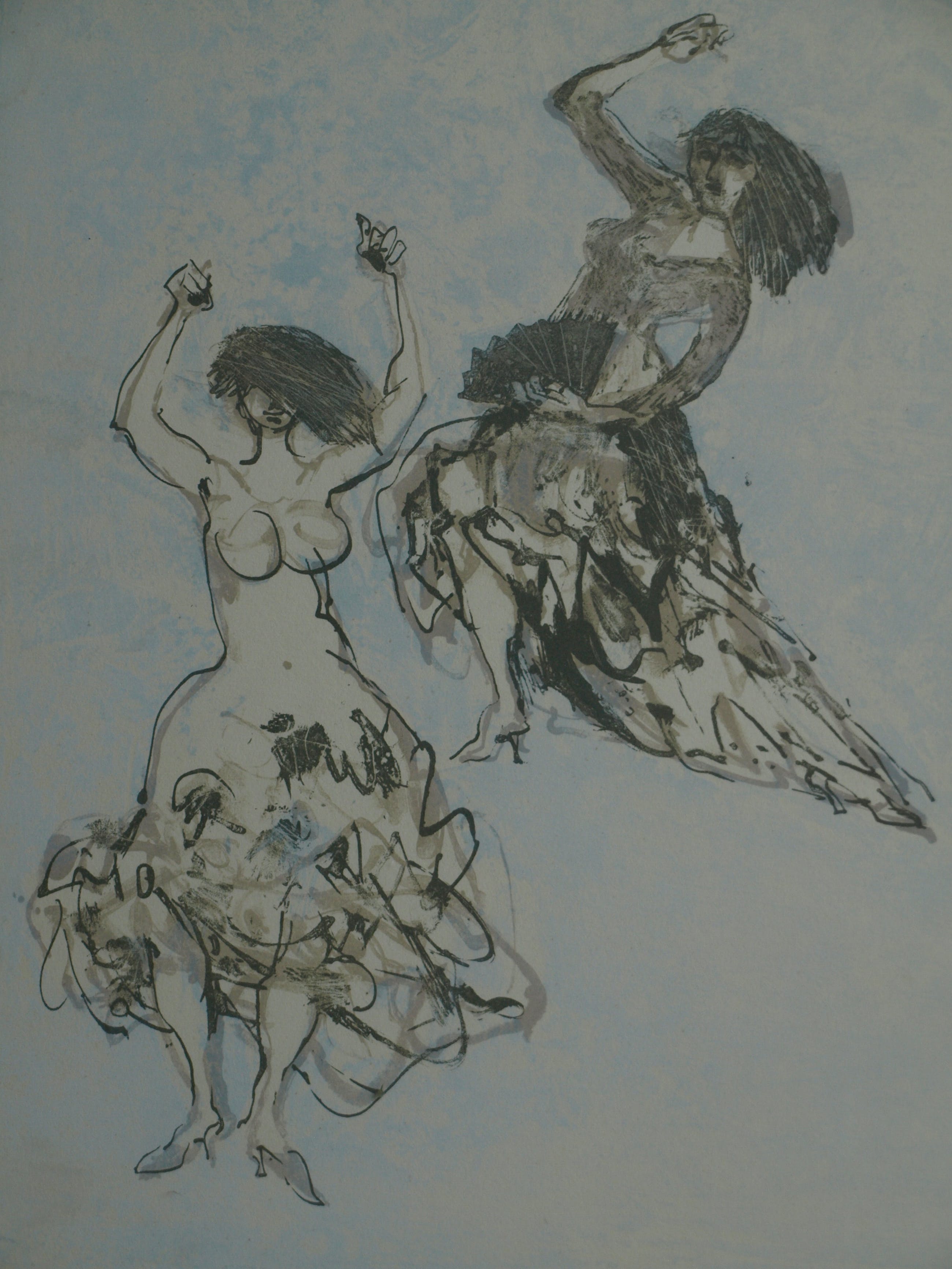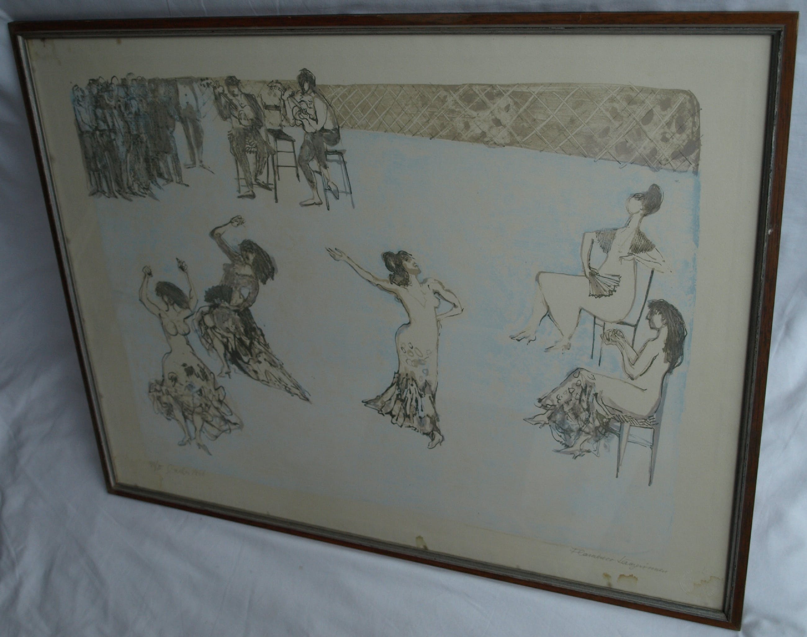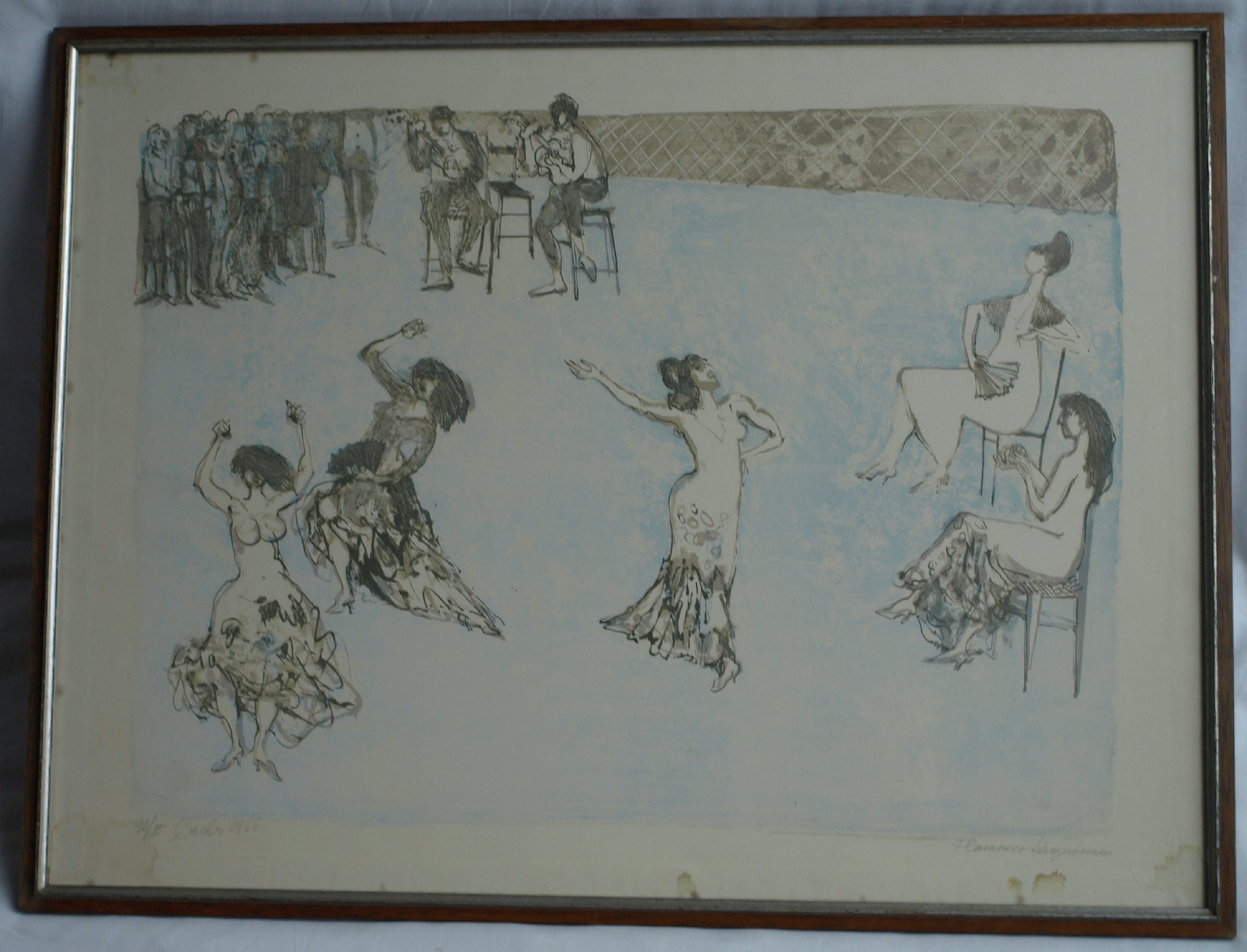 Een ingelijste litho uit 1966 van de Duitse kunstenaar Max Lacher (1905-1988), getiteld “Flamenco Tänzerinnen”.