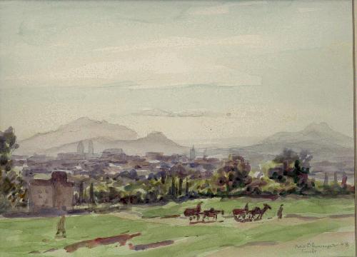 Aquarell mit Bleistift.Unten rechts mit Bleistift signiert, datiert 43 und betitelt Tunis. Rückseitig mit zwei braunen Papierstreifen unter PP befestigt, und zwei alte Montierungsreste. Größe etwa 28 mal 22 cm. Versand 8 Euro.Privatverkauf. Fragen bitte vorab klären.