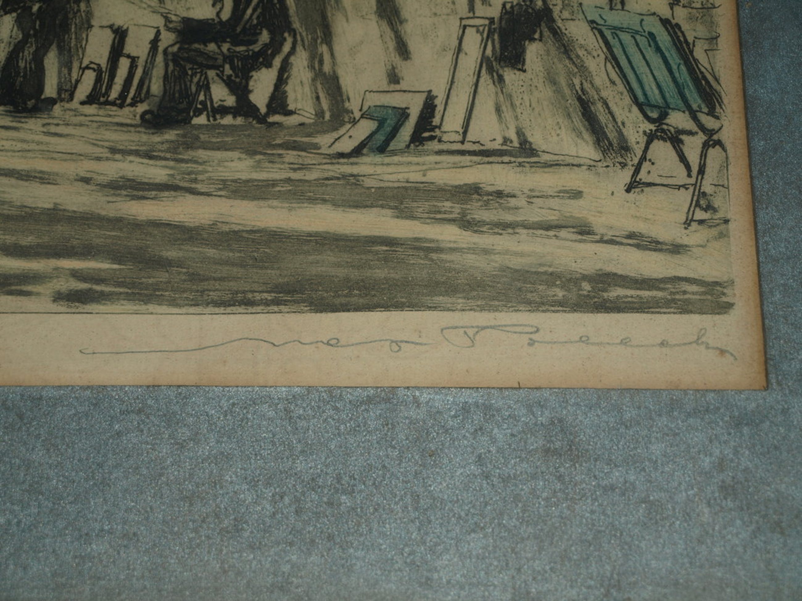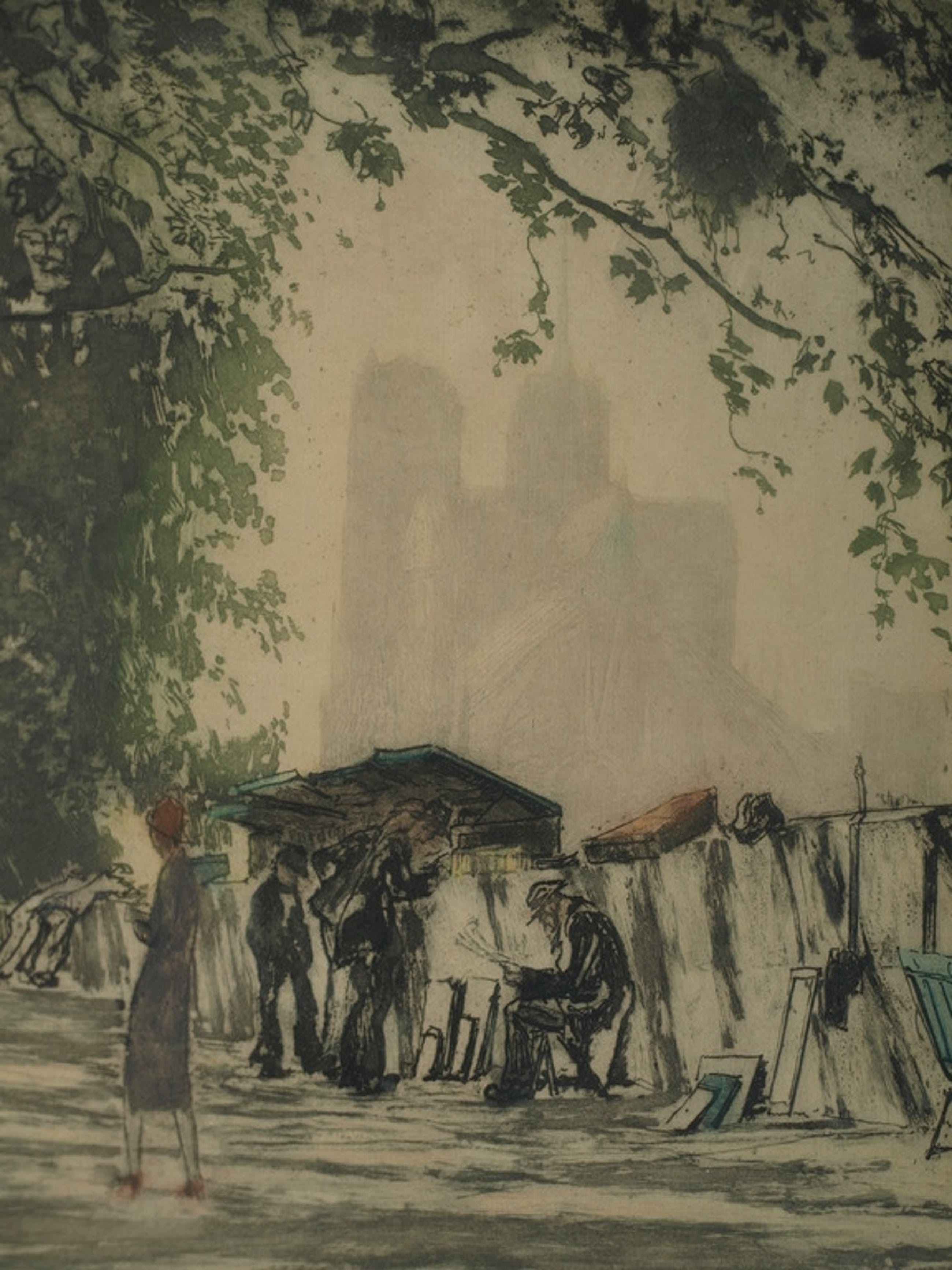 Een ‘droge naald en aquatint’ ets van Max Pollak met een voorstelling van een ‘kunstenaarsstraatje’ met op de achtergrond de Notre Dame in Parijs.