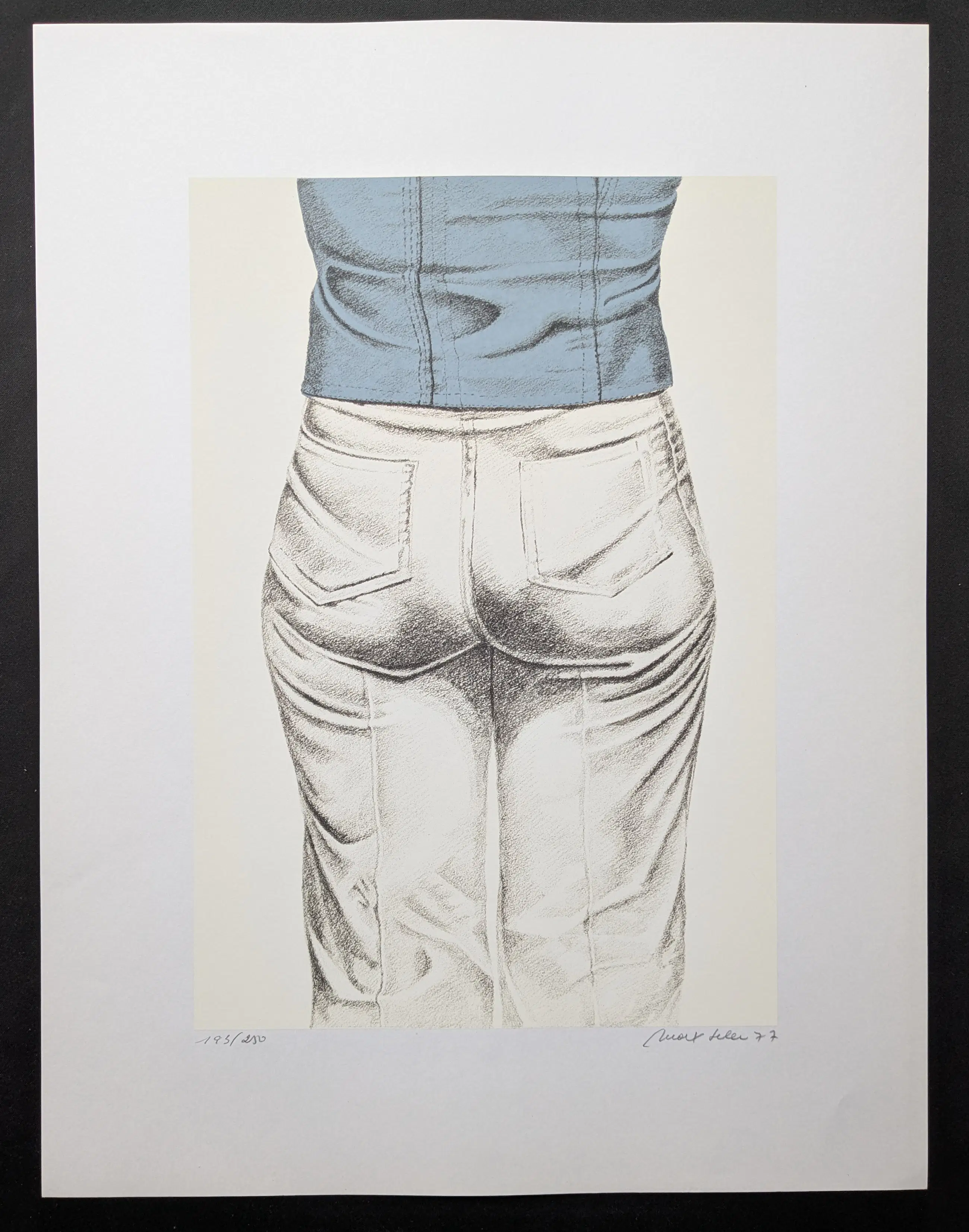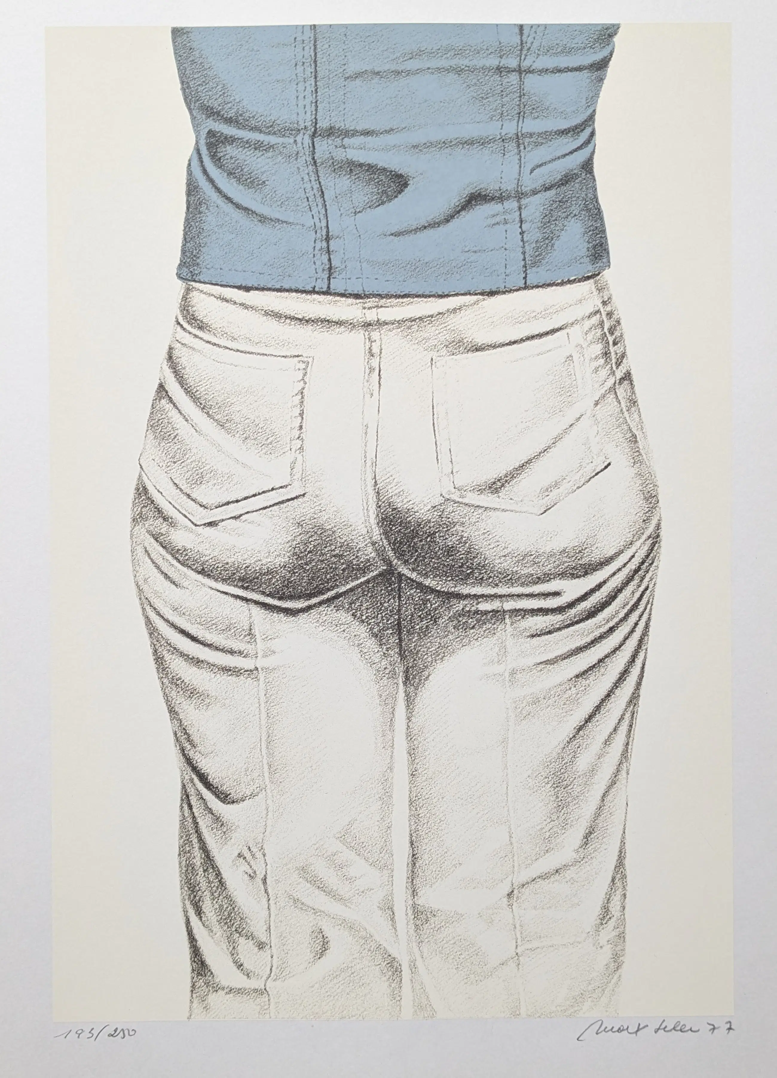 De zeefdruk, uitgevoerd in blauw, grijs en wit, beeldt het achterwerk van een dame af. De schaduw aan de billen zorgt voor de contouren het achterwerk; de versmalde taille geeft het werk iets sensueel. Een ideaal werk voor wie vrouwen bemint zonder erg erotisch te willen zijn.