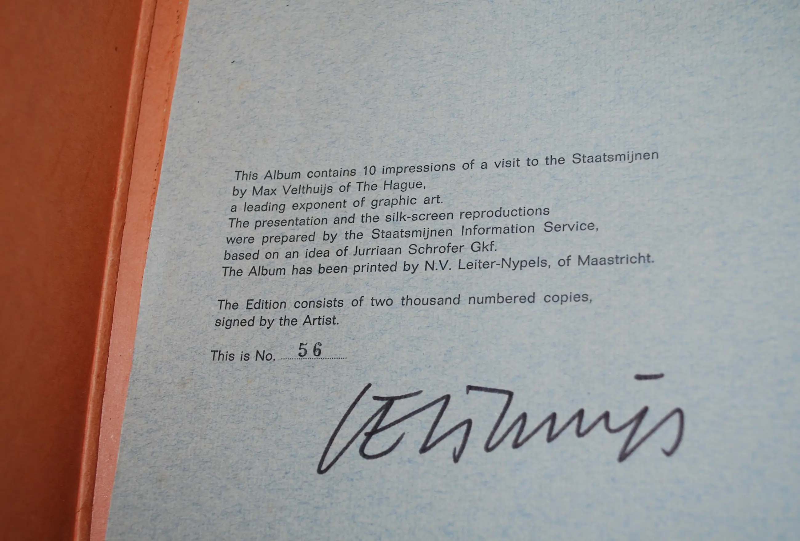 Gedrukt door Leiter-Nypels, Maastricht. Het betreft hier de nrs. 1/3/5/7 van de uitgave. In de originele kartonnen map met linnen binddraden. Gesigneerd en genummerd op een apart vel grijs papier (uitgevouwen 65x50 cm).