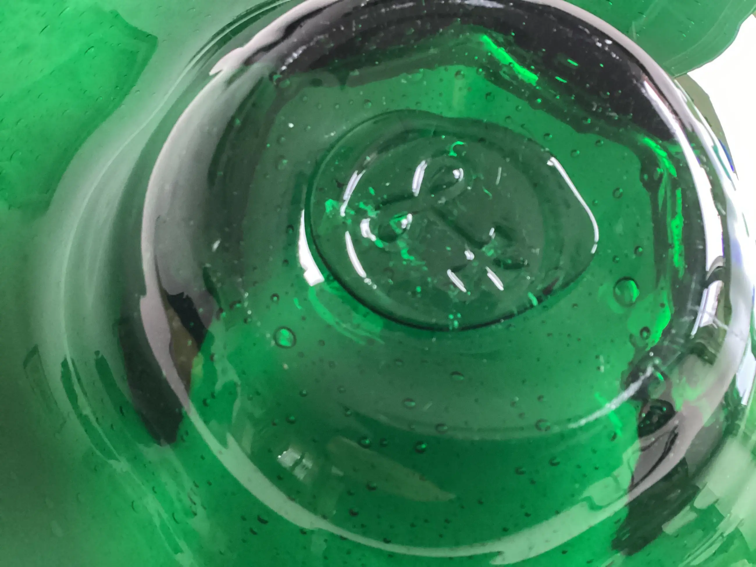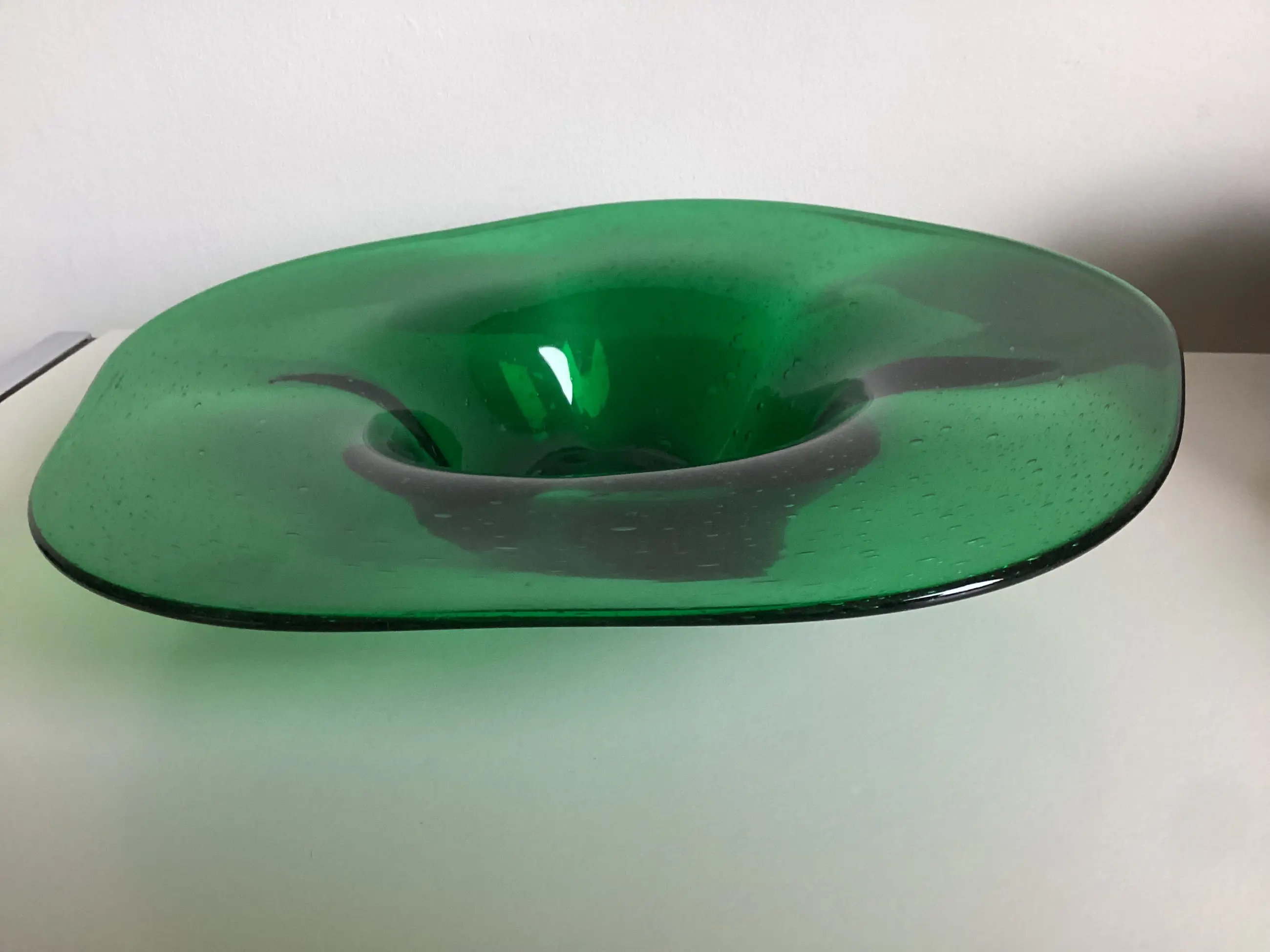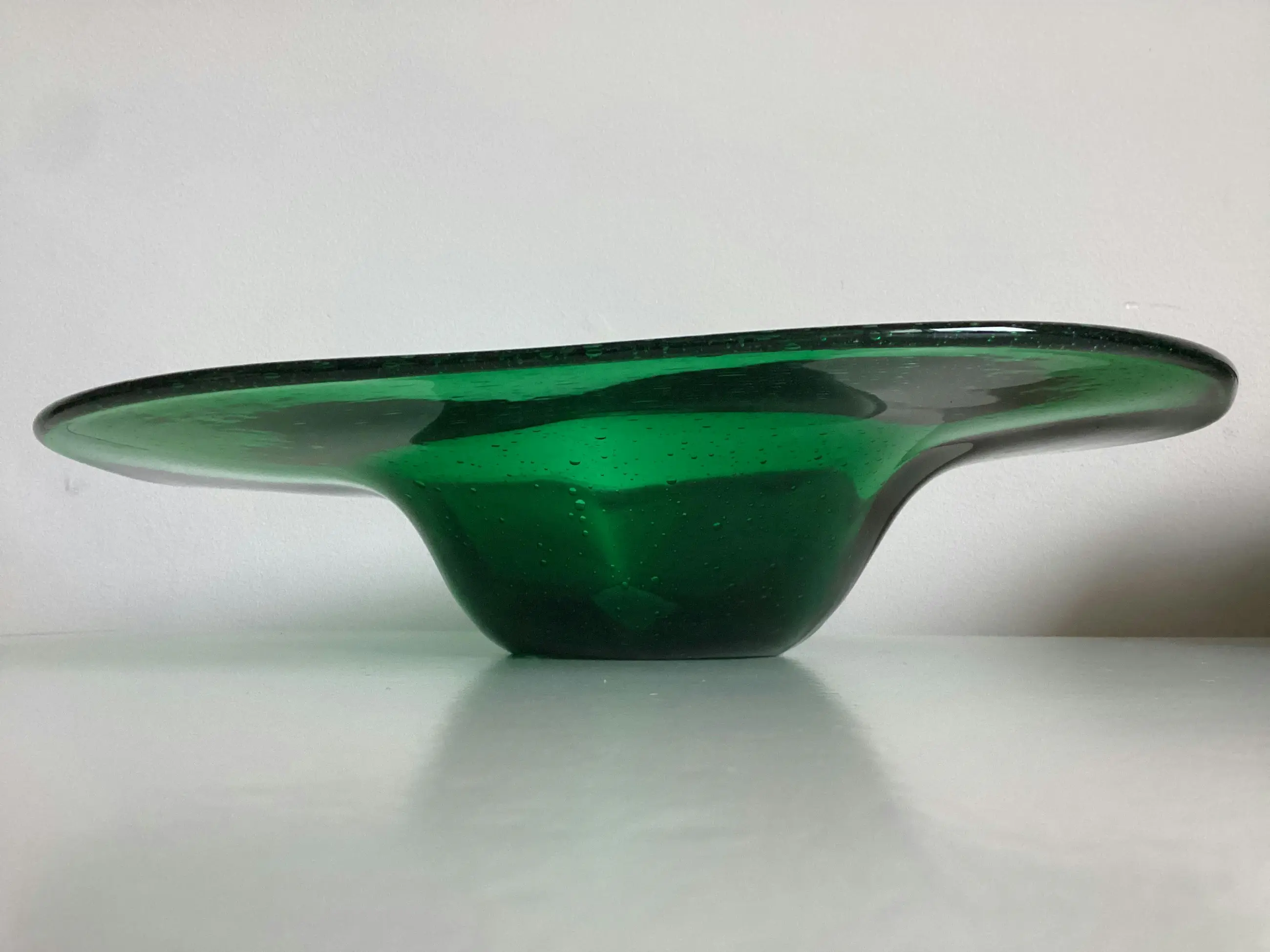 Max Verboeket smaragdgroene schaal Antiqua. Dikwandig glas met luchtbellen. Gebaseerd op antieke vormen. Doorsnede 32 cm, gewicht 1500 gr. Gemerkt met stempeldruk van het glasblazersteken: het eeuwigheidsteken met daaronder het Mercuriusteken van de handel. Voor Kristalunie Maastricht, 1962. Helder glas, enkele niet storende lichte gebruikssporen.