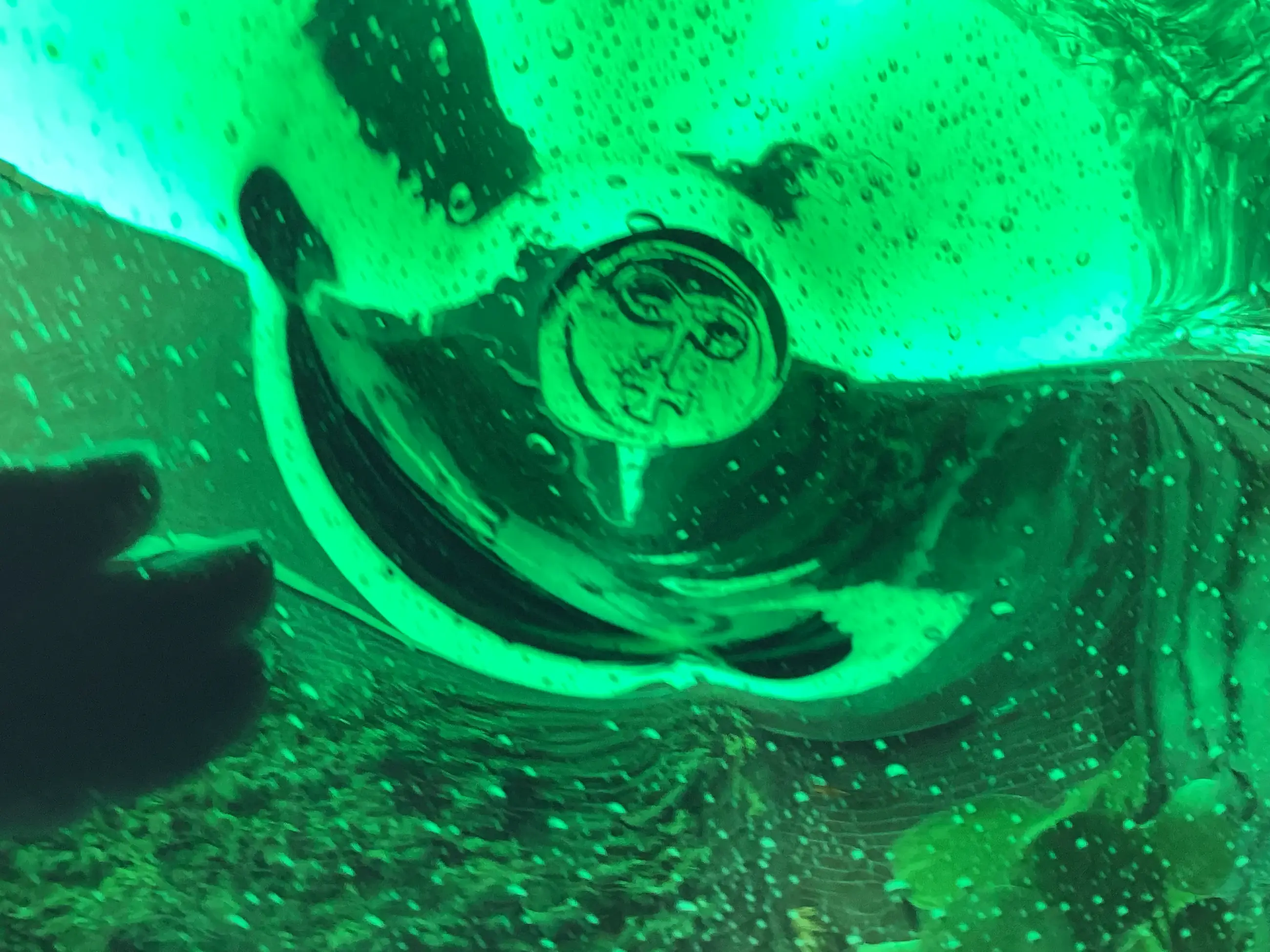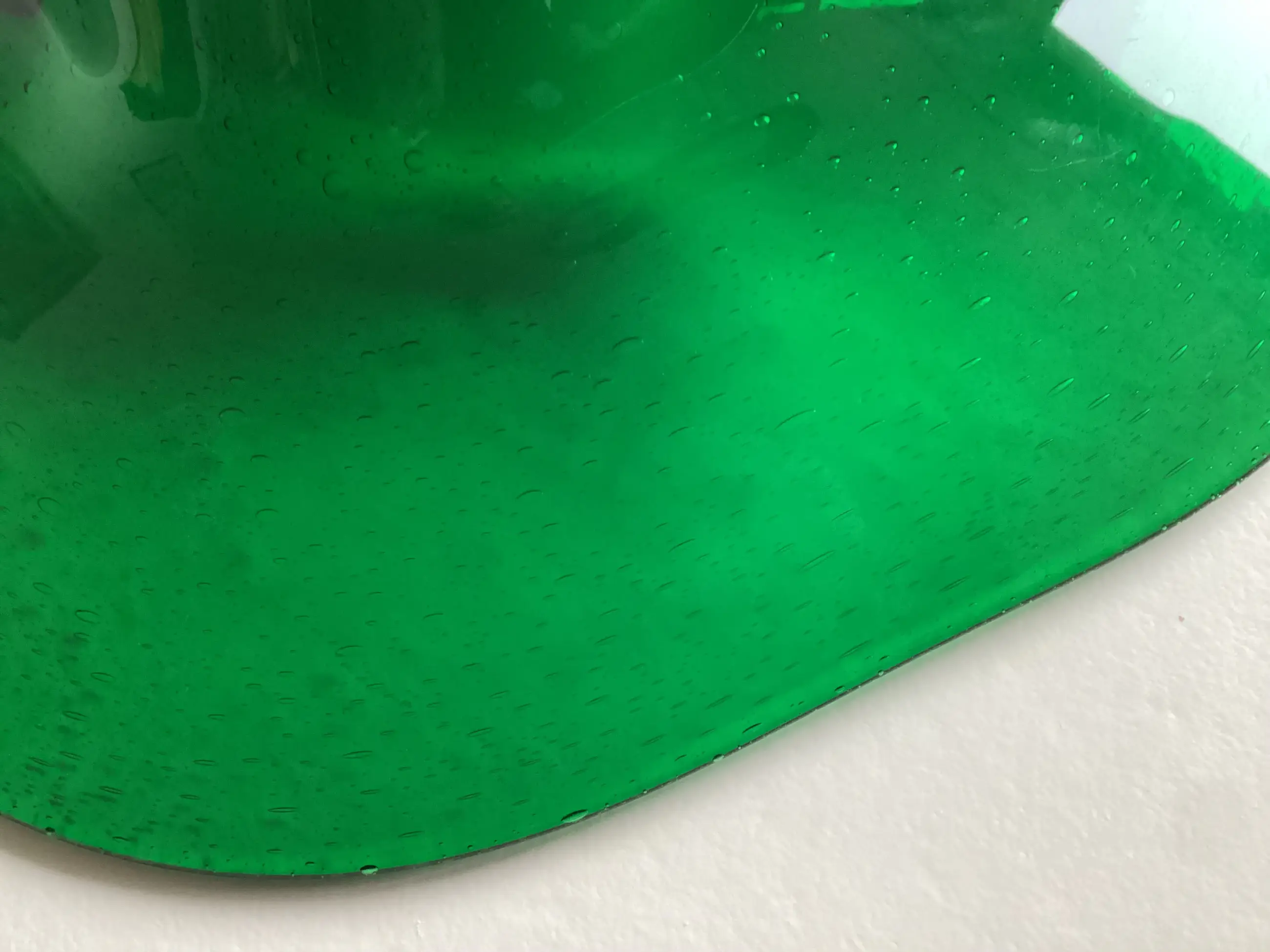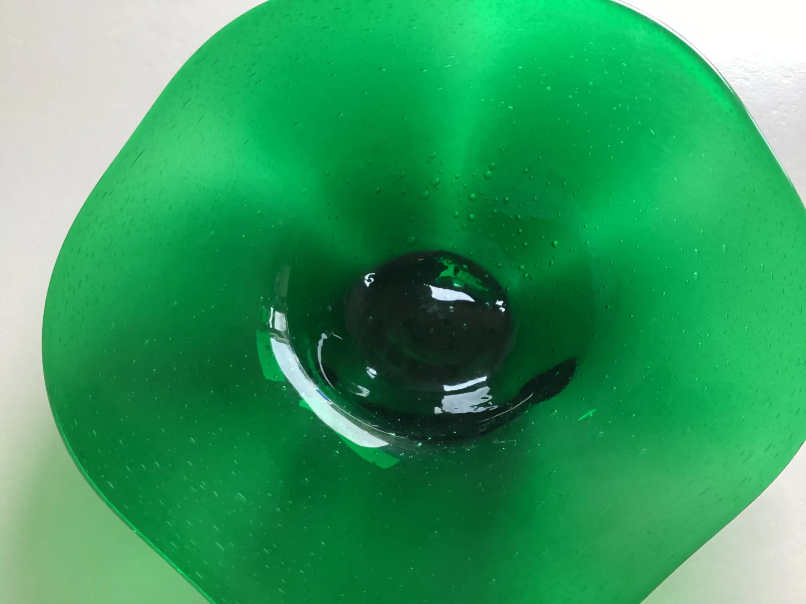 Max Verboeket smaragdgroene schaal Antiqua. Dikwandig glas met luchtbellen. Gebaseerd op antieke vormen. Doorsnede 32 cm, gewicht 1500 gr. Gemerkt met stempeldruk van het glasblazersteken: het eeuwigheidsteken met daaronder het Mercuriusteken van de handel. Voor Kristalunie Maastricht, 1962. Helder glas, enkele niet storende lichte gebruikssporen.