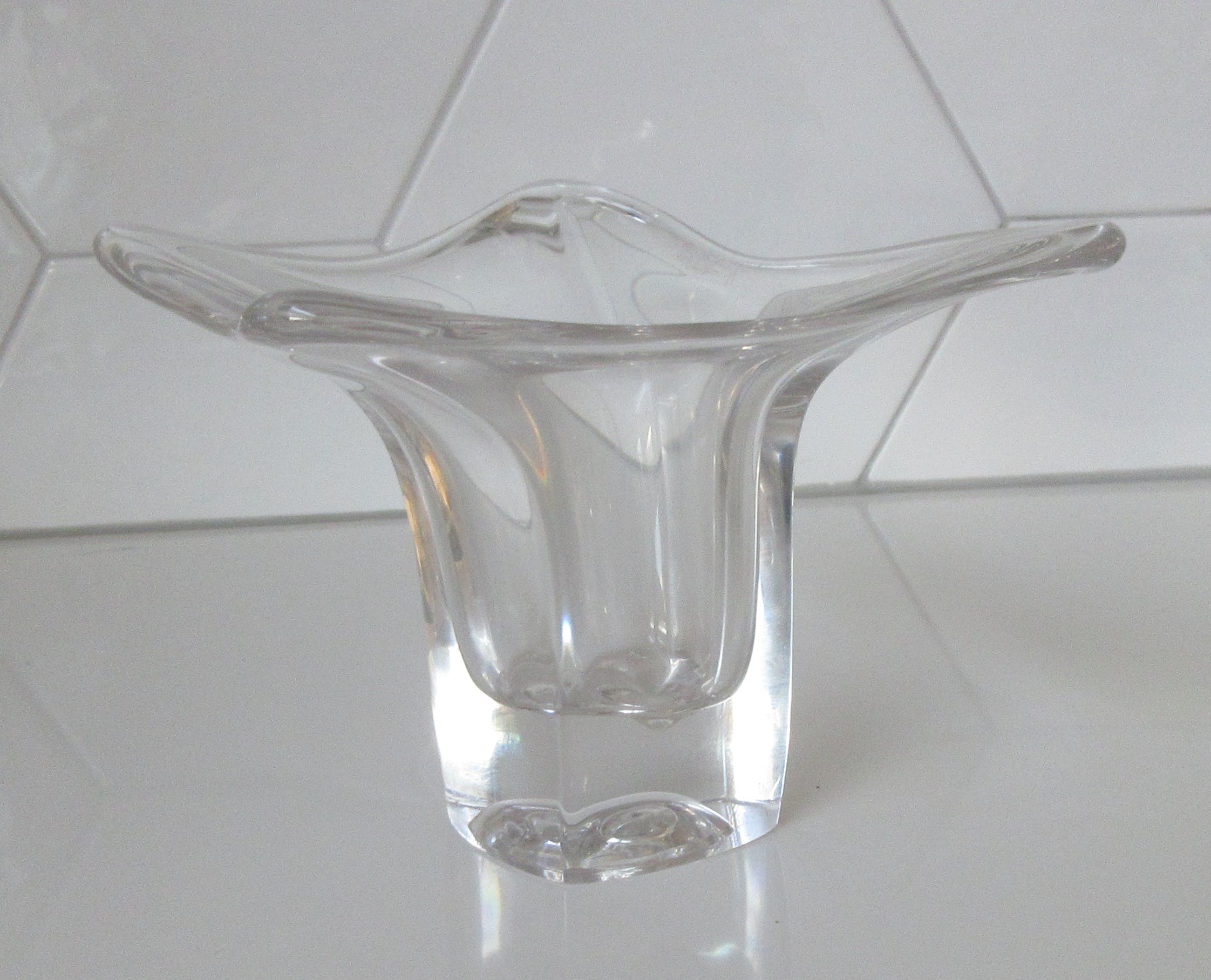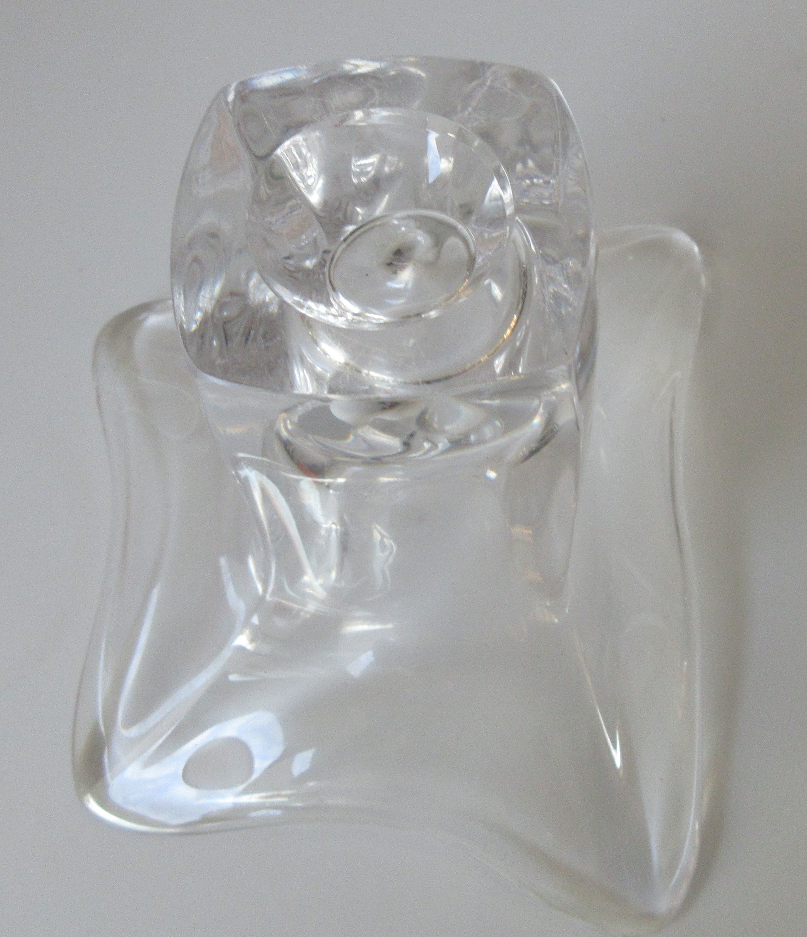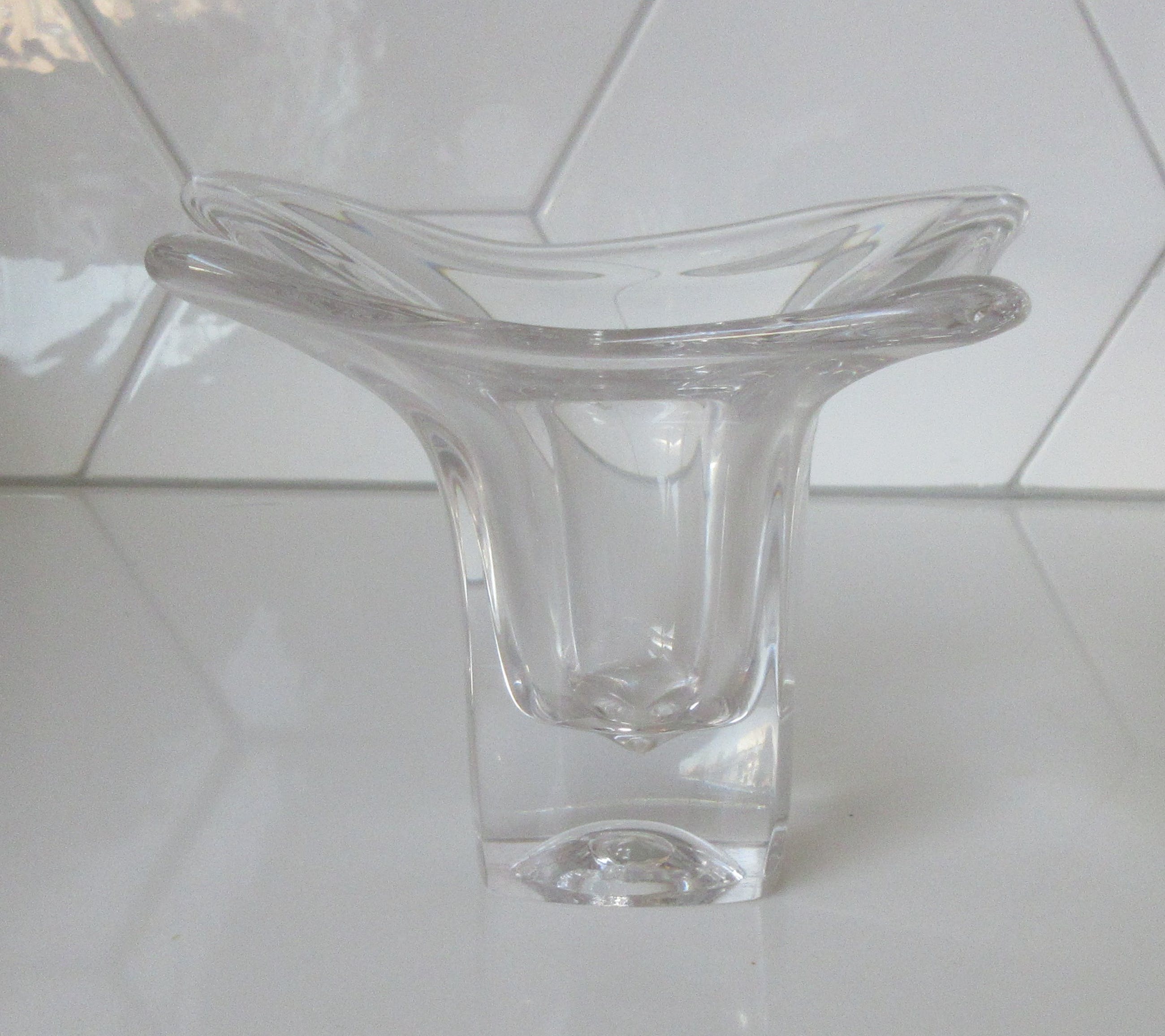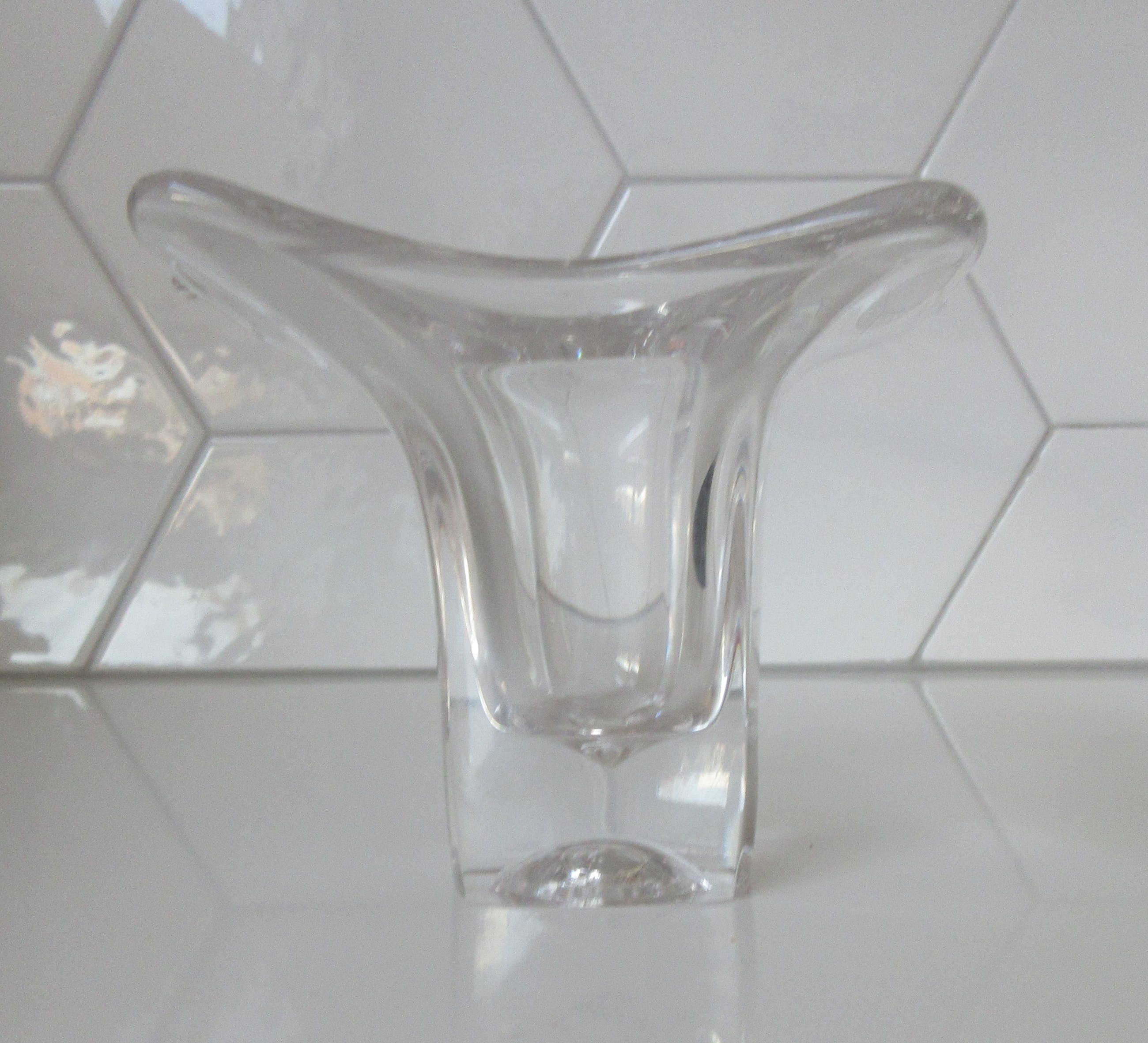 Dikwandige vrij gevormd blank glazen vaas uit de Twen serie uit 1962 ontworpen door Max Verboeket voor de Kristalunie Maastricht. Niet gemerkt of voorzien van een merksticker. In prima gebruikte conditie geen beschadigingen.