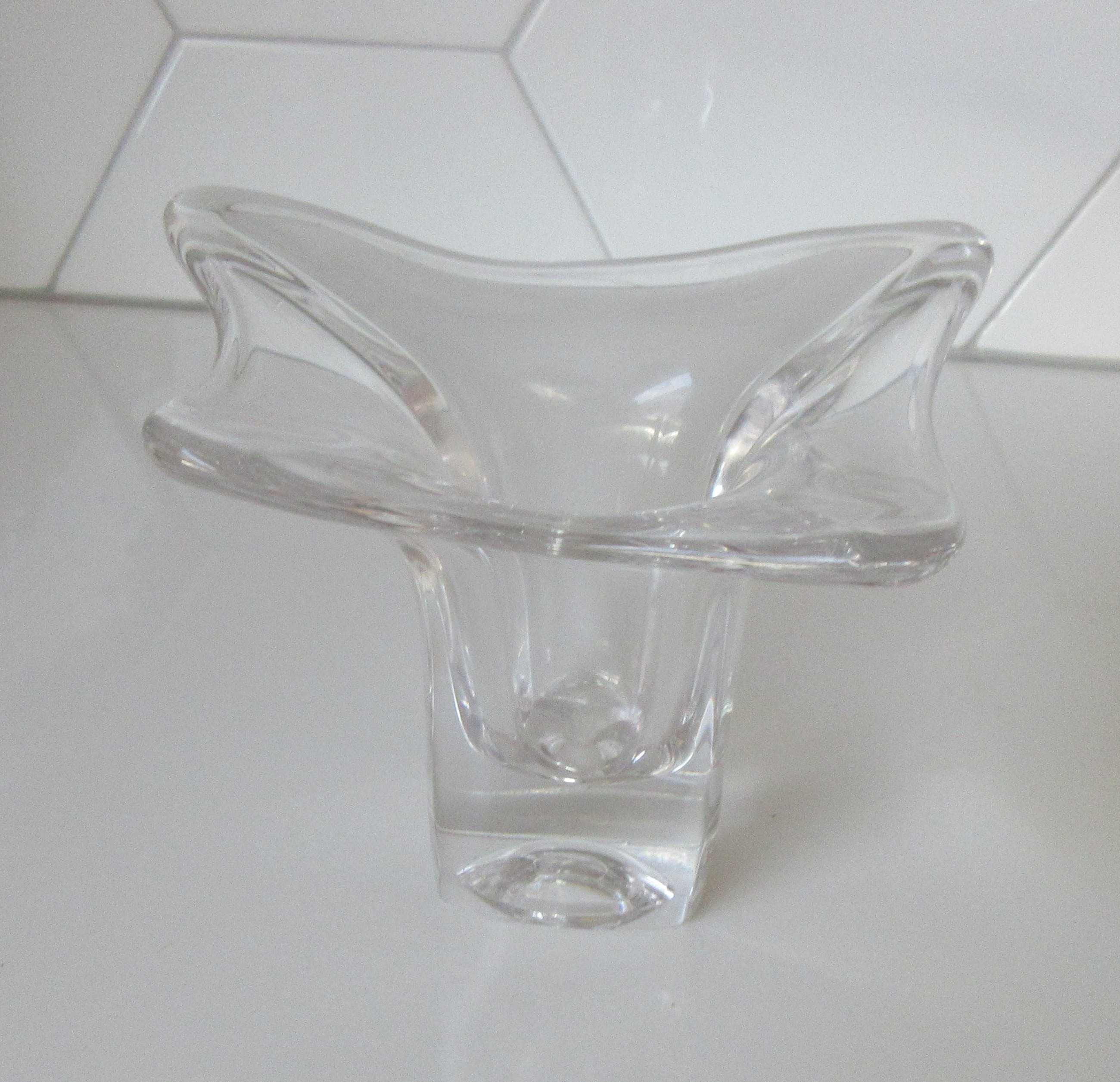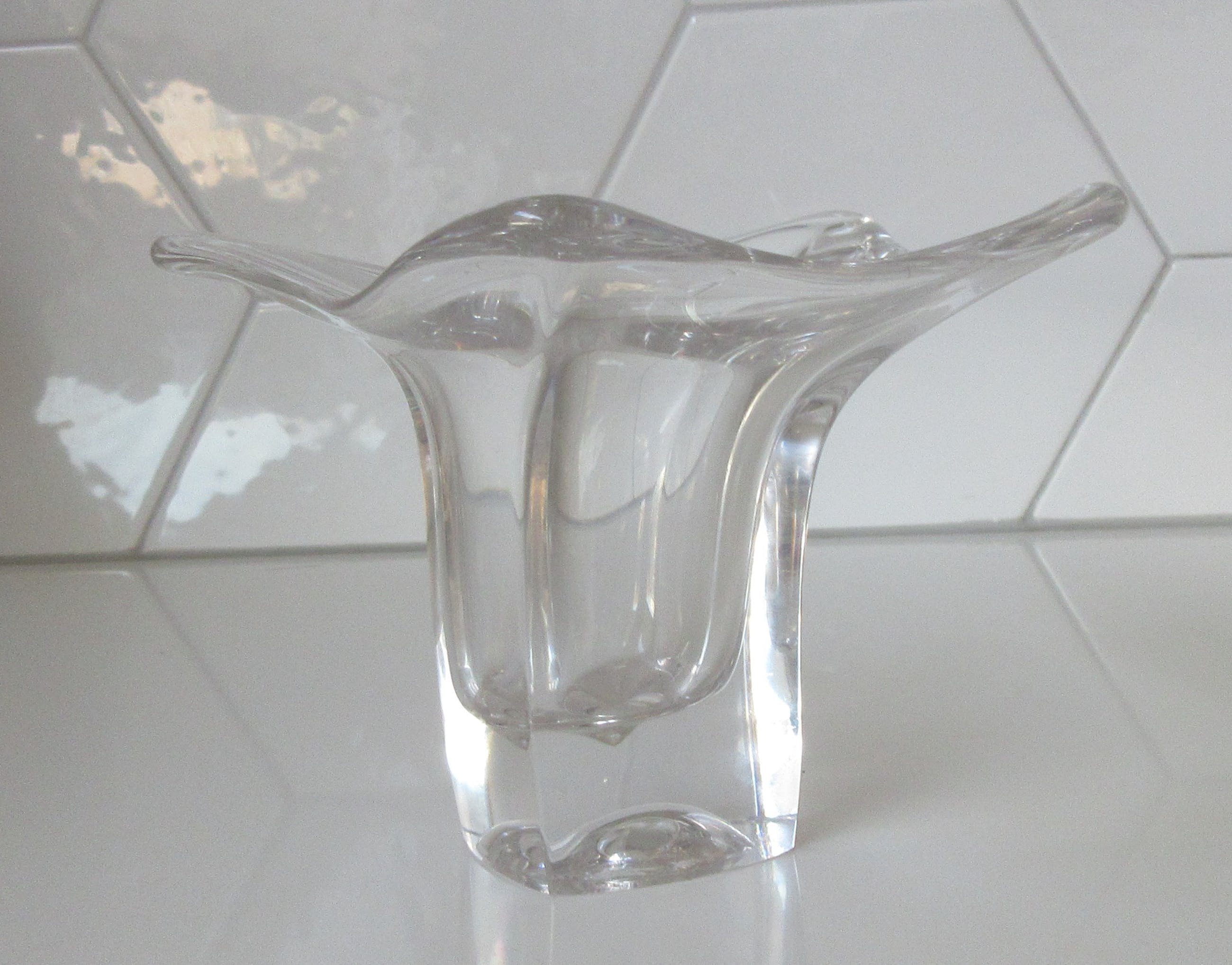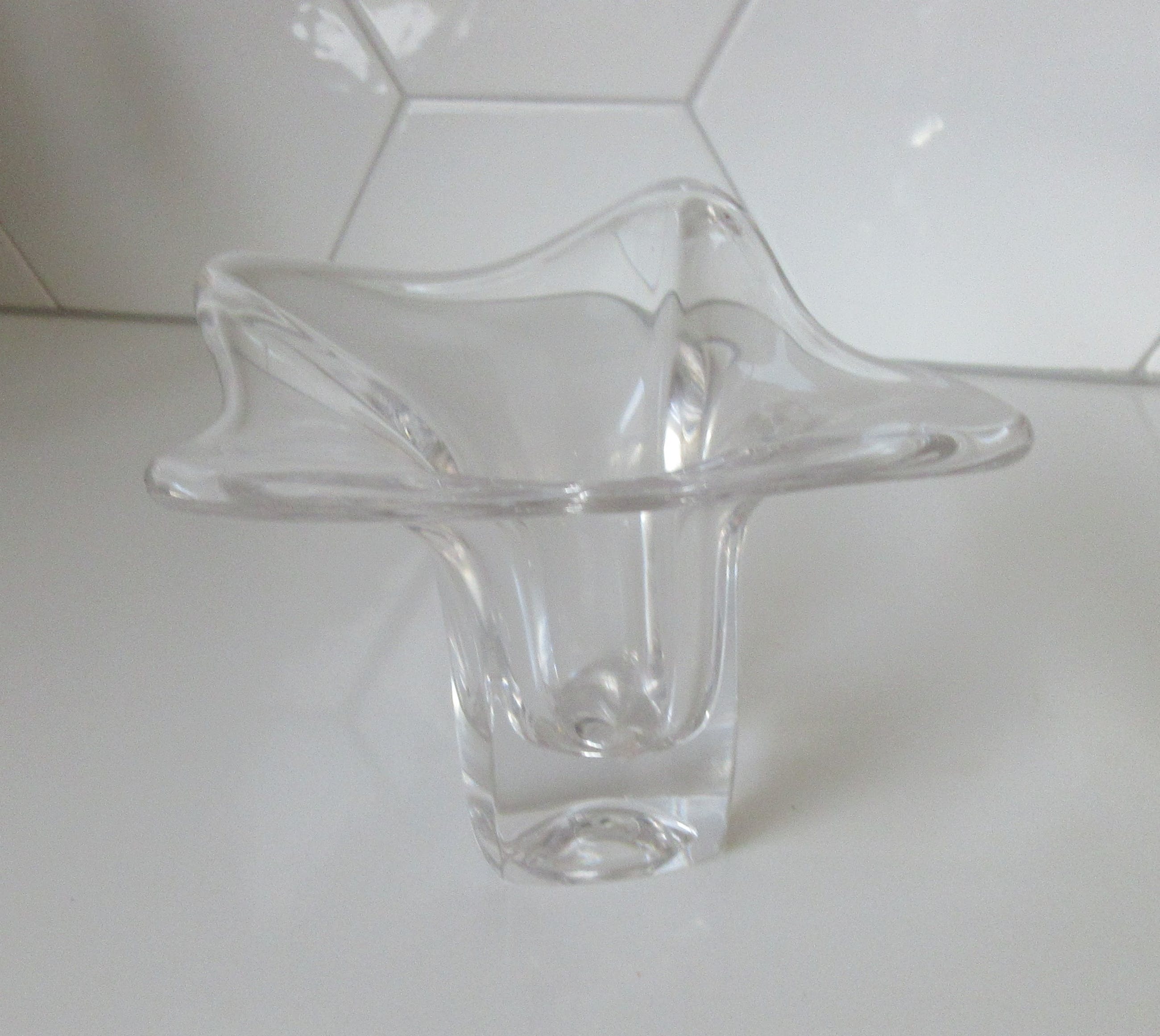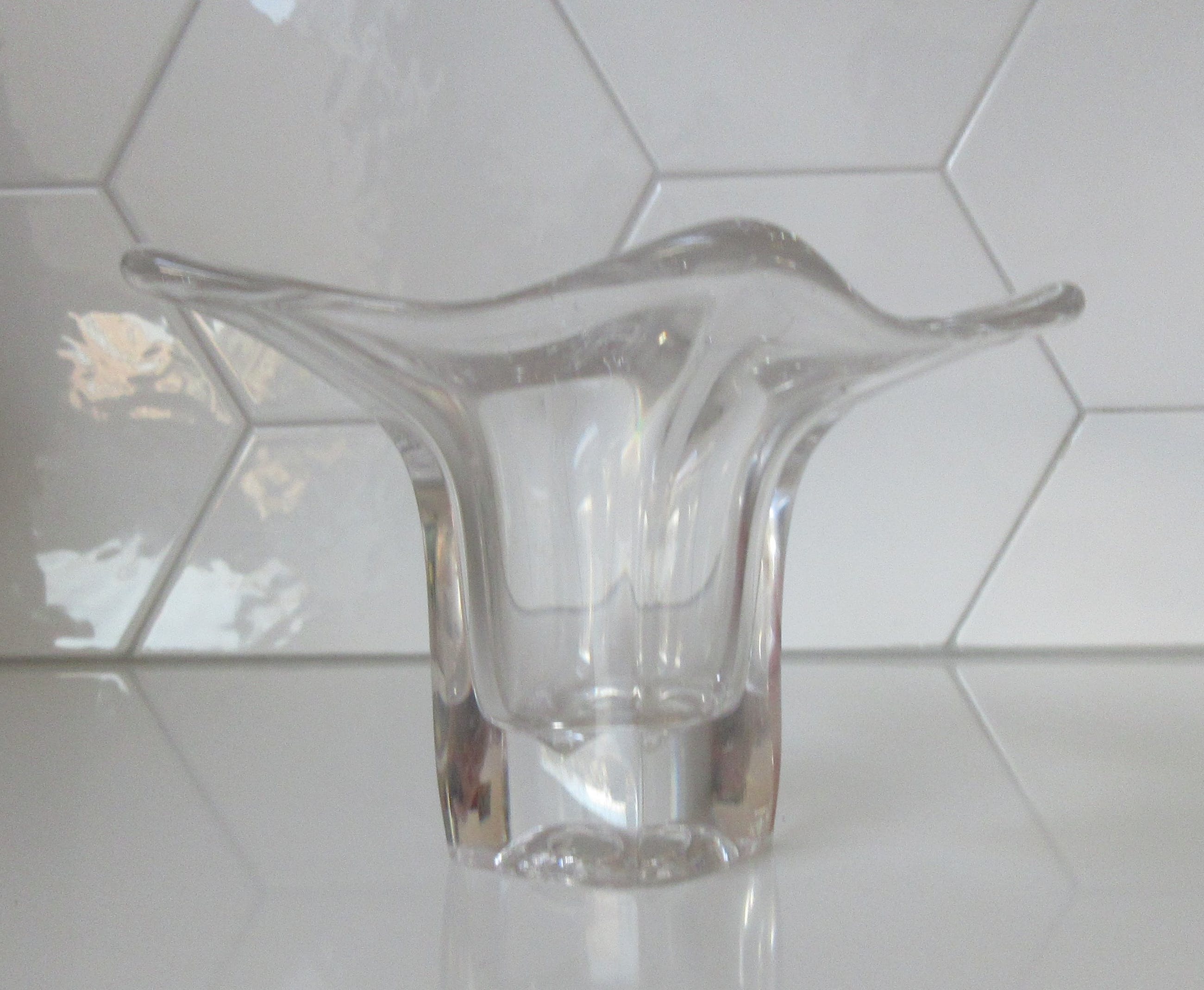Dikwandige vrij gevormd blank glazen vaas uit de Twen serie uit 1962 ontworpen door Max Verboeket voor de Kristalunie Maastricht. Niet gemerkt of voorzien van een merksticker. In prima gebruikte conditie geen beschadigingen.