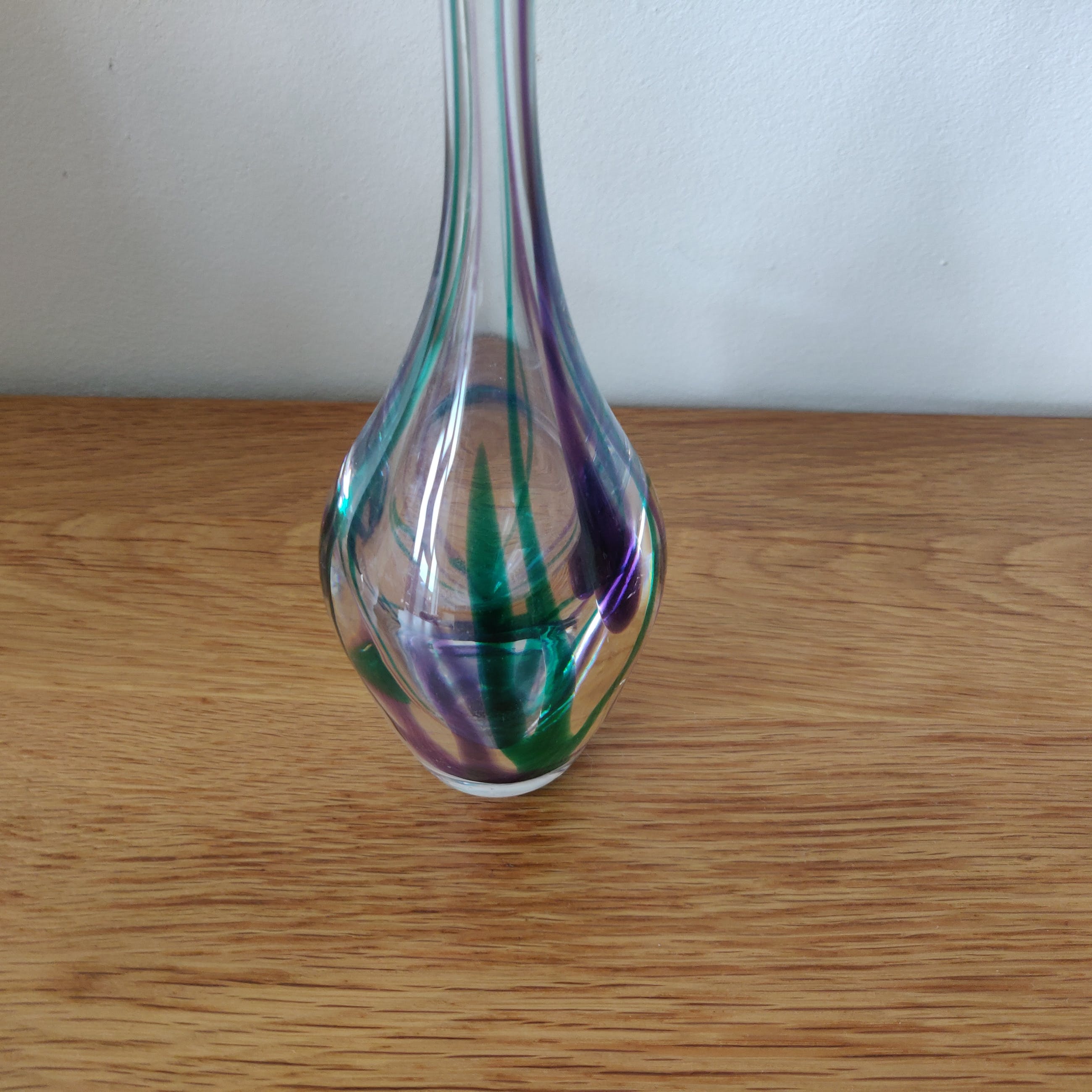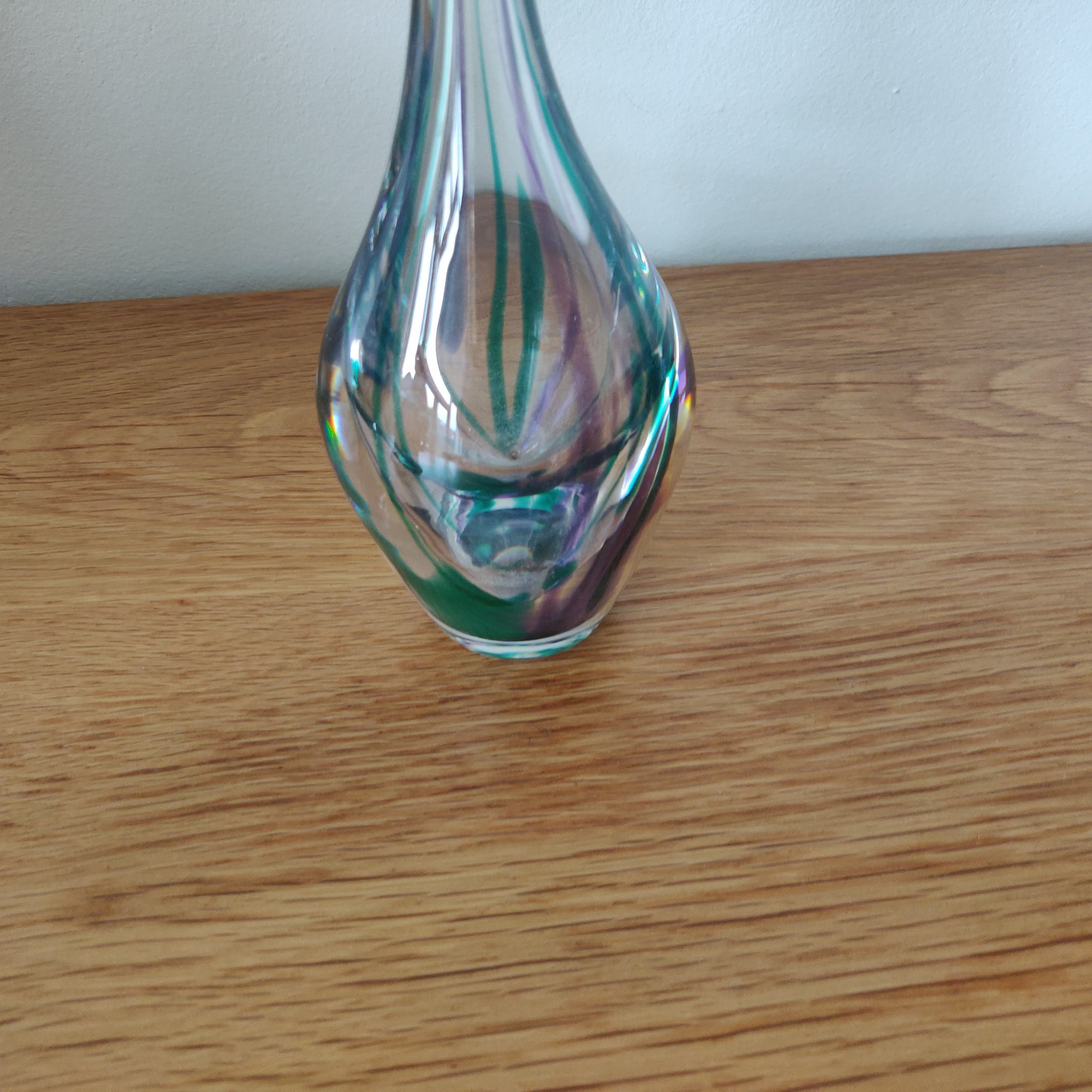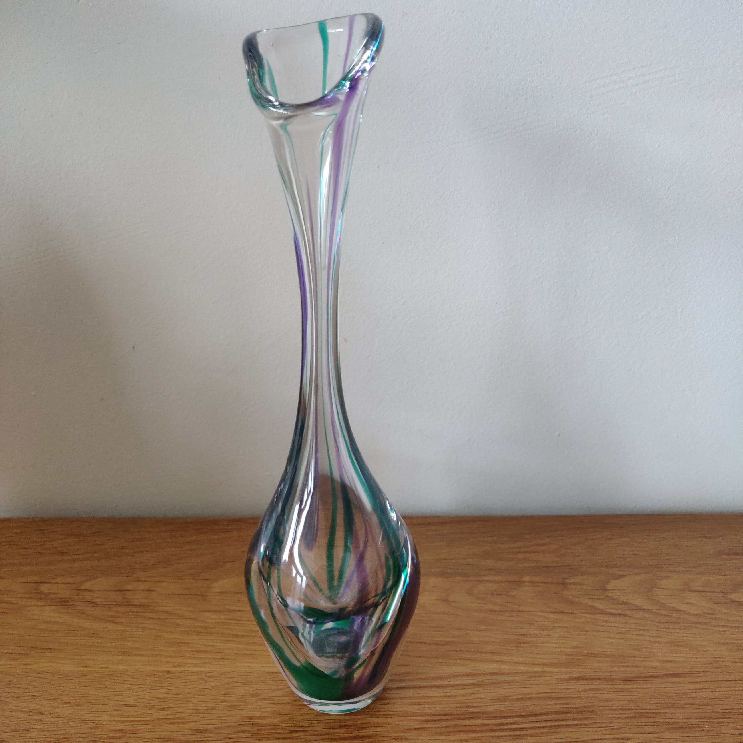 Prachtige elegante kristallen vaas uit 1979 van Max Verboeket met mooie hals en prachtige kleuren. Gesigneerd in de voet van de vaas. Het betreft een middelgroot model van 27 cm hoog en 7 cm breed.