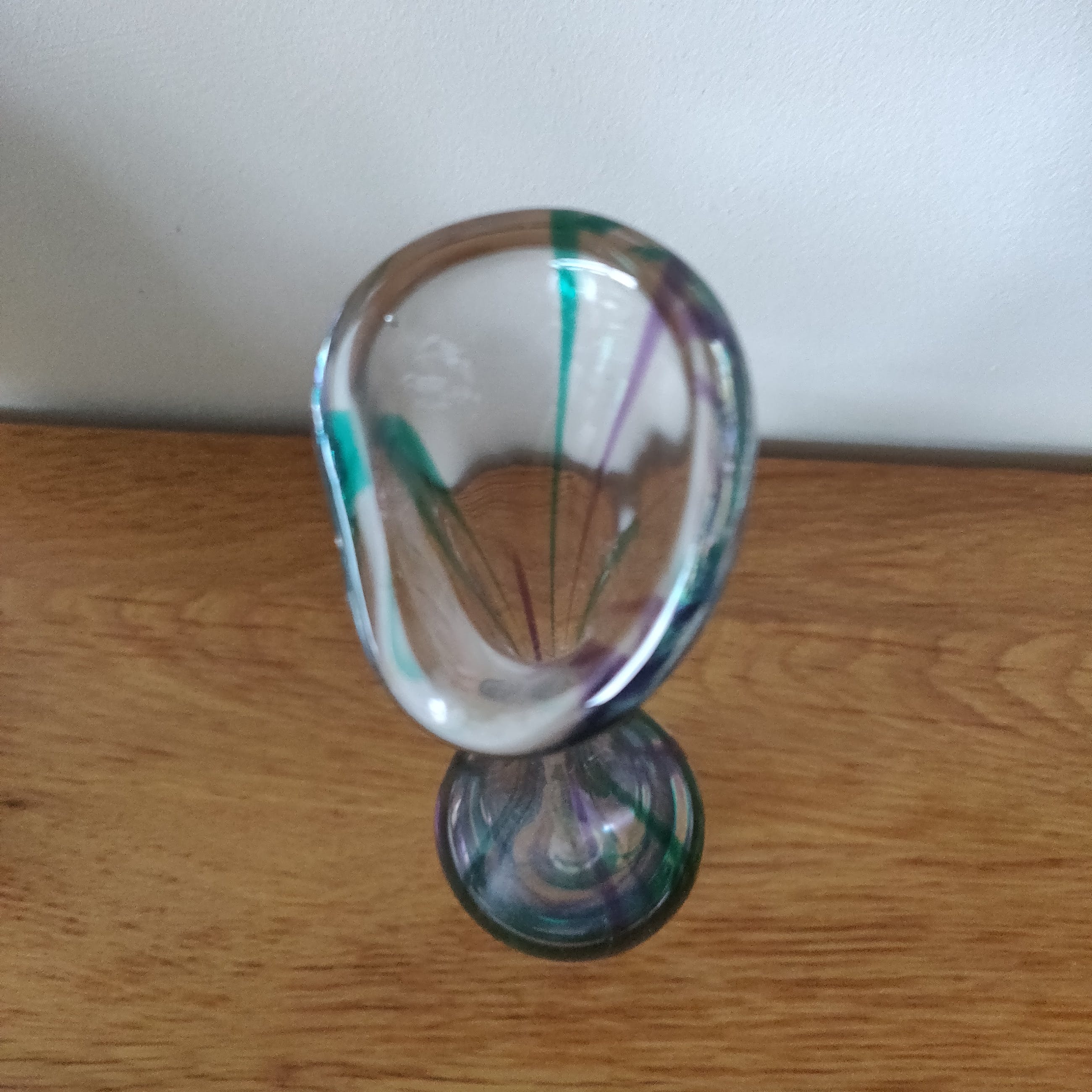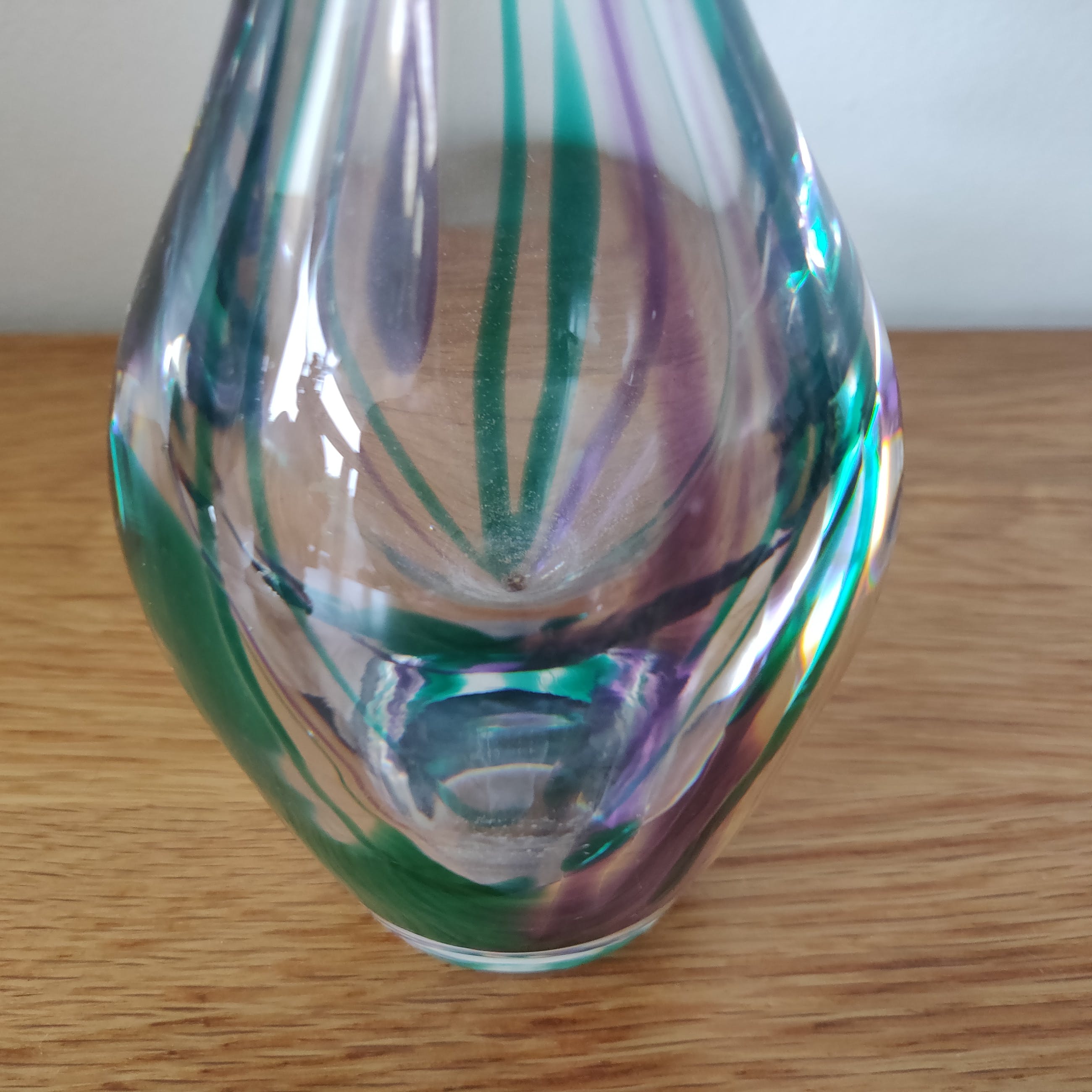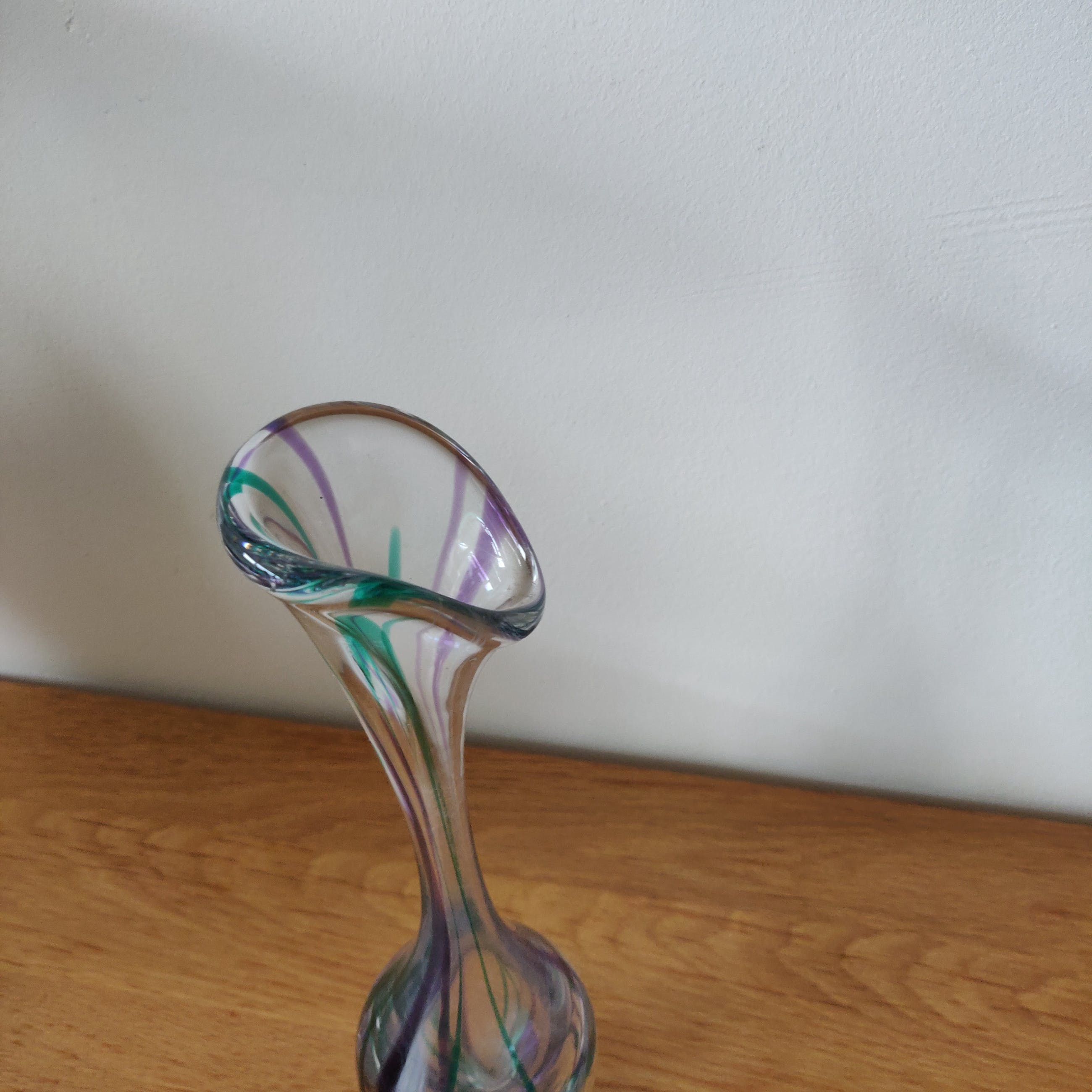 Prachtige elegante kristallen vaas uit 1979 van Max Verboeket met mooie hals en prachtige kleuren. Gesigneerd in de voet van de vaas. Het betreft een middelgroot model van 27 cm hoog en 7 cm breed.