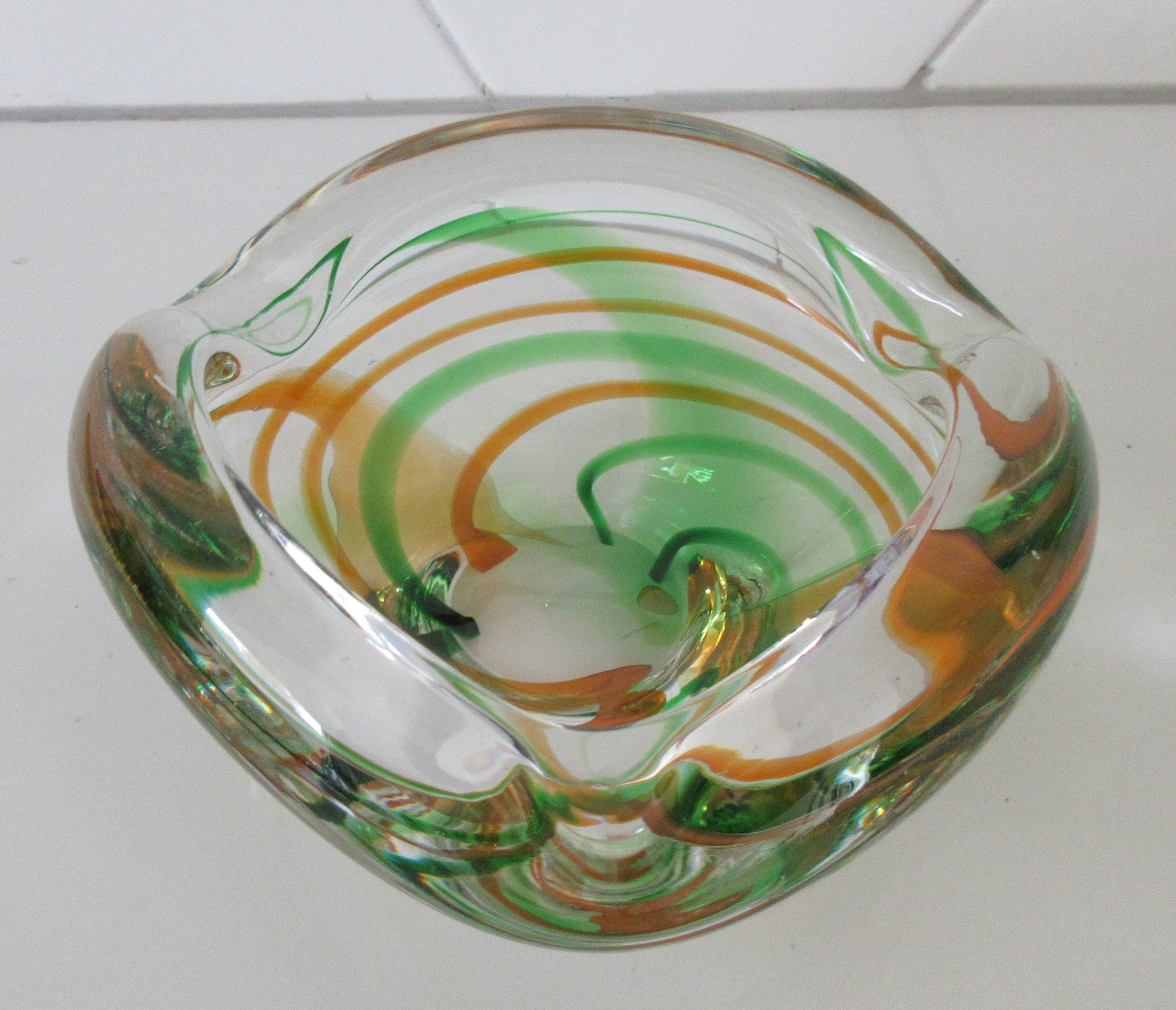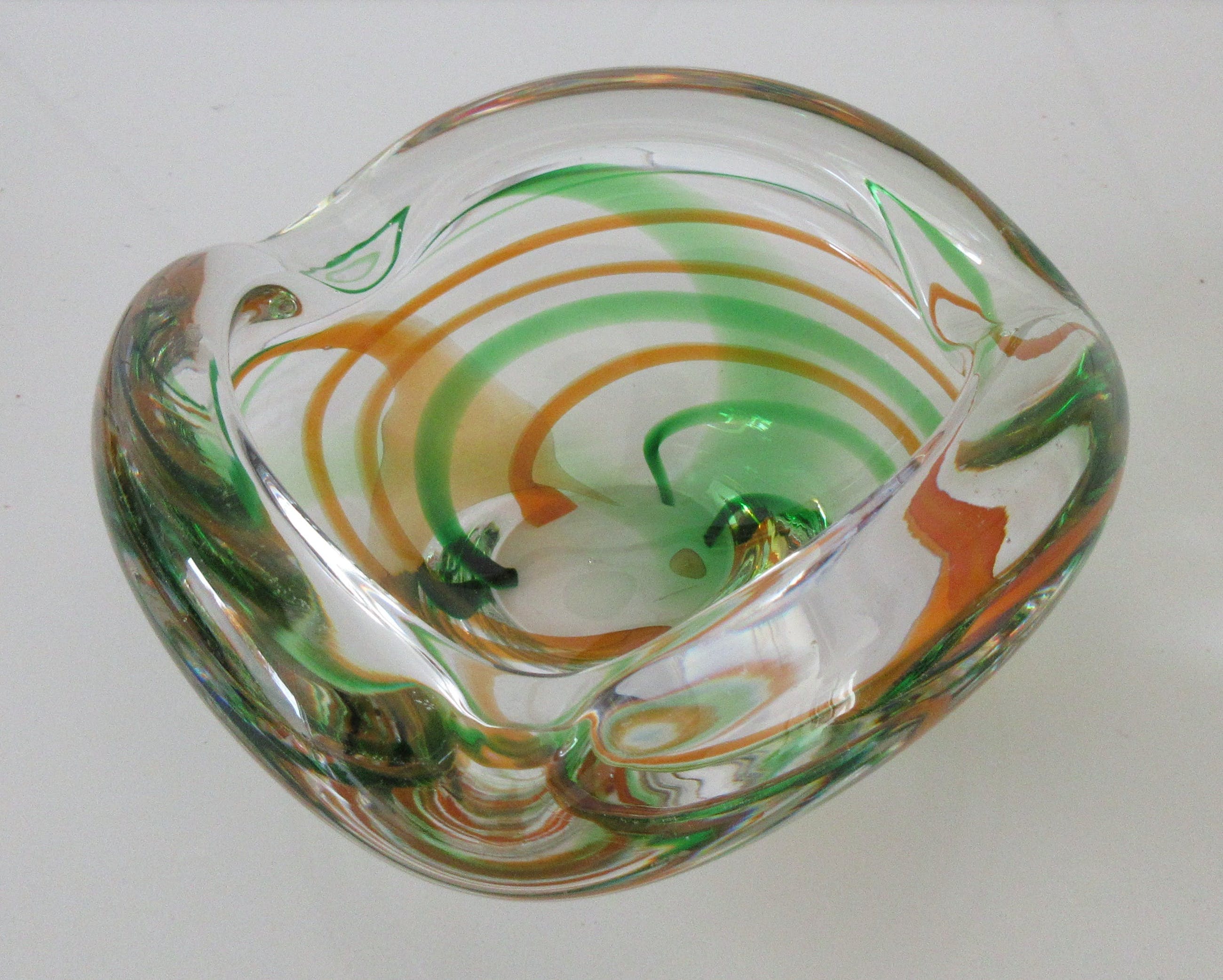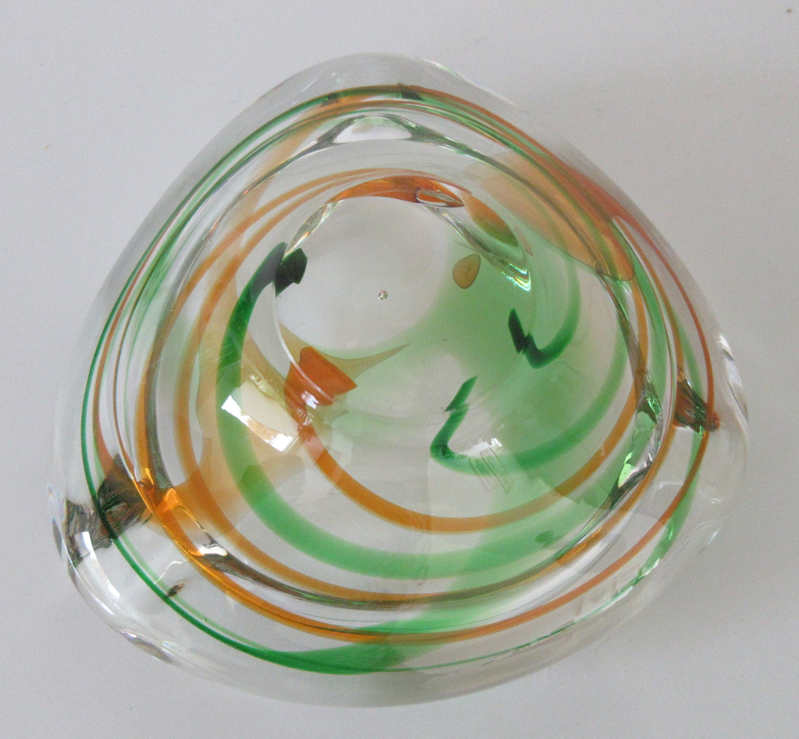 Kristalunie Maastricht - Blank kristallen asbak met groene en oranje slingers. Ontwerp Max Verboeket in de jaren'60. In prima onbeschadigde conditie. Niet gesigneerd. Dit kan duiden dat deze asbak wat later is gemaakt toen de Kristalunie inmiddels een onderdeel was geworden van de Royal Leerdam groep.