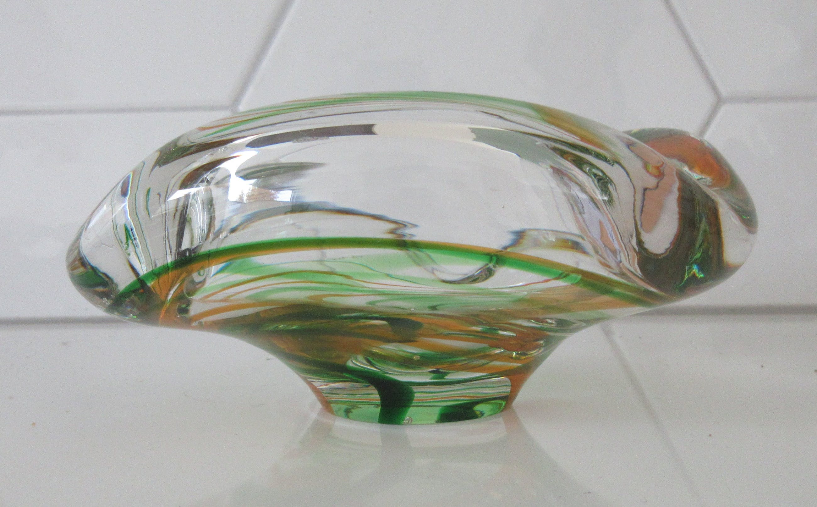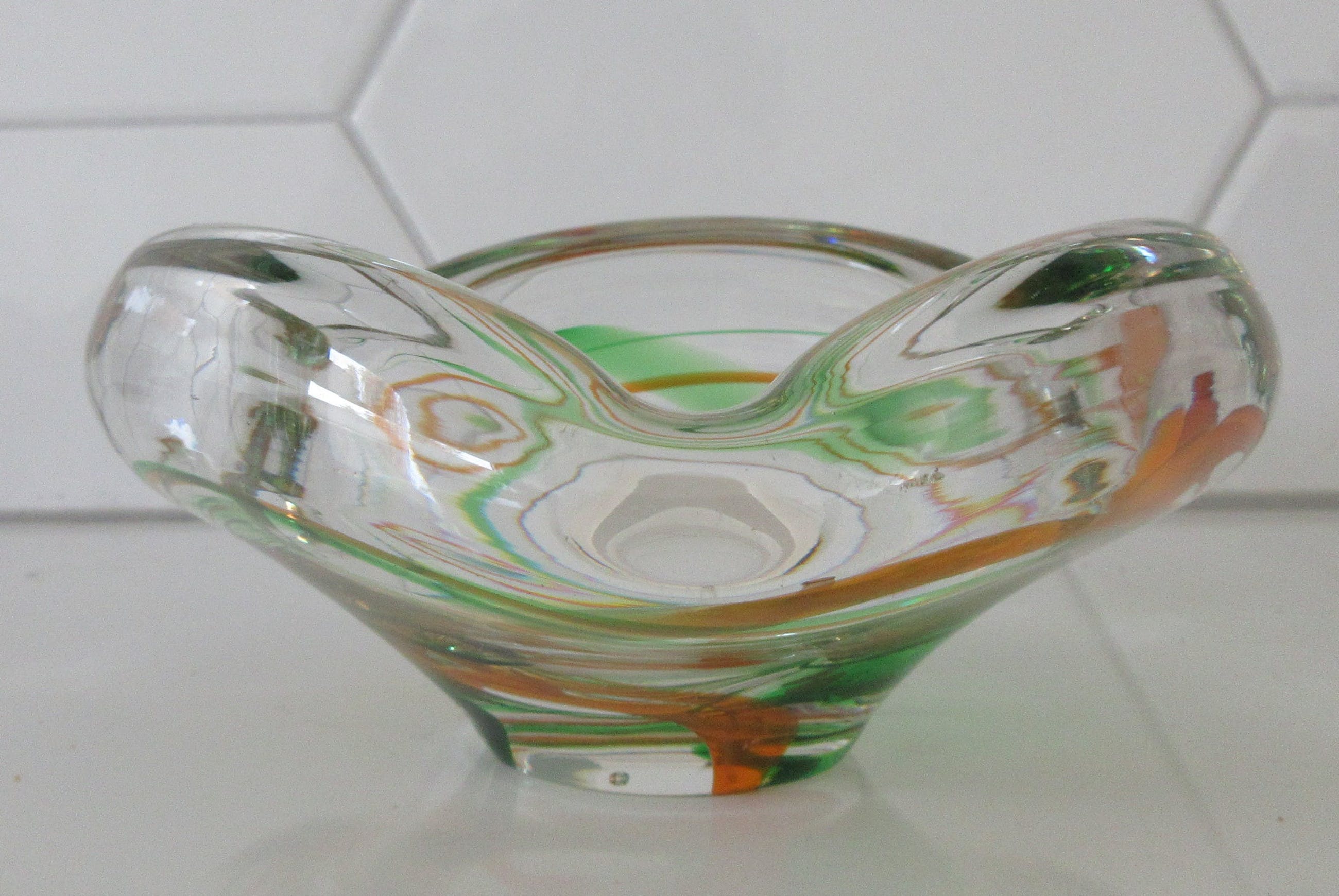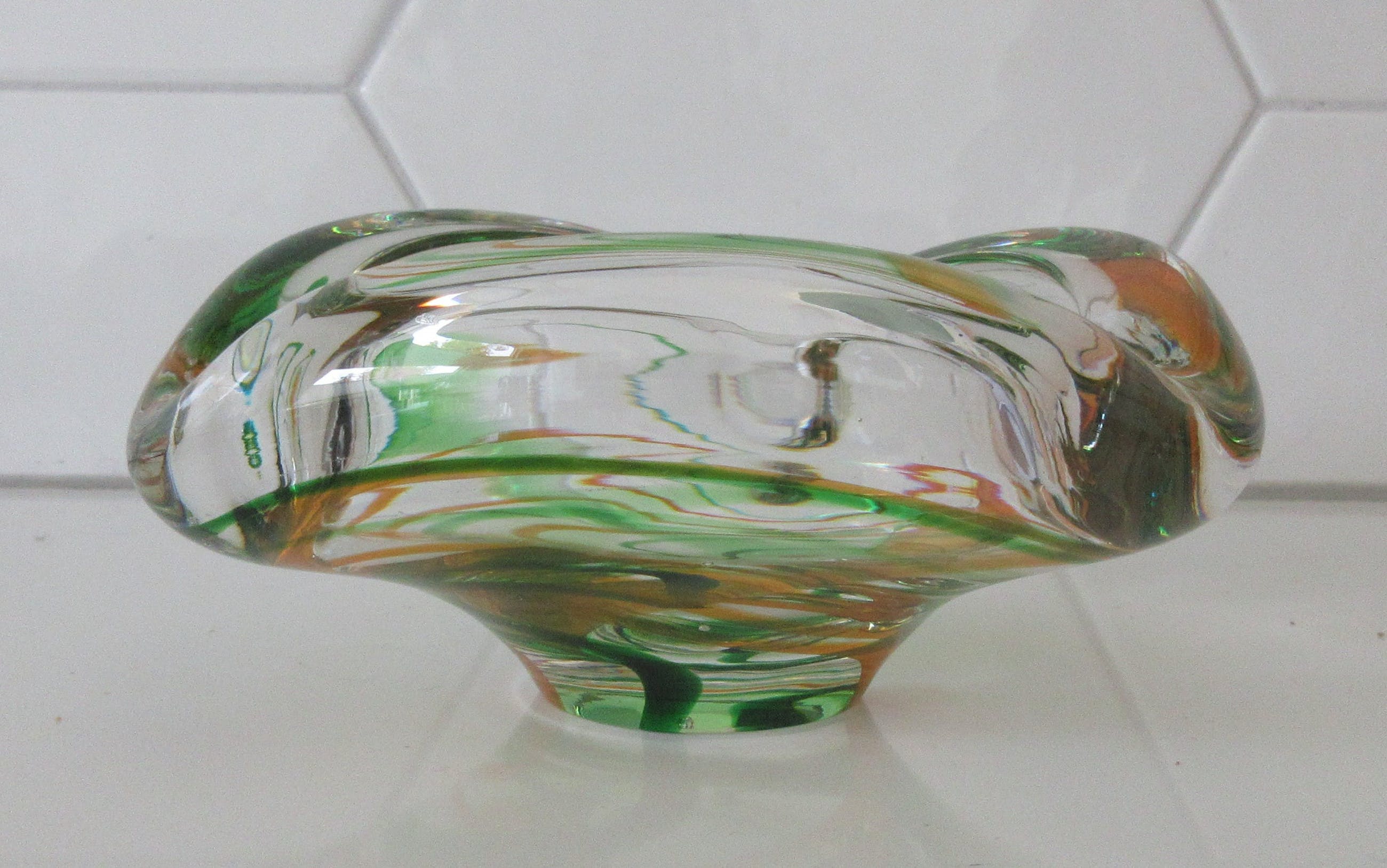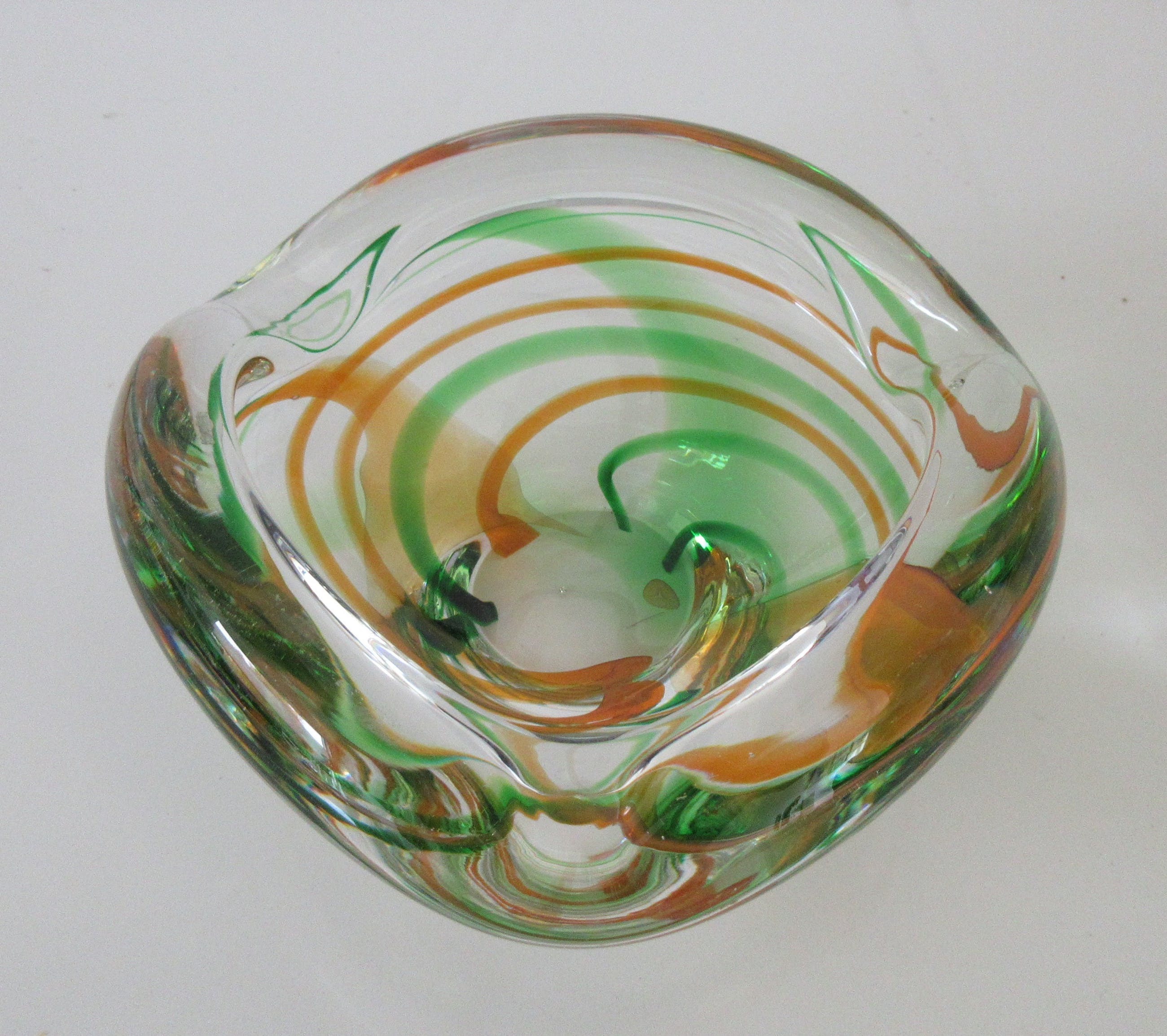 Kristalunie Maastricht - Blank kristallen asbak met groene en oranje slingers. Ontwerp Max Verboeket in de jaren'60. In prima onbeschadigde conditie. Niet gesigneerd. Dit kan duiden dat deze asbak wat later is gemaakt toen de Kristalunie inmiddels een onderdeel was geworden van de Royal Leerdam groep.