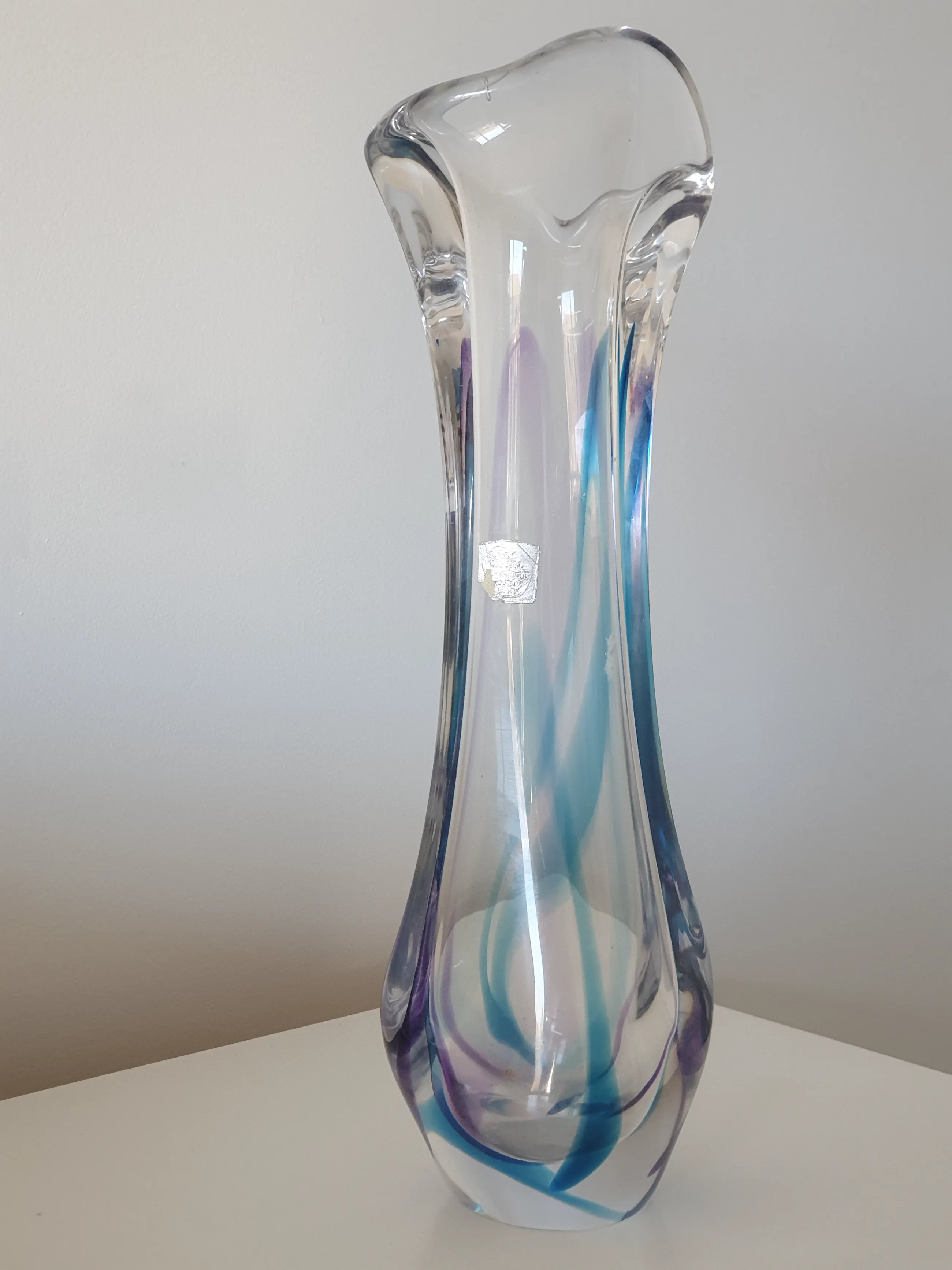 Een blank glazen vaas met twee kleur slierten in paars en blauw naar ontwerp van Max Verboeket voor Kristalunie Maastricht. Op sticker staat Crystal Maastricht Holland.