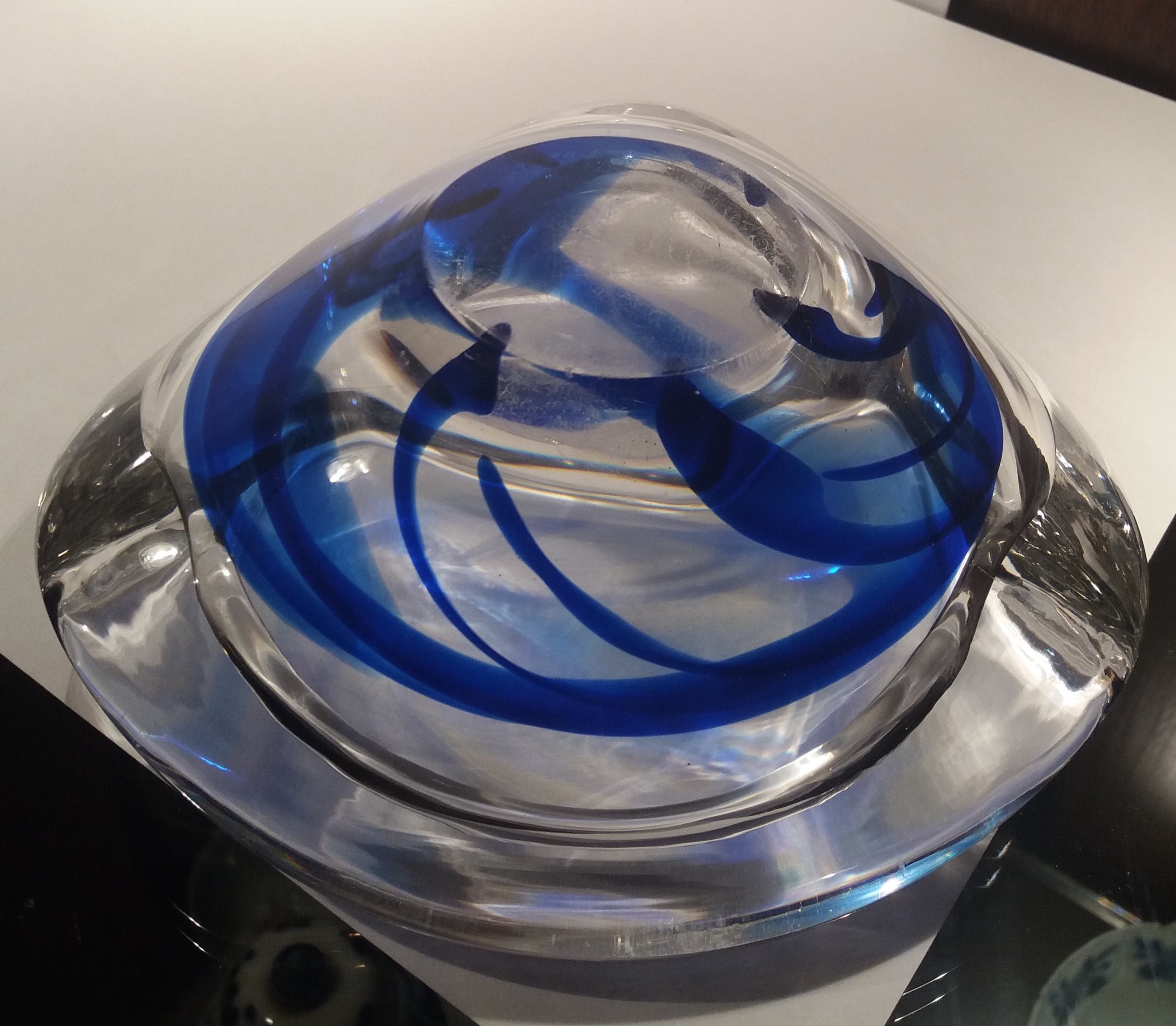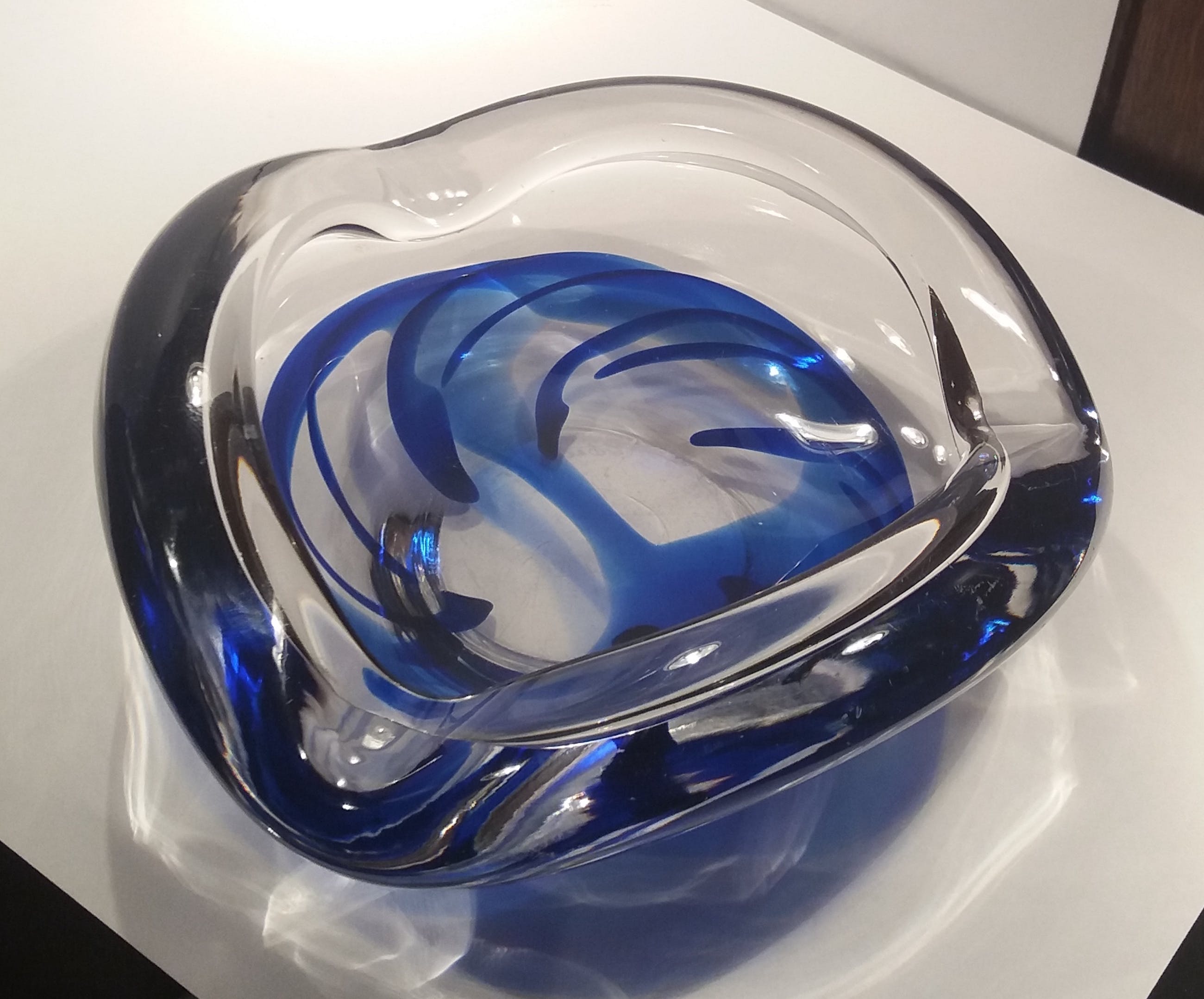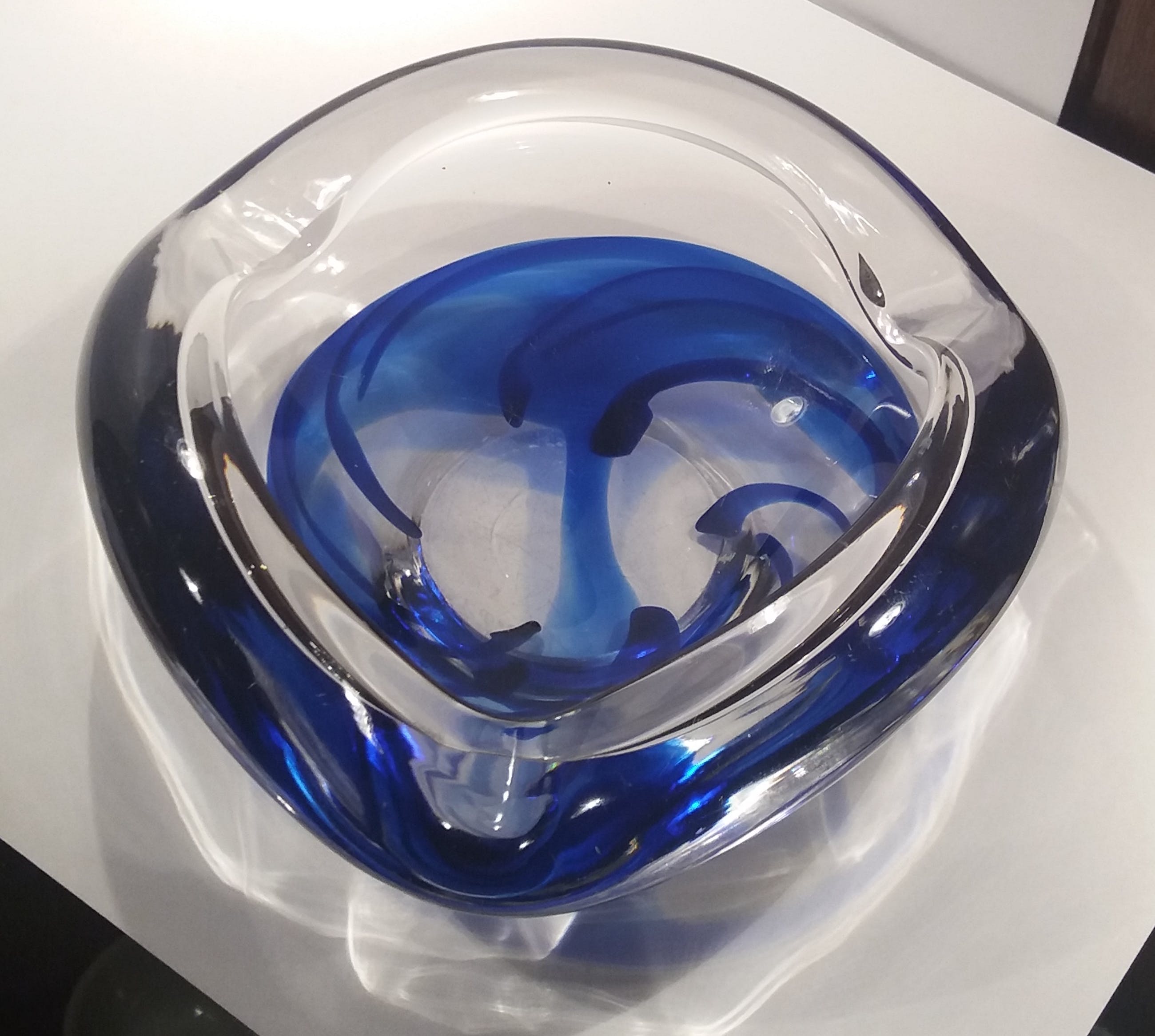 Max Verboeket kleuren glazen asbak, gesigneerd Maastricht ca.1960. Dikwandig glazen asbak met ingesloten paarse slierten. De asbak is onbeschadigd maar heeft lichte gebruik sporen aan de onderkan Geen chipjes.. Afm. Diameter ca 13 cm en 5 . cm hoog. word zorgvuldig verpakt