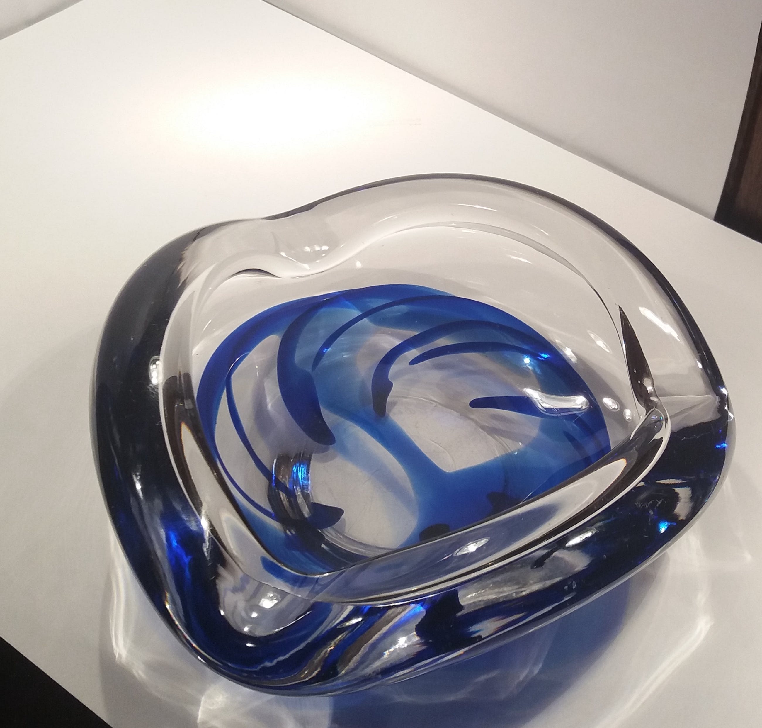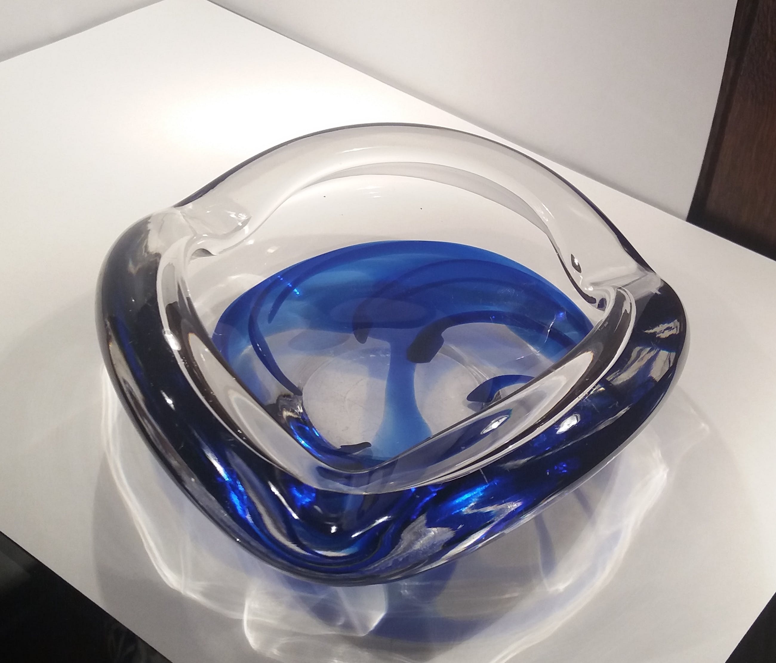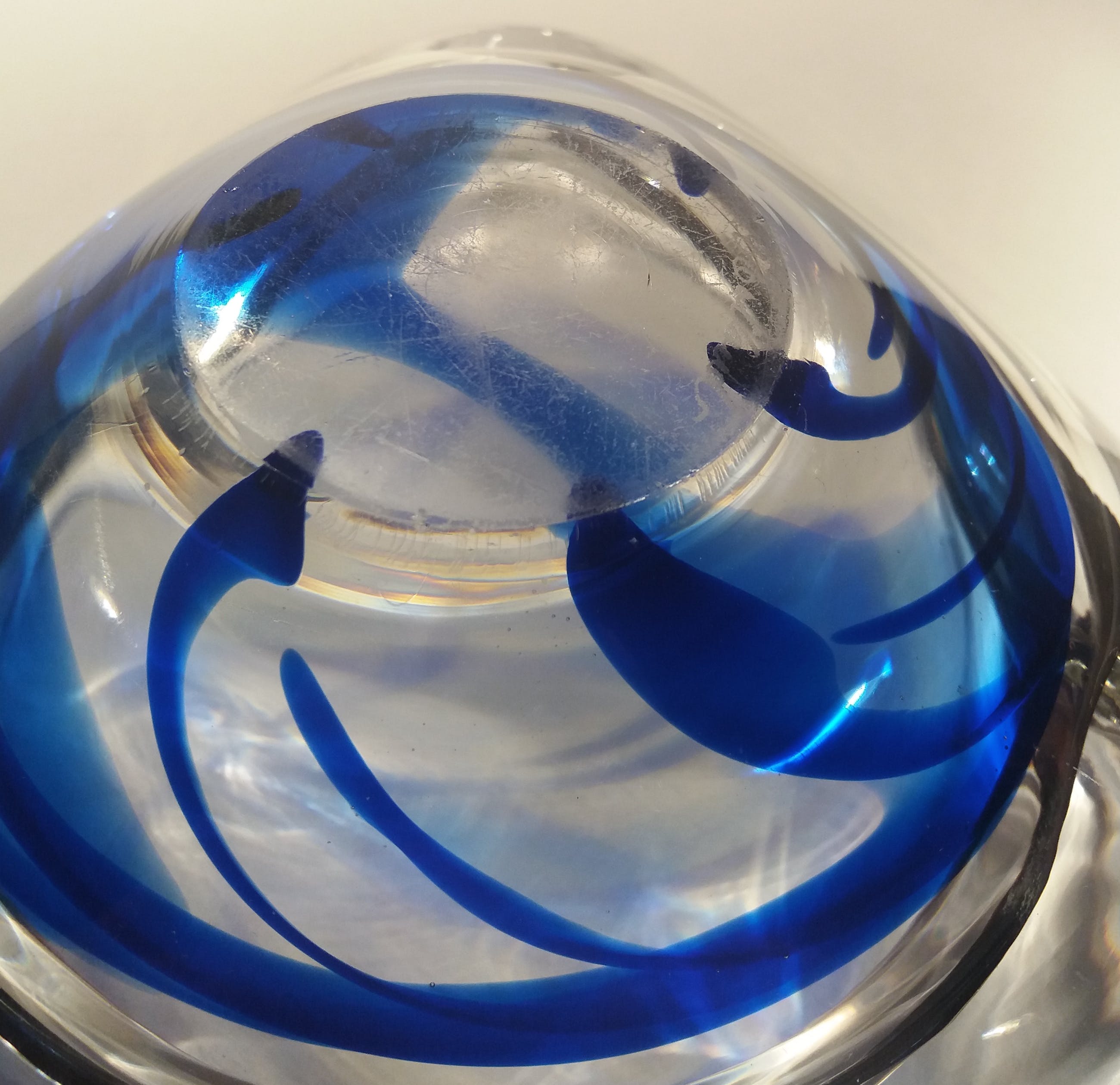 Max Verboeket kleuren glazen asbak, gesigneerd Maastricht ca.1960. Dikwandig glazen asbak met ingesloten paarse slierten. De asbak is onbeschadigd maar heeft lichte gebruik sporen aan de onderkan Geen chipjes.. Afm. Diameter ca 13 cm en 5 . cm hoog. word zorgvuldig verpakt