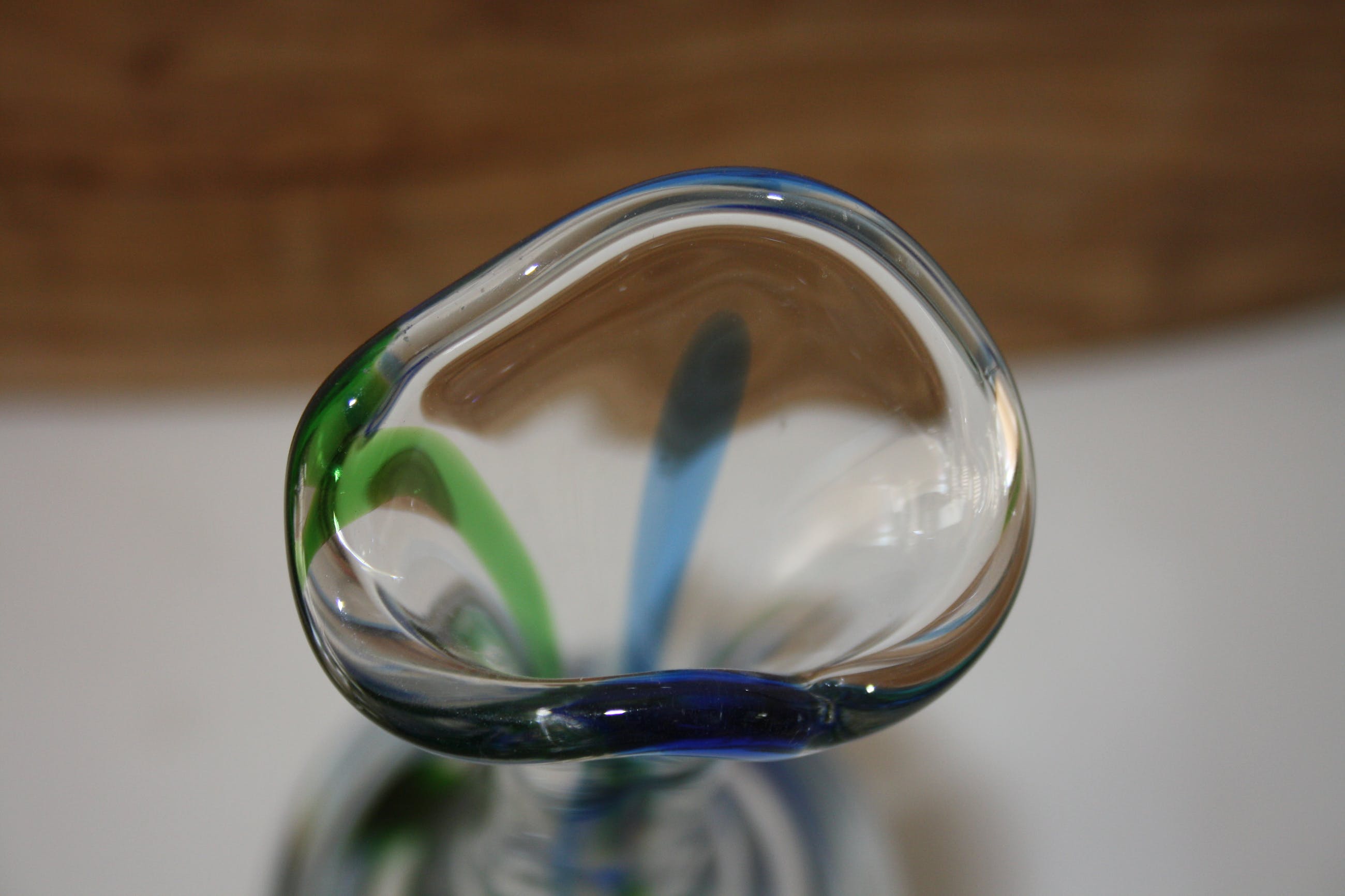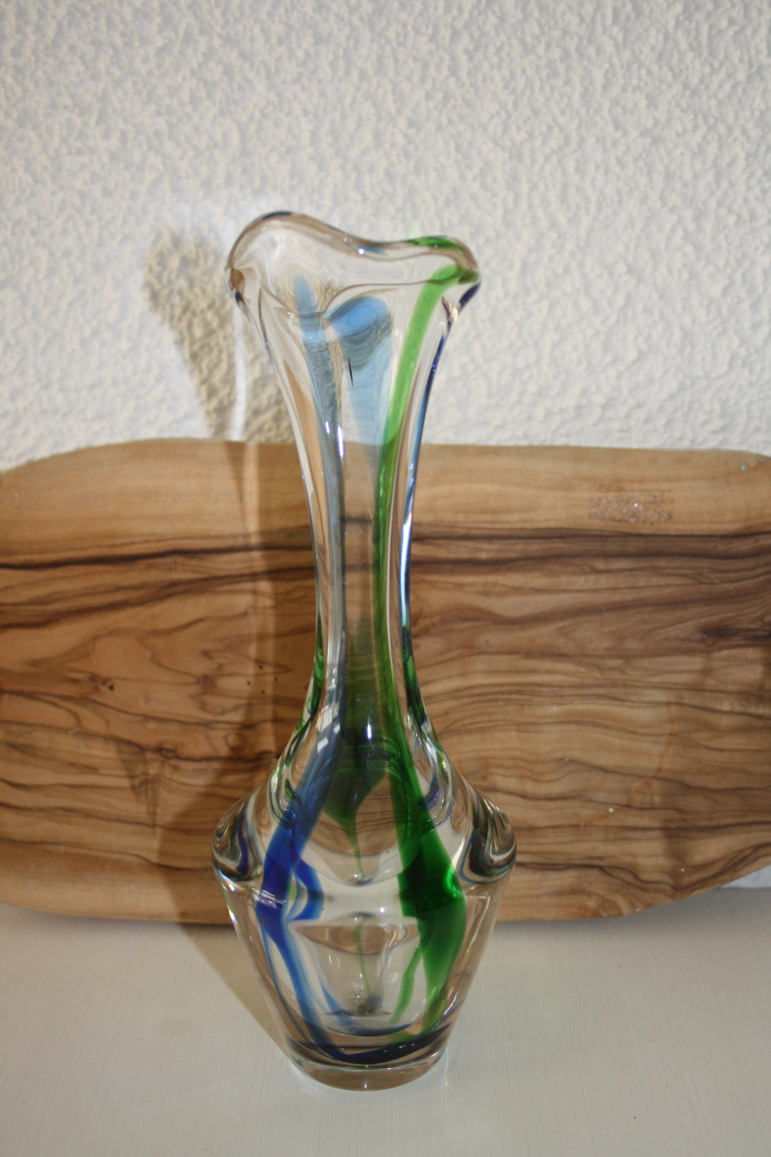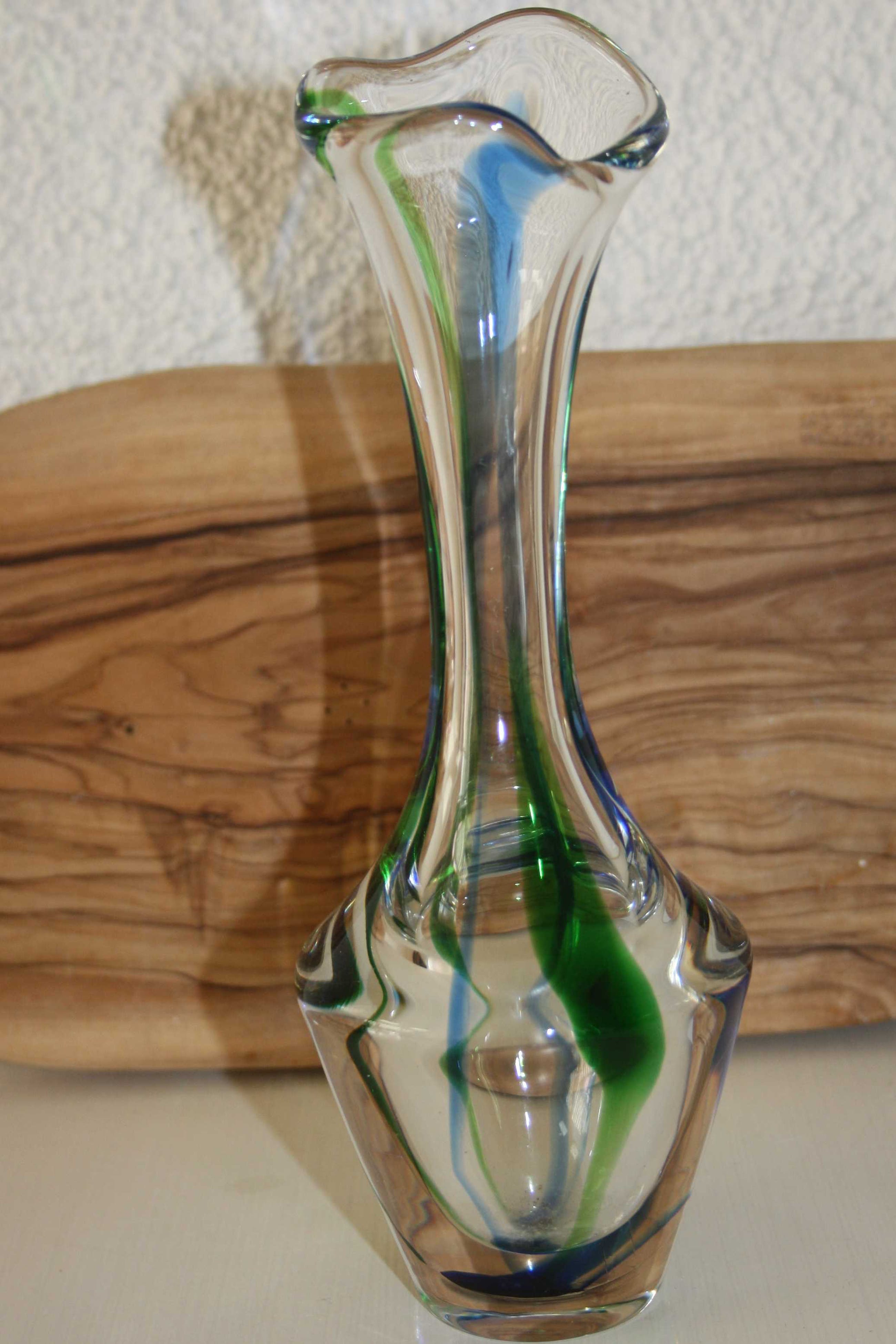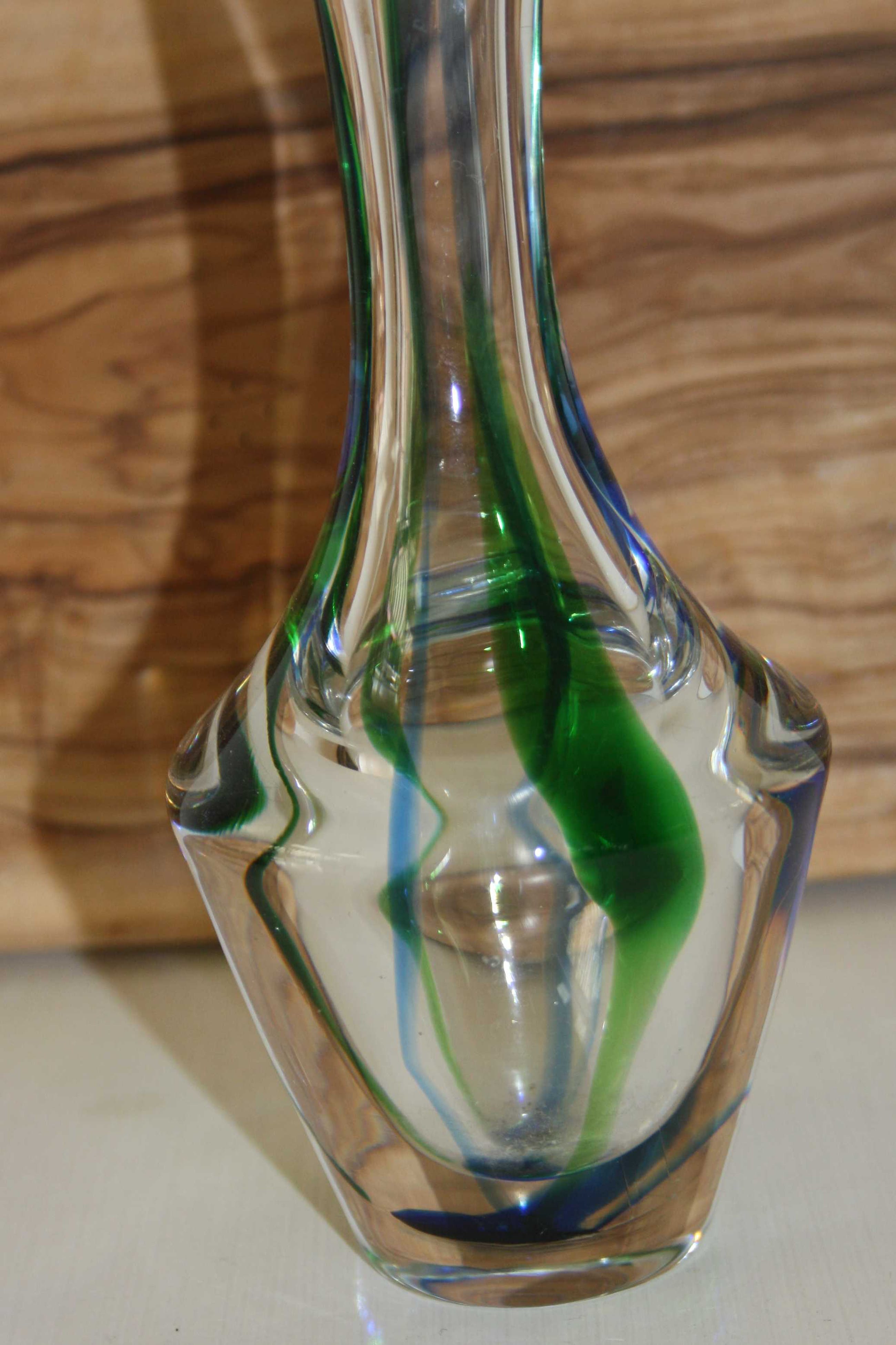 Vervaardiger: Max Verboeket Kleuren: Transparant groen en blauw Datering: ca 1960 Fabriek of studio: Maastricht Gesigneerd: Max Verboeket Maastricht X-12 Conditie: in goede staat