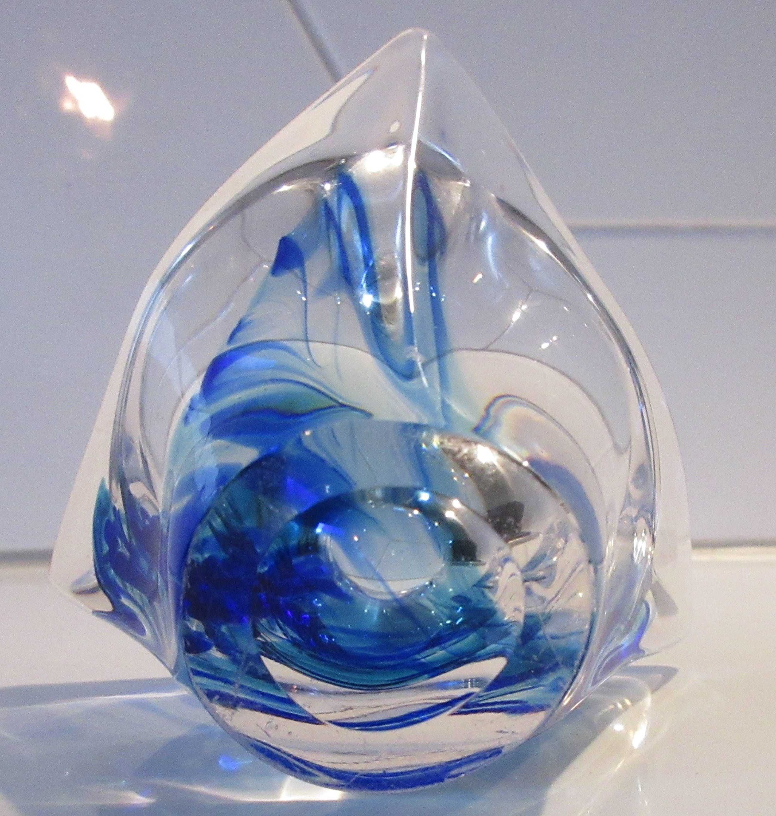 Mooi klein kunstglazen asbakje met blauwe slingers, ontwerp en uitvoering Max Verboeket voor de Kristalunie Maastricht. Niet gemerkt. In prima onbeschadigde conditie.