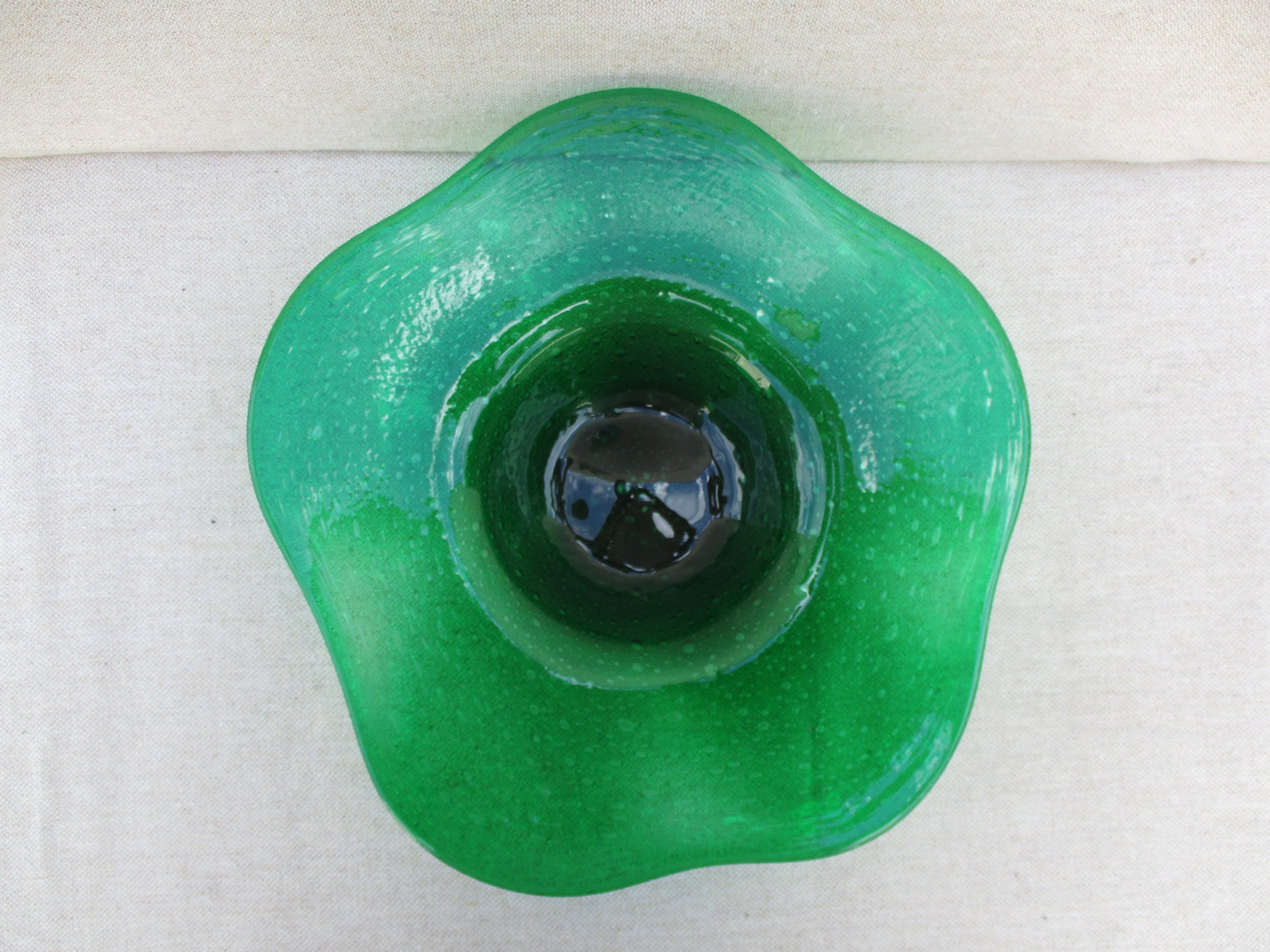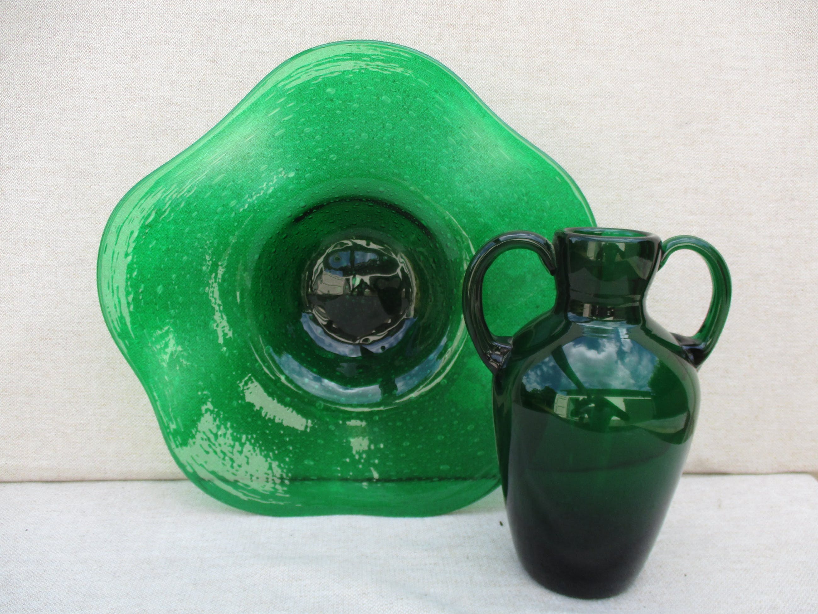 De schaal 34 cm doorsnee, onderop gemerkt. De vaas is 21 cm hoog en ook gemerkt. Geen