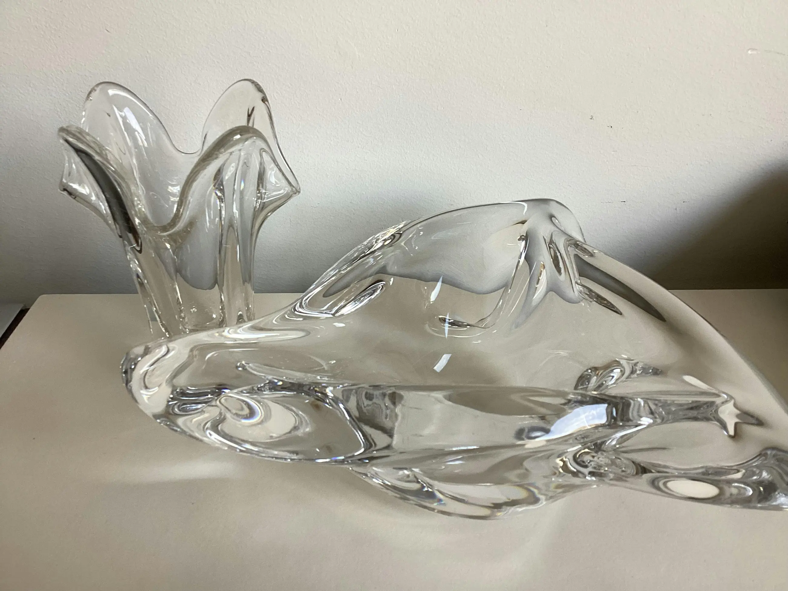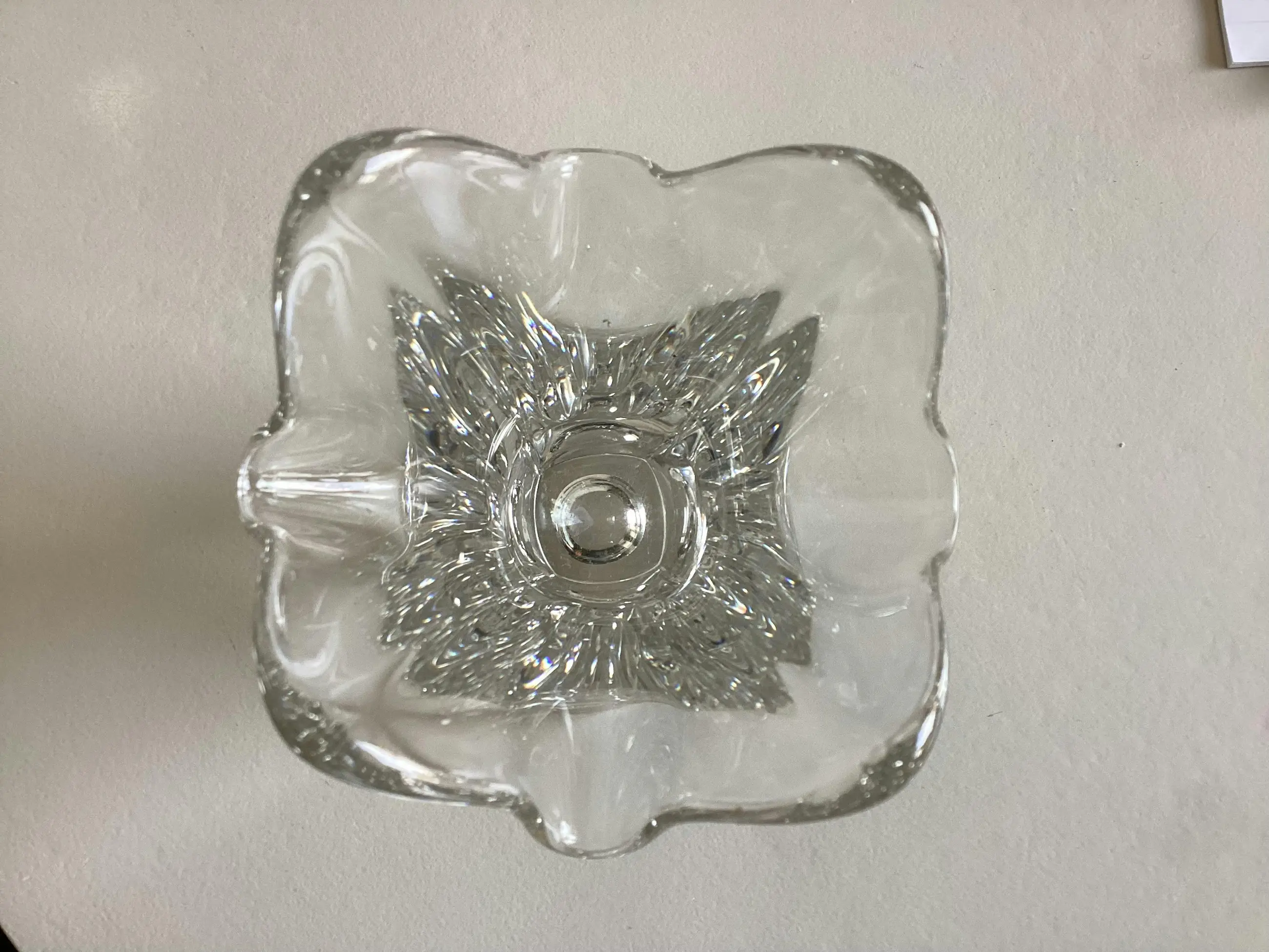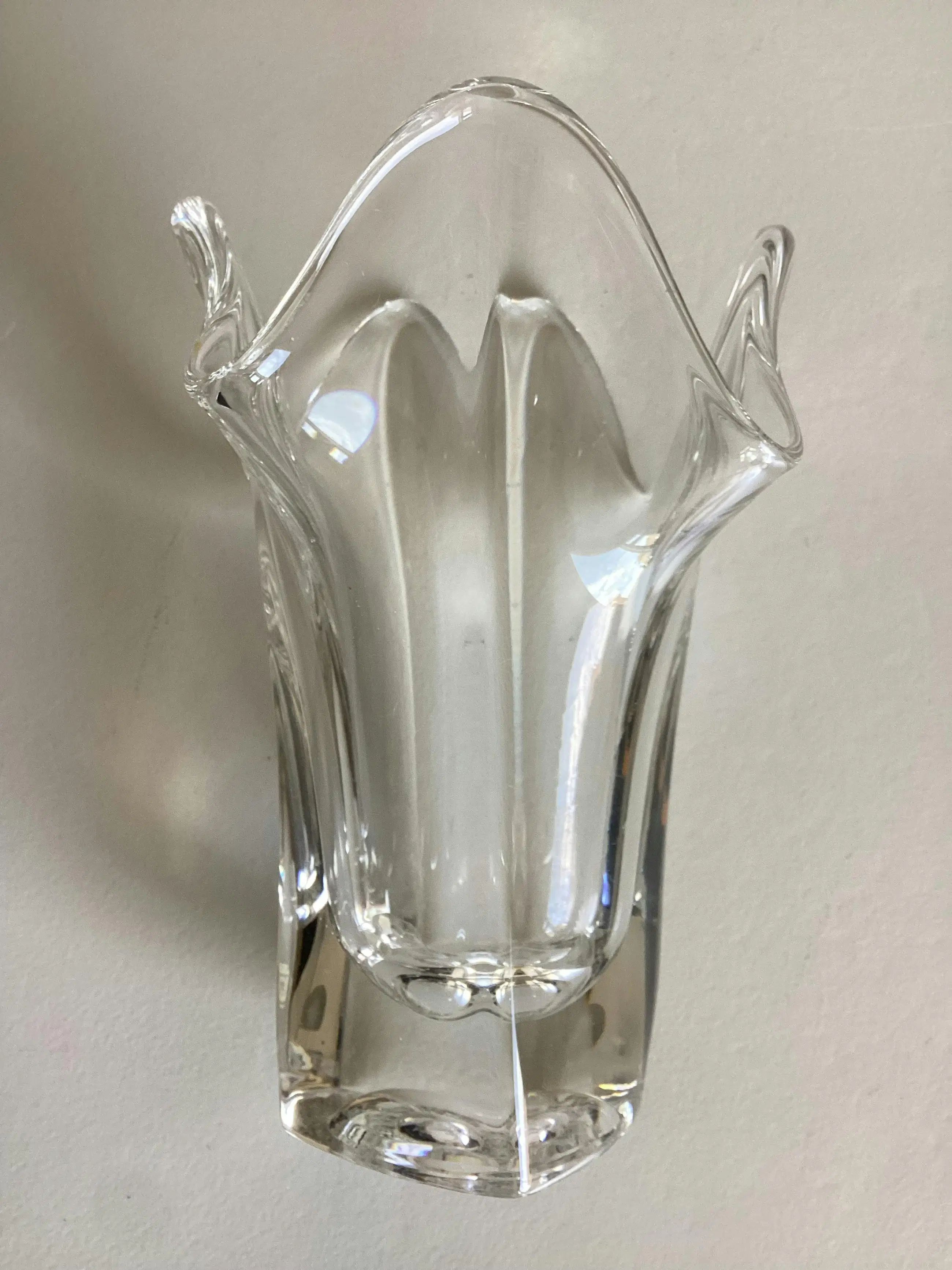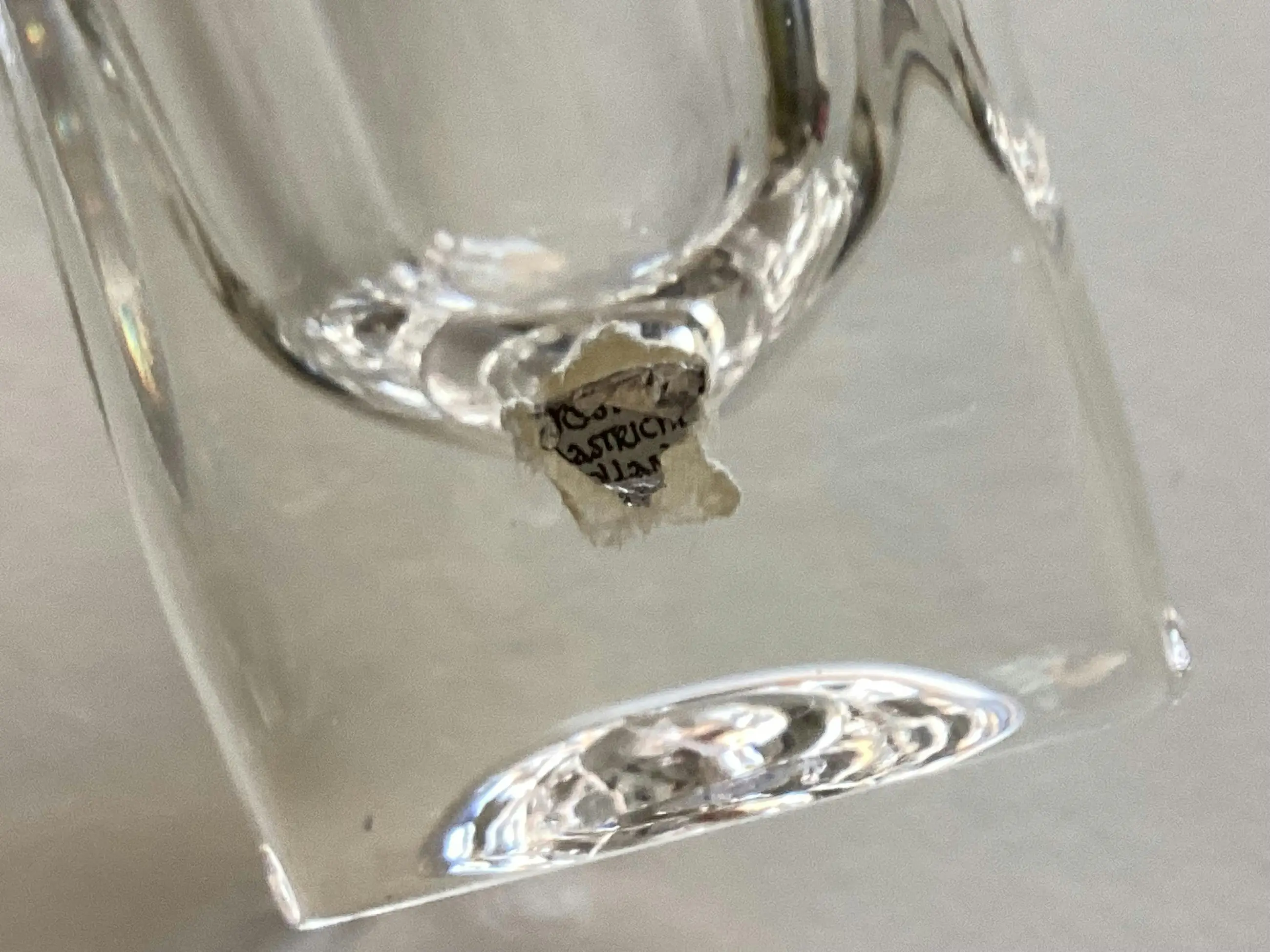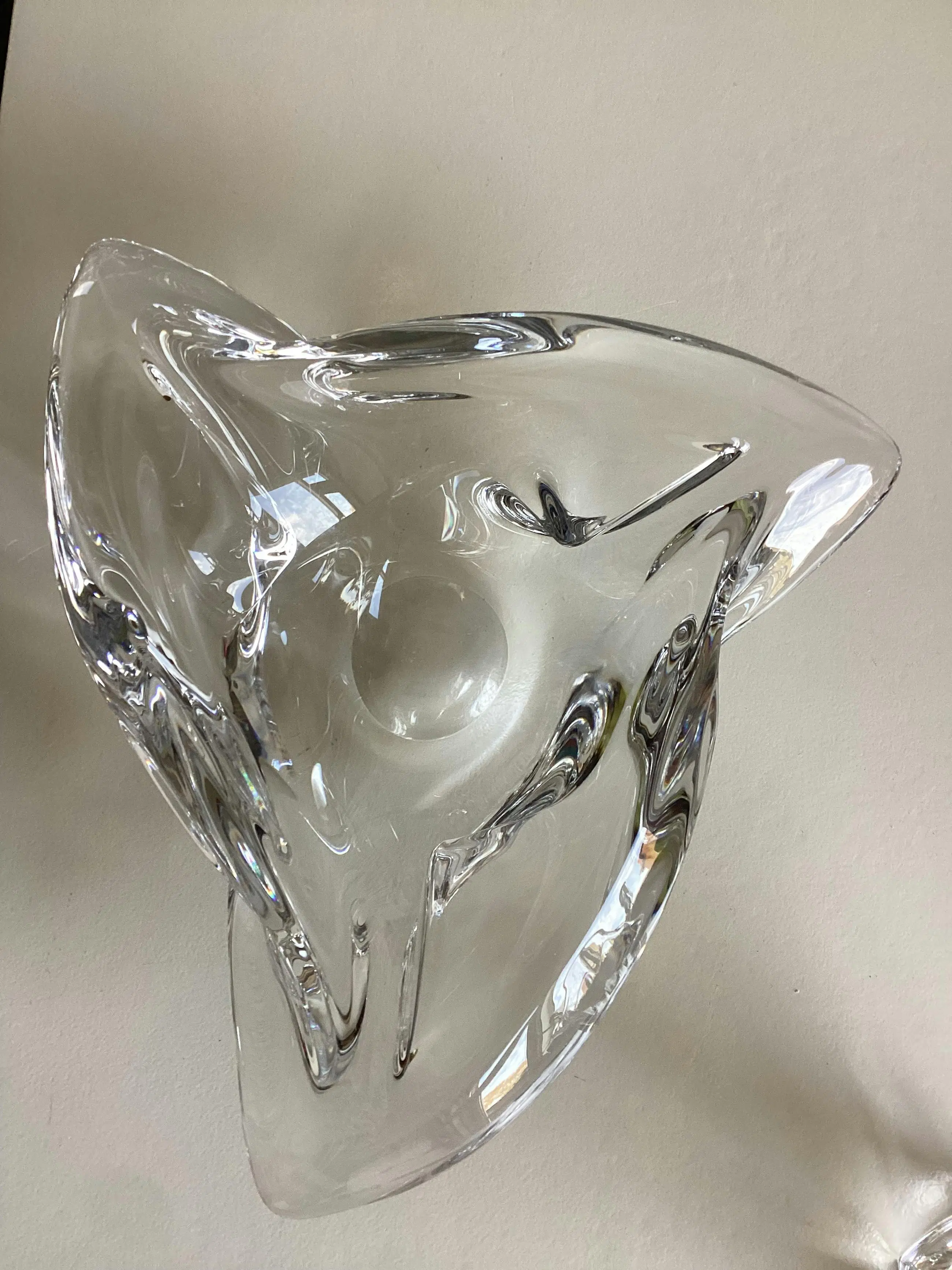 Set van 2 glasobjecten van Max Verboeket voor Kristalunie Maastricht. Driehoekige massieve glazen schaal - 27x24x9 cm. Gewicht 4411 gr; niet gelabeld. Gelobde transparante vaas met vier bladen - 11x11x16 cm. Gewicht 865 gr. stuk label aanwezig.