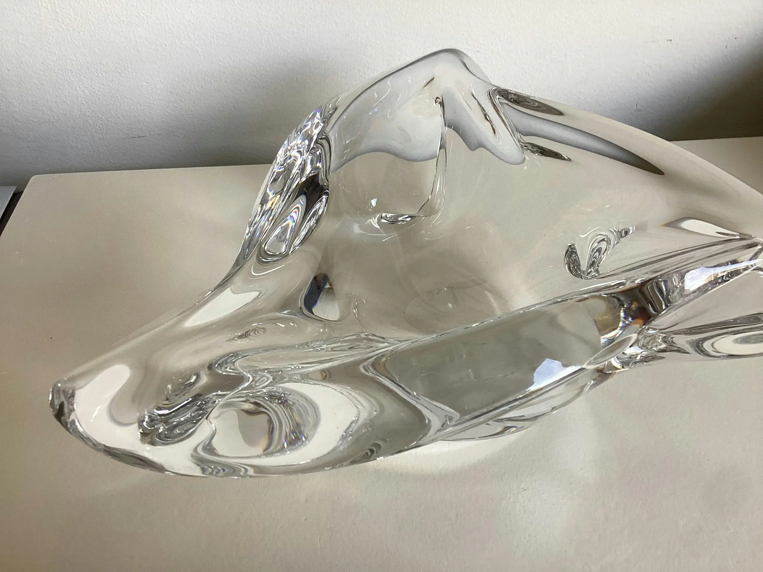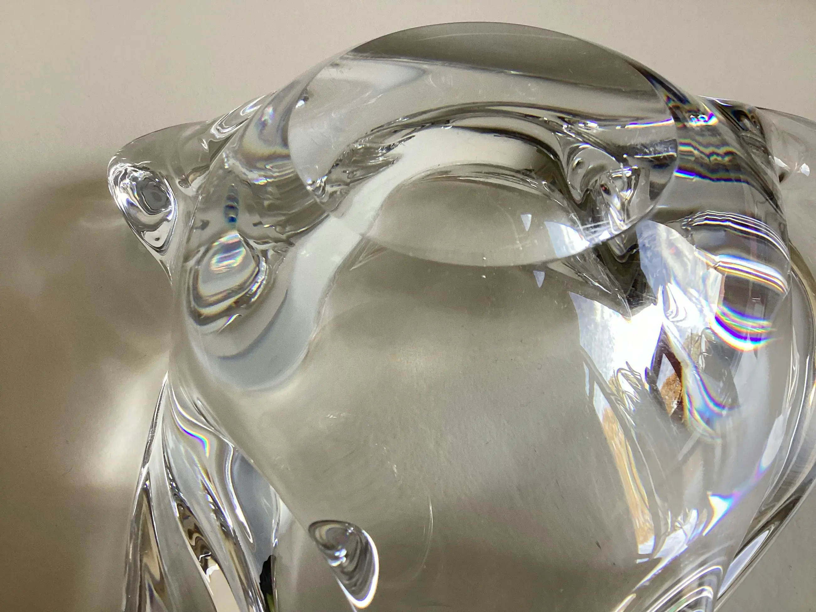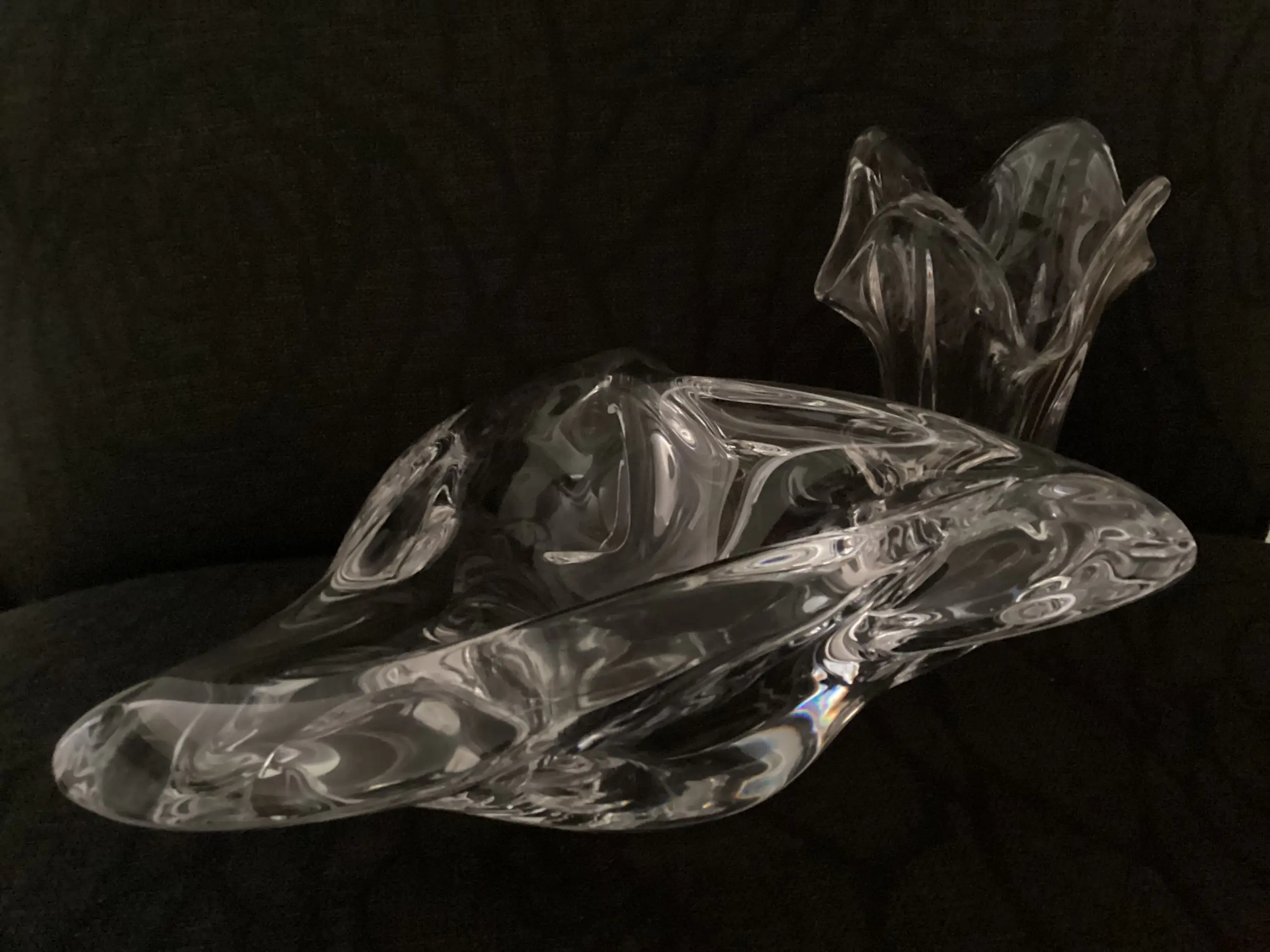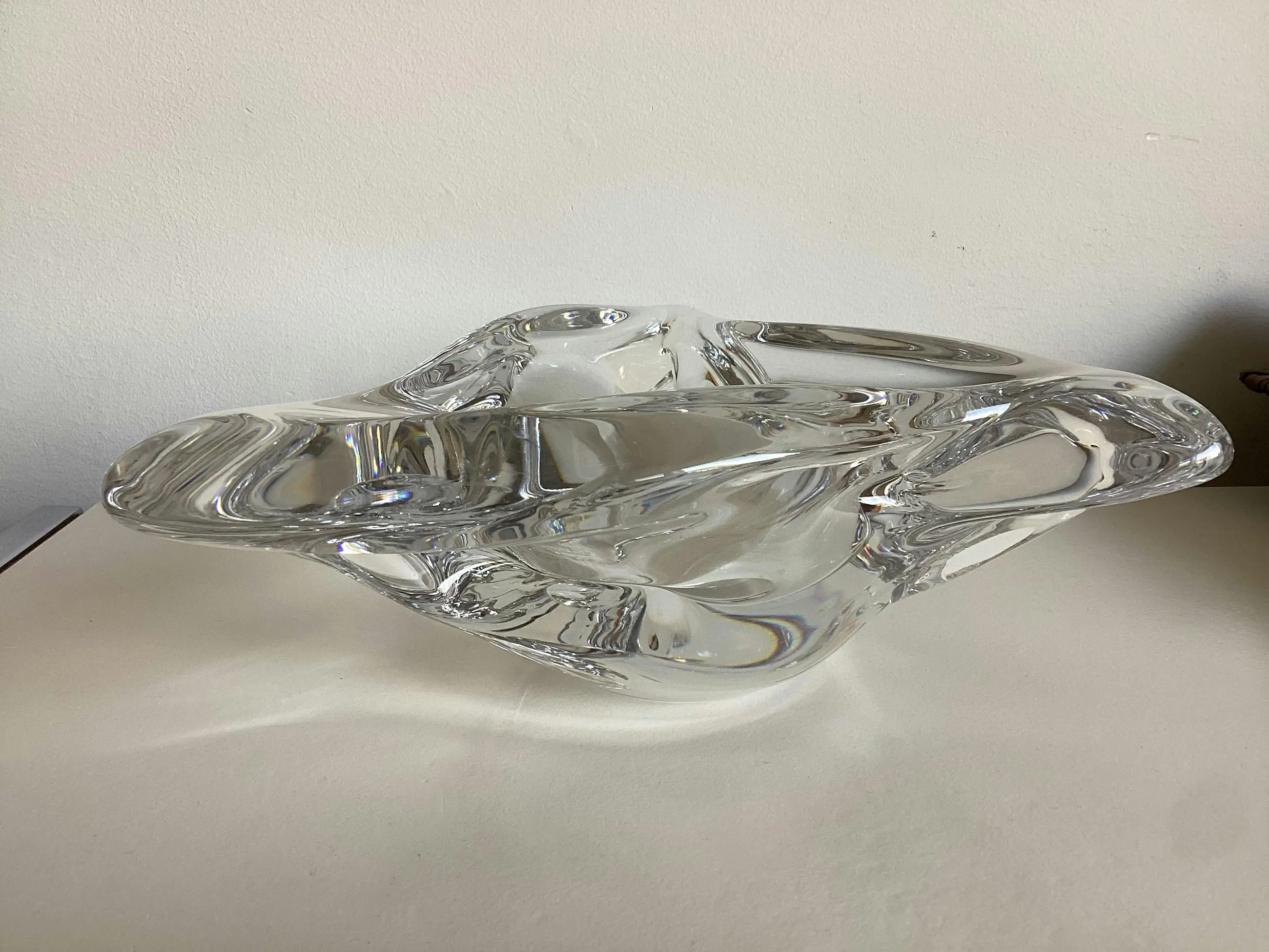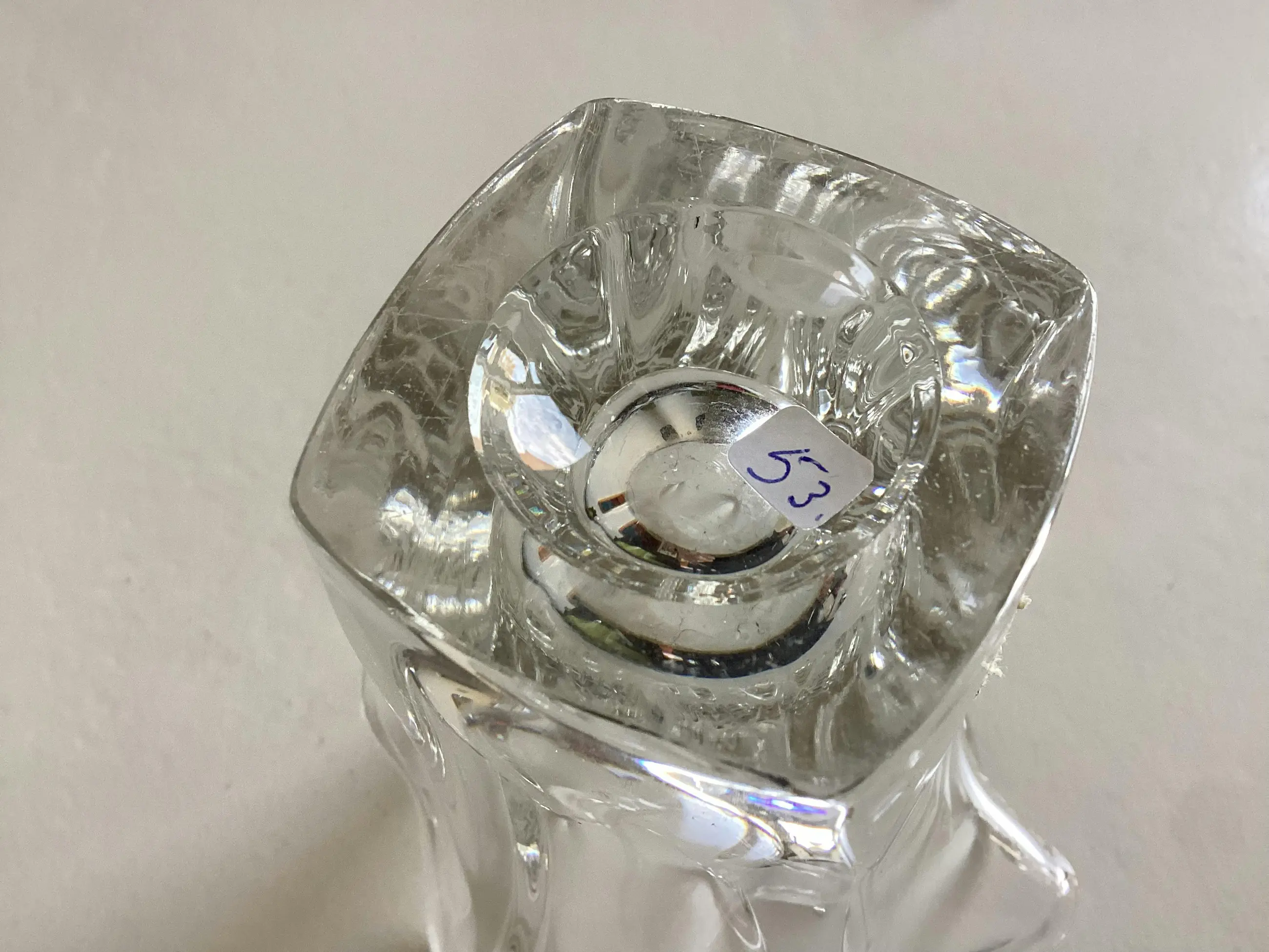 Set van 2 glasobjecten van Max Verboeket voor Kristalunie Maastricht. Driehoekige massieve glazen schaal - 27x24x9 cm. Gewicht 4411 gr; niet gelabeld. Gelobde transparante vaas met vier bladen - 11x11x16 cm. Gewicht 865 gr. stuk label aanwezig.