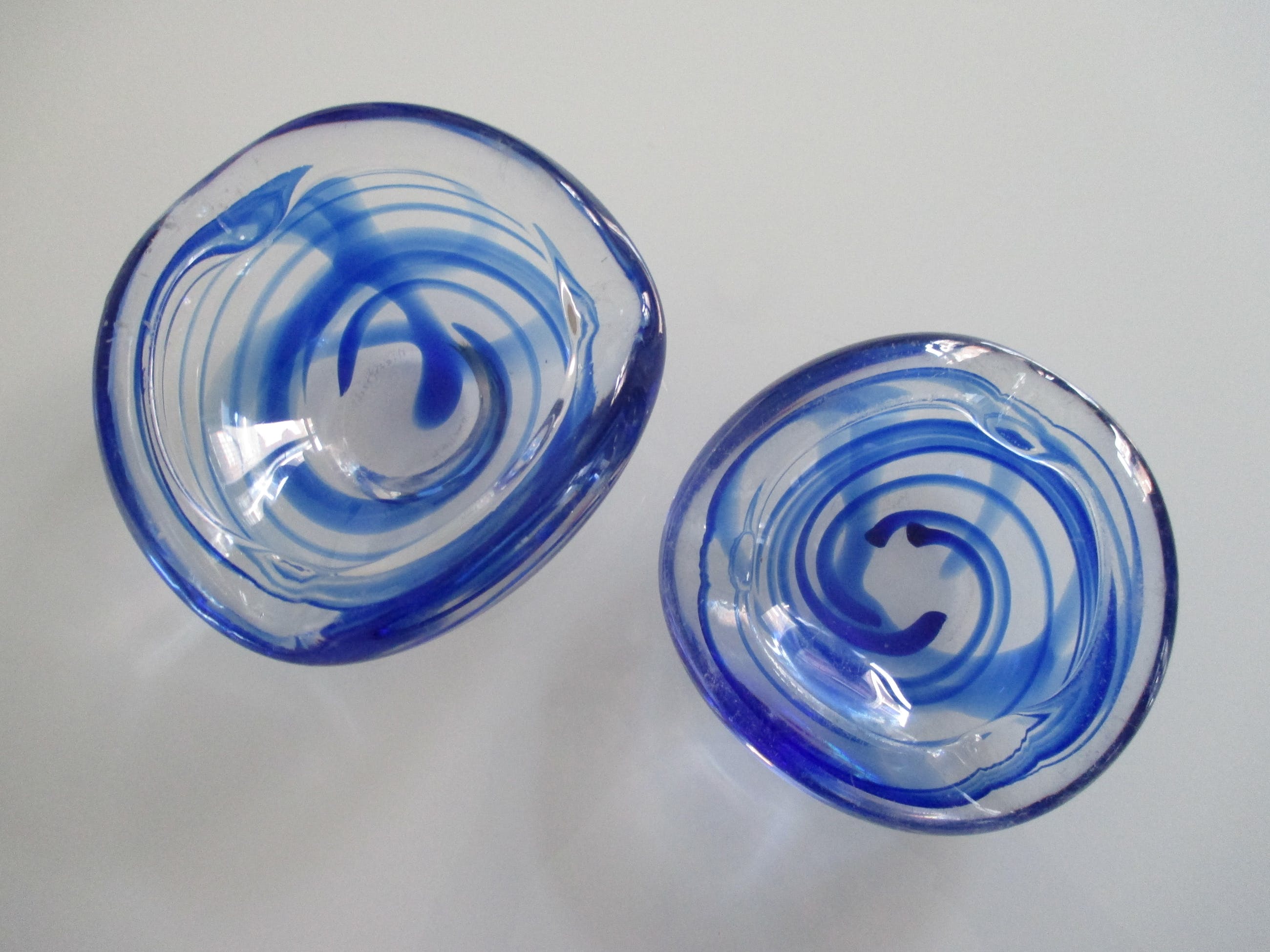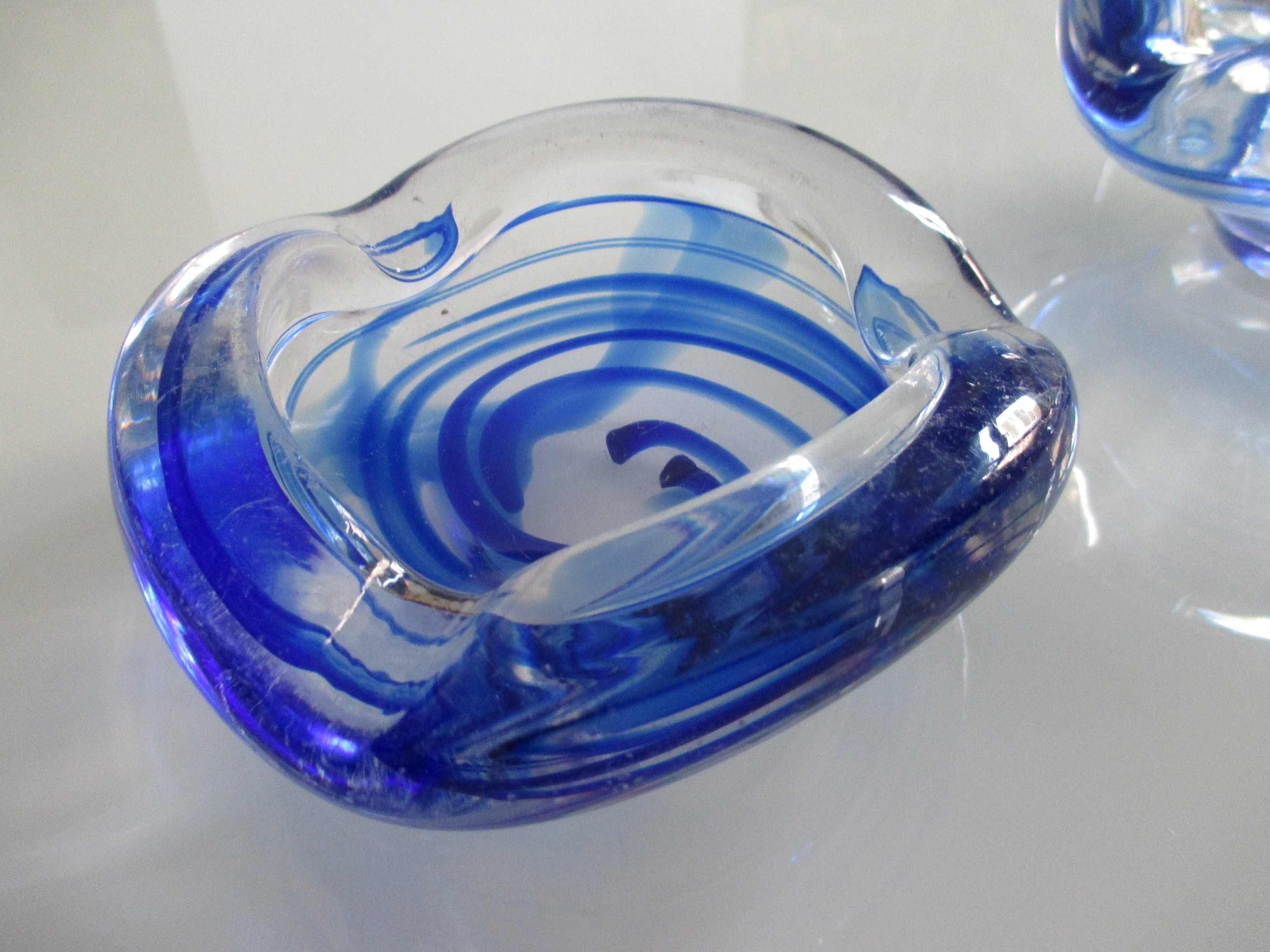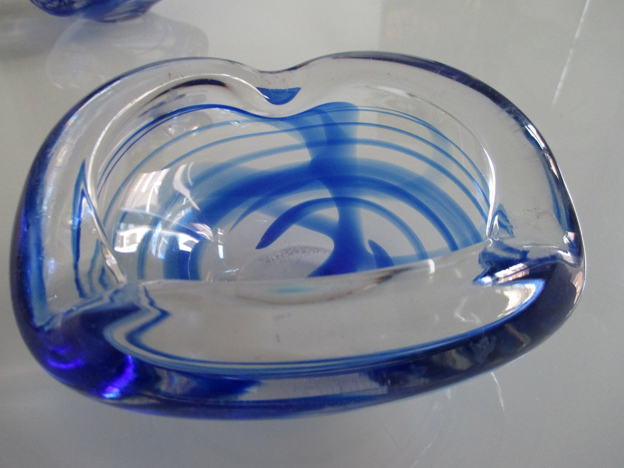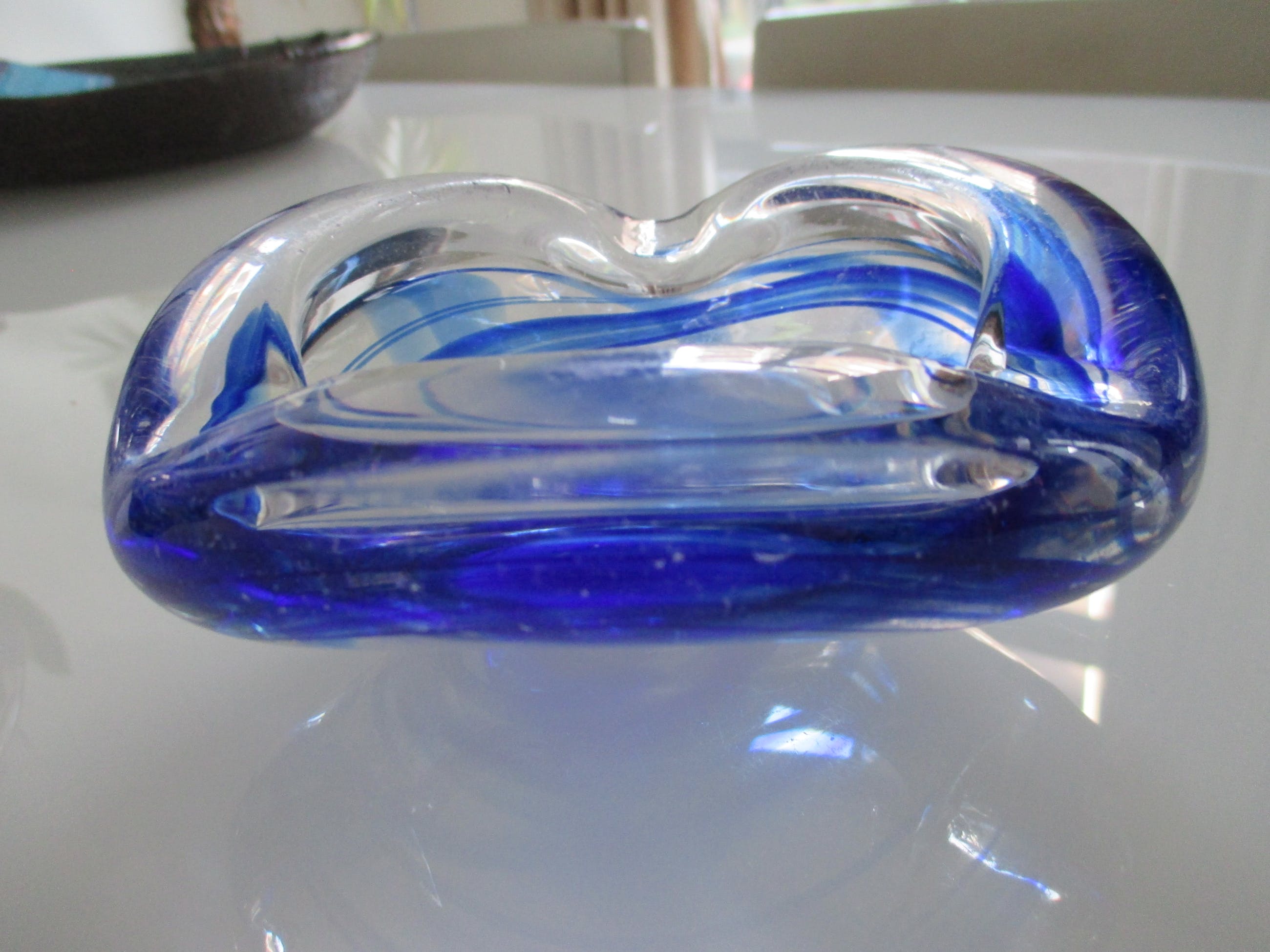 Twee vrij geblazen driehoekige glazen asbak met blauwe kleurlijnen. Afmetingen grootste asbak zijn: 7 x 16 x 16 cm. Afmetingen kleinste asbak zijn: 5 x 12 x 12 cm.