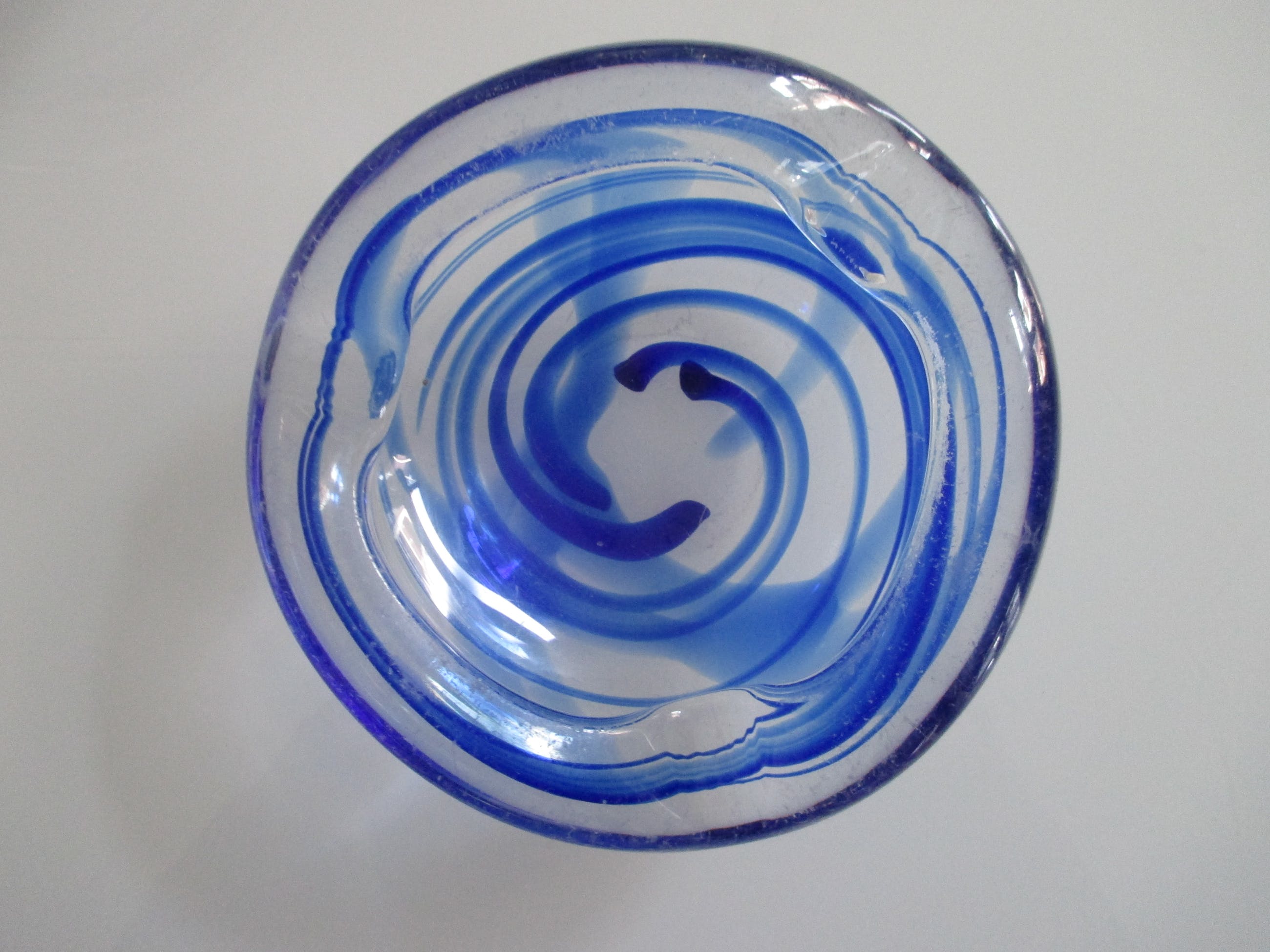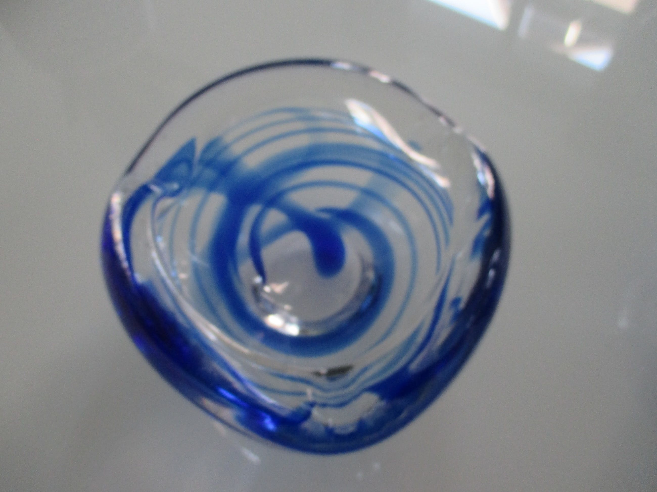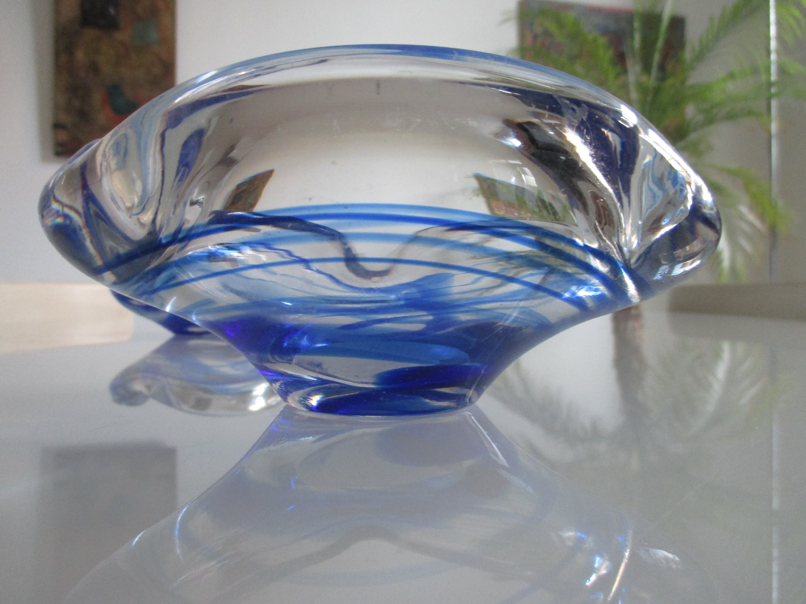 Twee vrij geblazen driehoekige glazen asbak met blauwe kleurlijnen. Afmetingen grootste asbak zijn: 7 x 16 x 16 cm. Afmetingen kleinste asbak zijn: 5 x 12 x 12 cm.