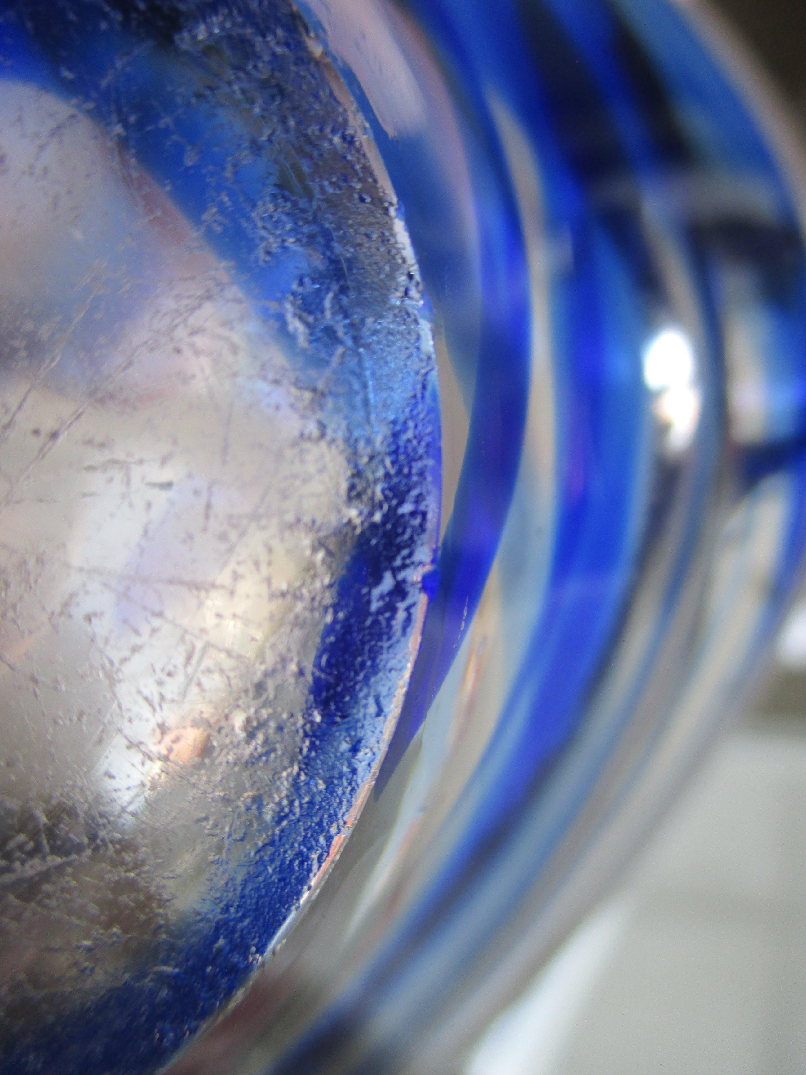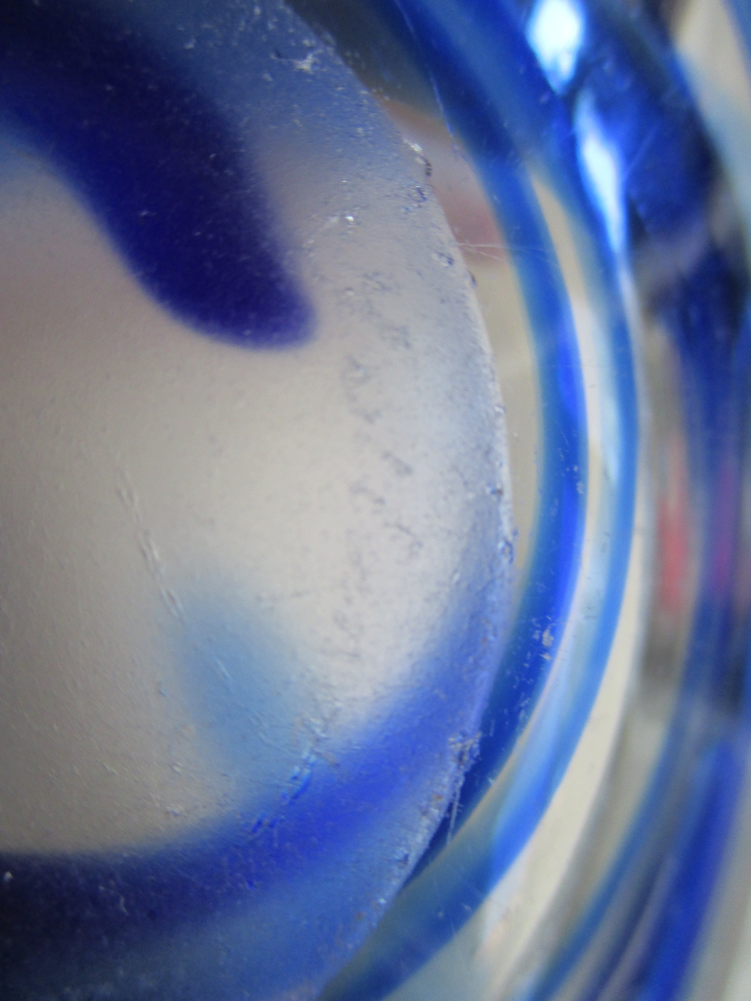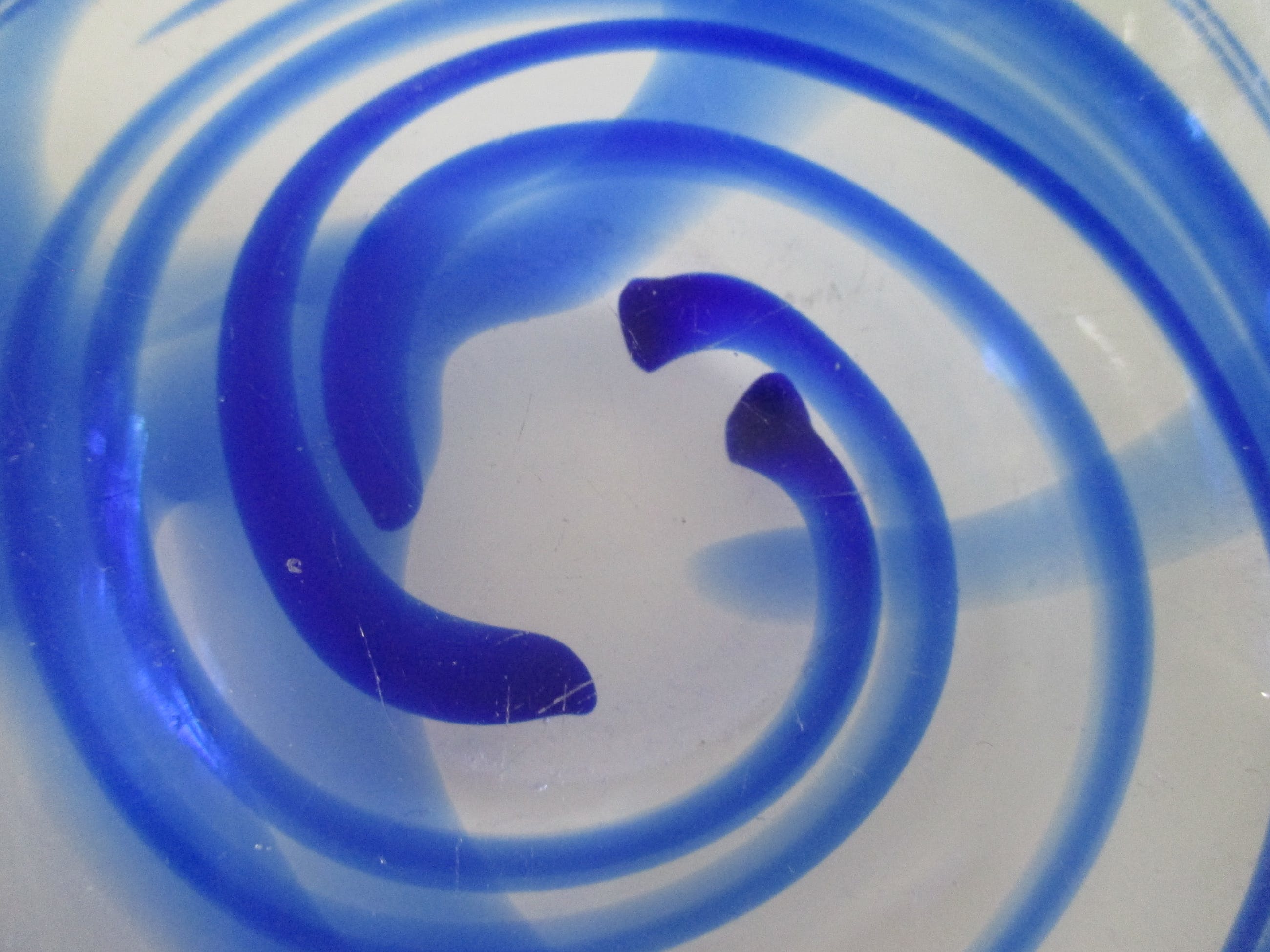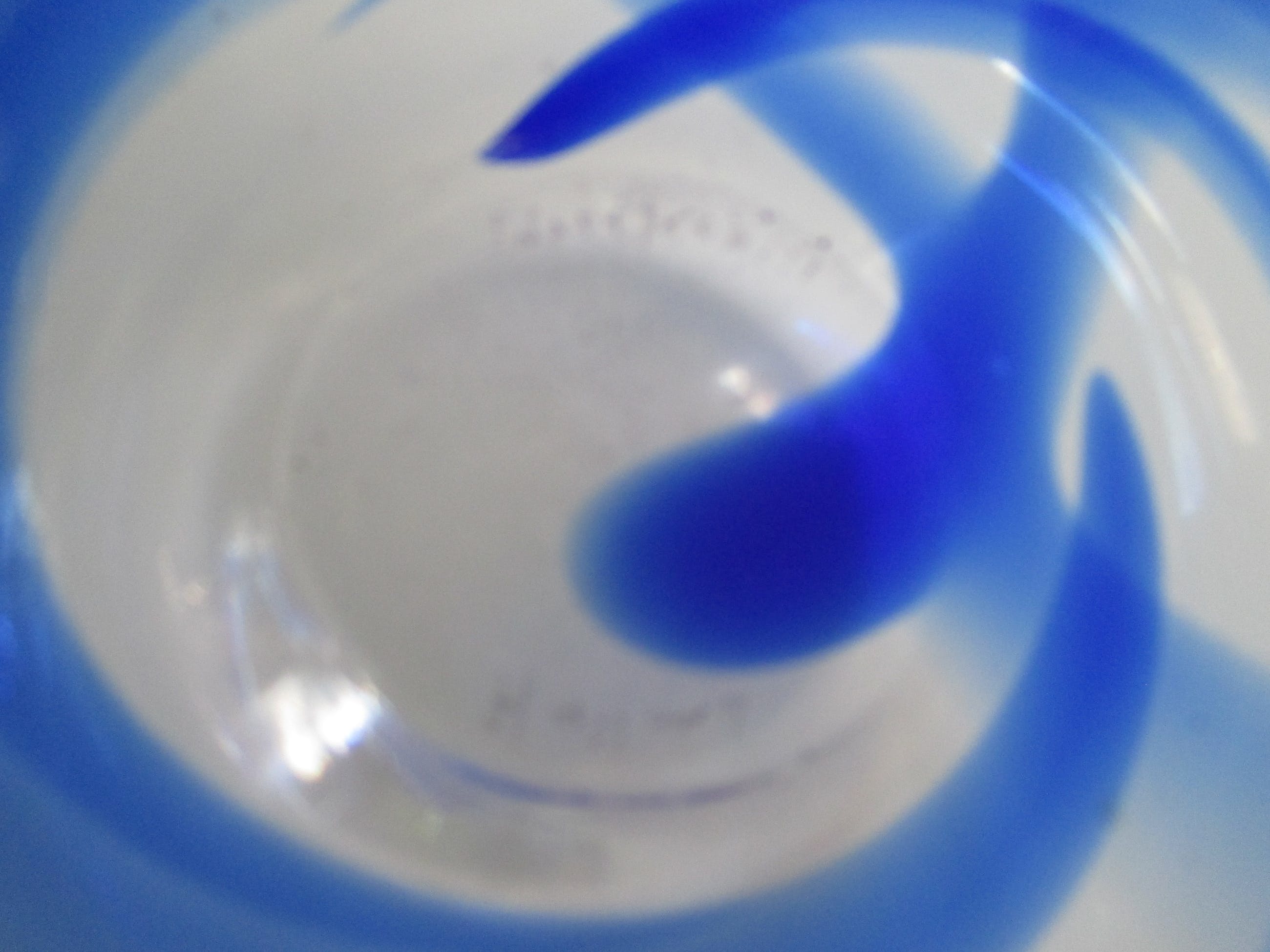 Twee vrij geblazen driehoekige glazen asbak met blauwe kleurlijnen. Afmetingen grootste asbak zijn: 7 x 16 x 16 cm. Afmetingen kleinste asbak zijn: 5 x 12 x 12 cm.