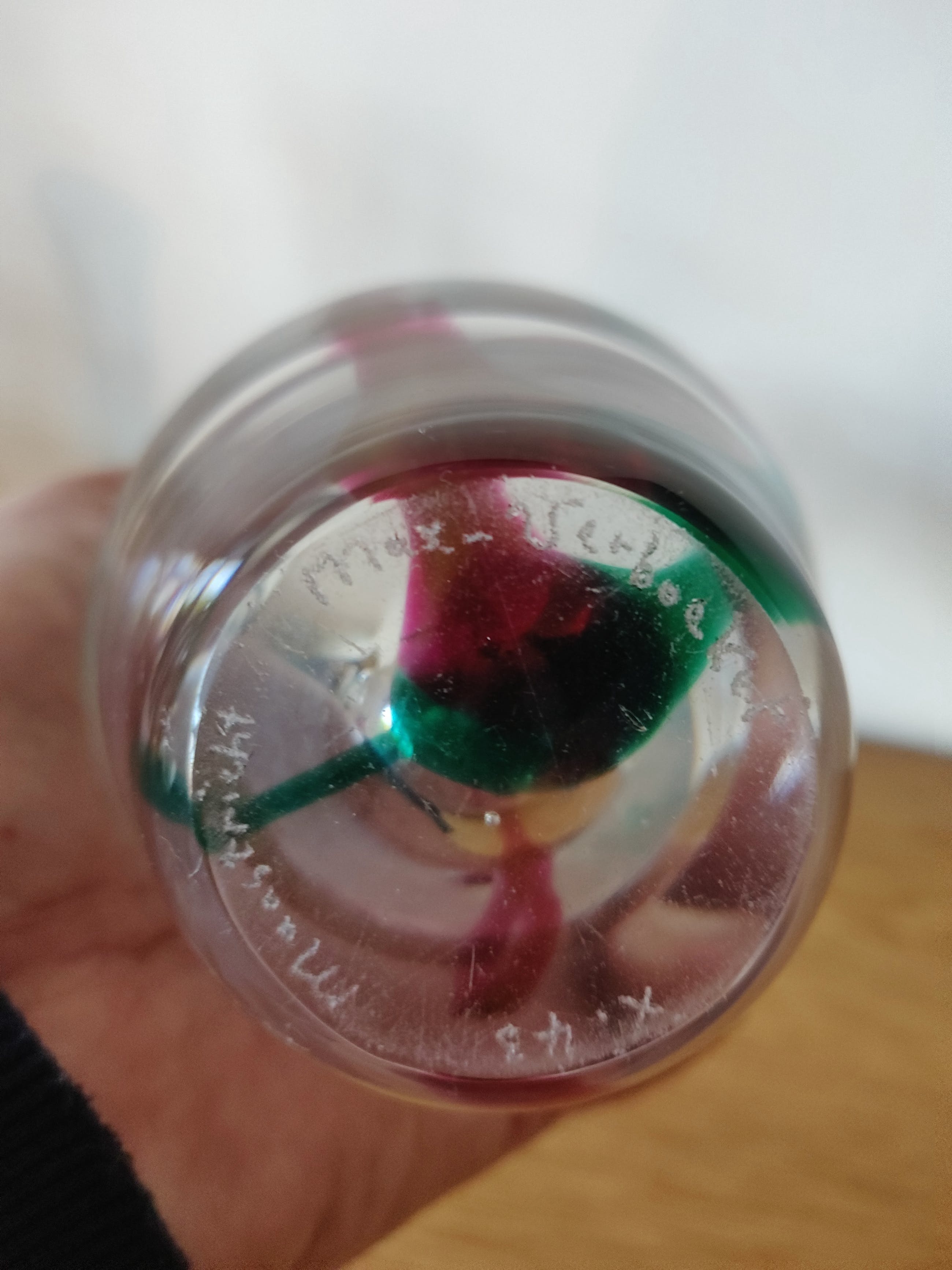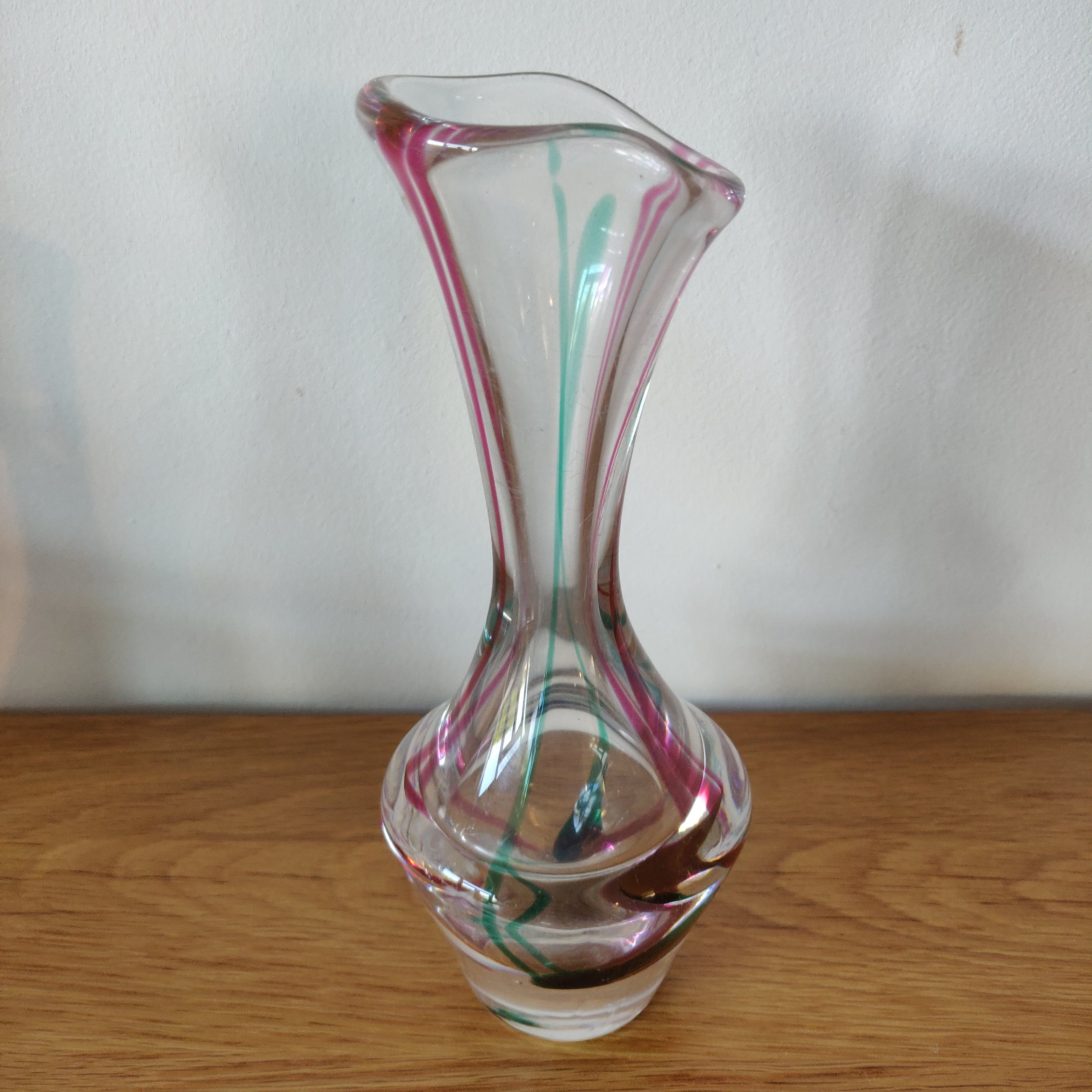 Prachtige vaas van Max Verboeket uit de jaren 1970-1980 handgesigneerd door middel van gravure in voet. Vaas is in zeer goede staat met roze en groene kleurdetails.