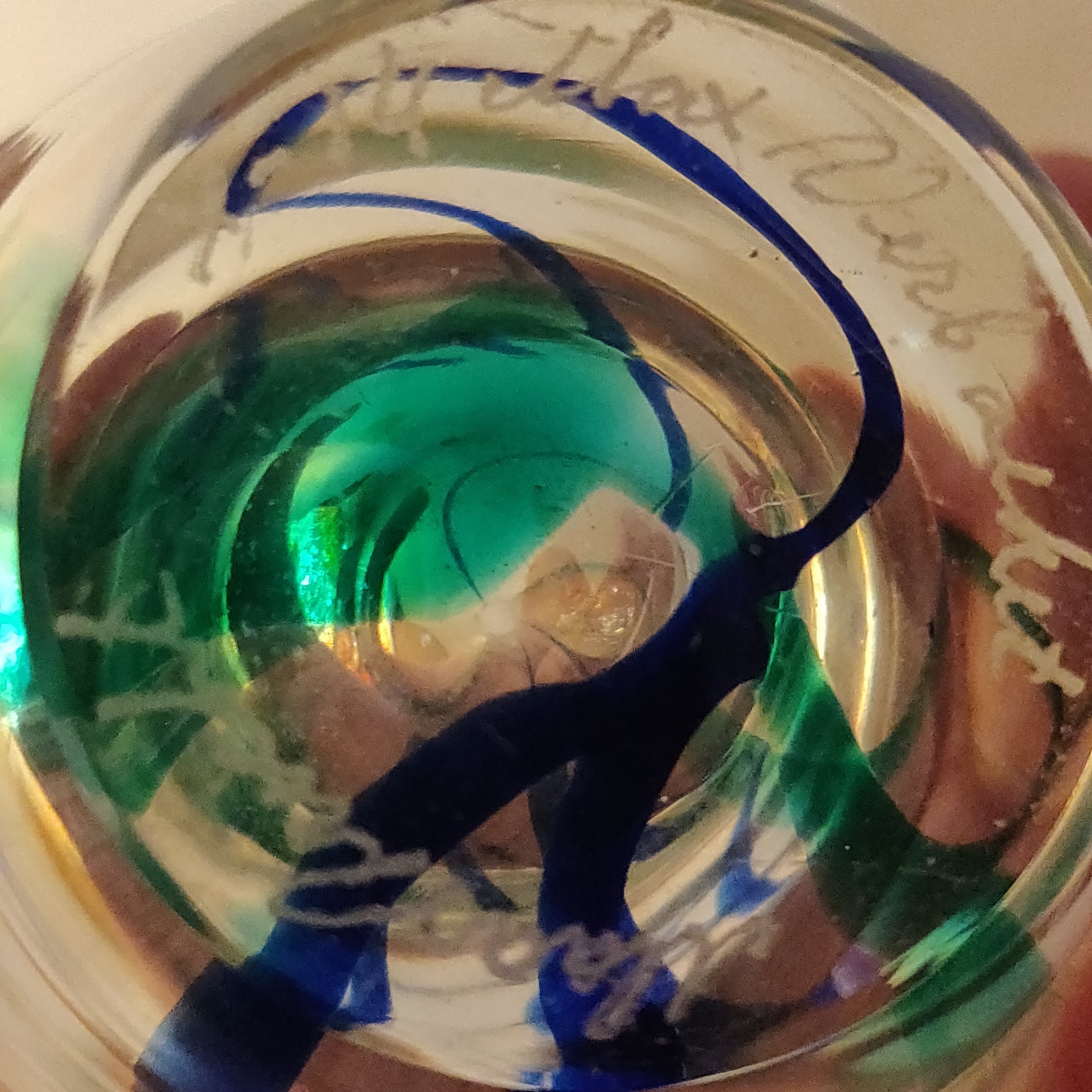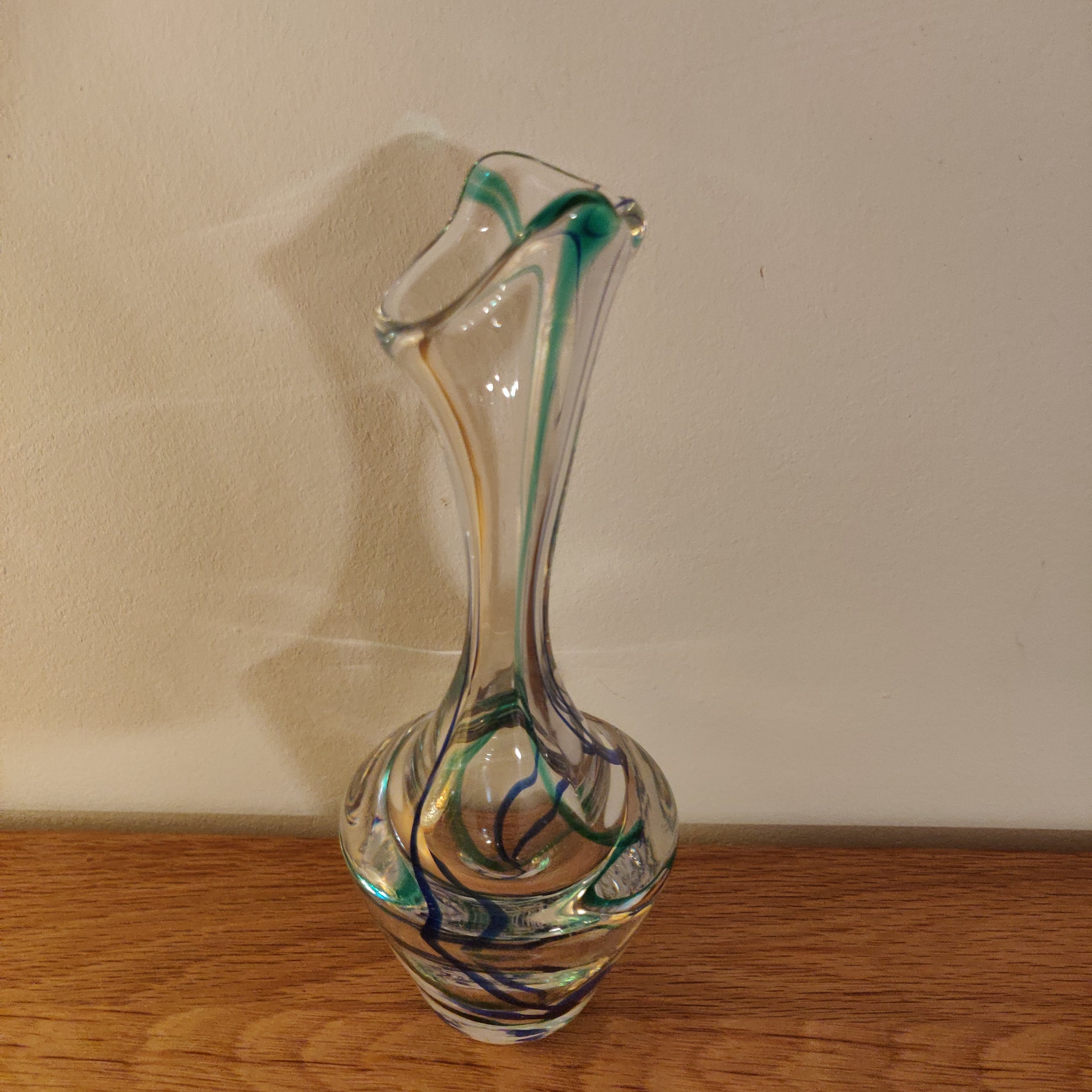 Vaas Max Verboeket van kristal uit de periode 1960-1970 gesigneerd in de voet 8 cm breed en 20 cm hoog. De vaas is in uitstekende staat en met groene en blauwe "draad".