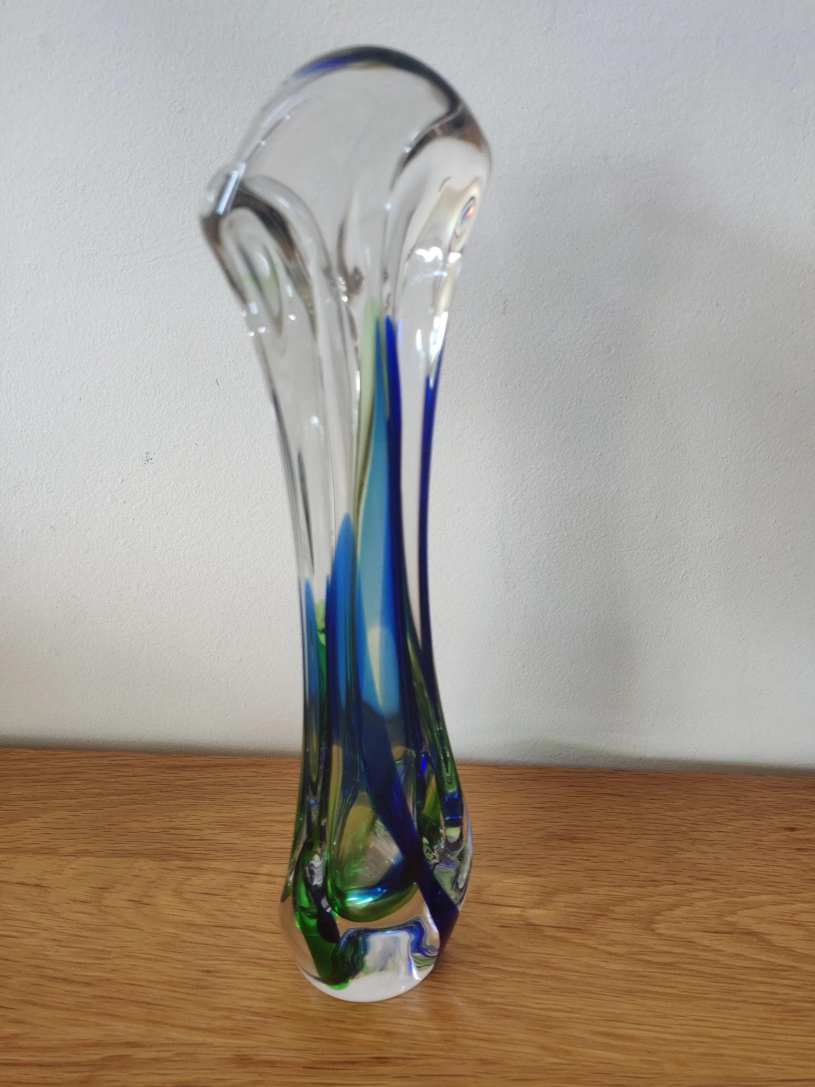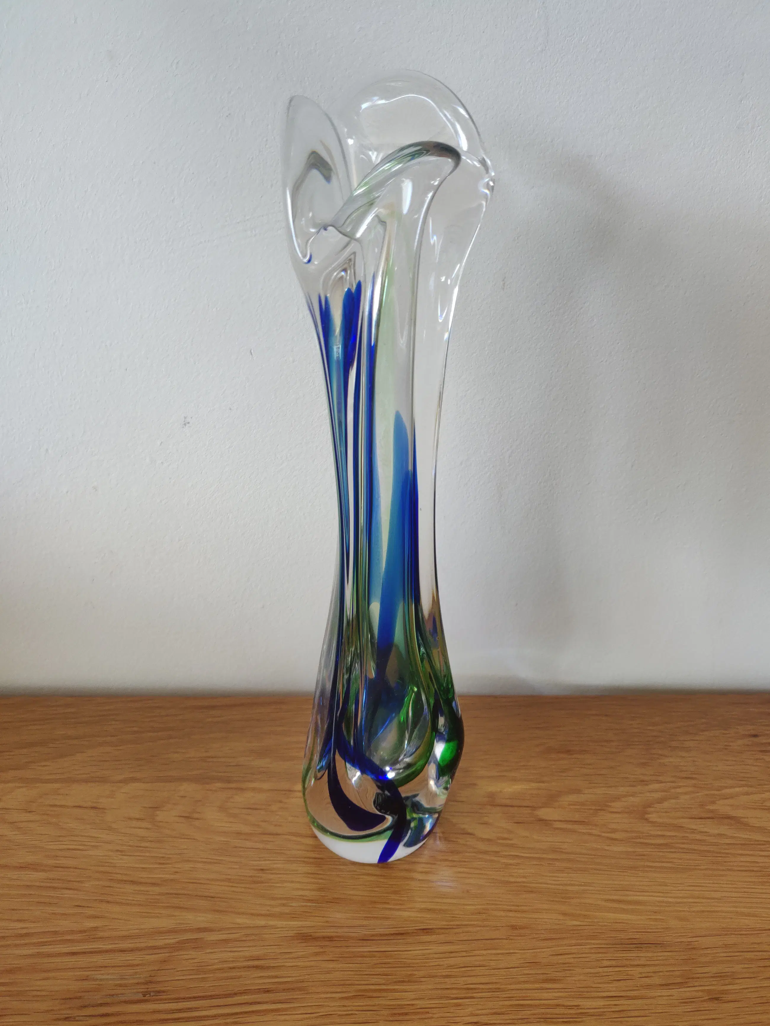 Prachtige handgesigneerde vaas van Max Verboeket van de Kristalunie met hele mooie en heldere blauwe en groene lijnen in het kristal.