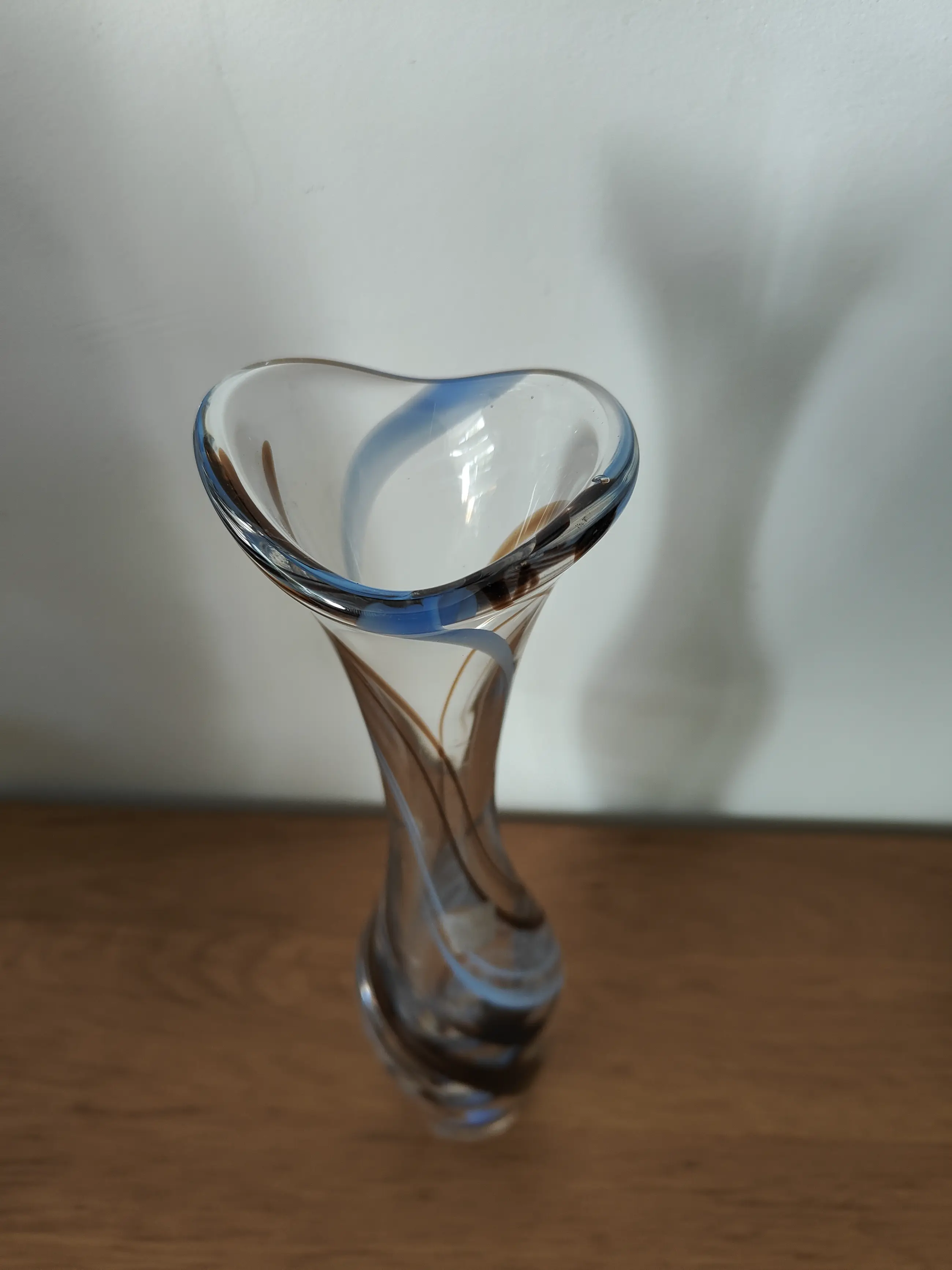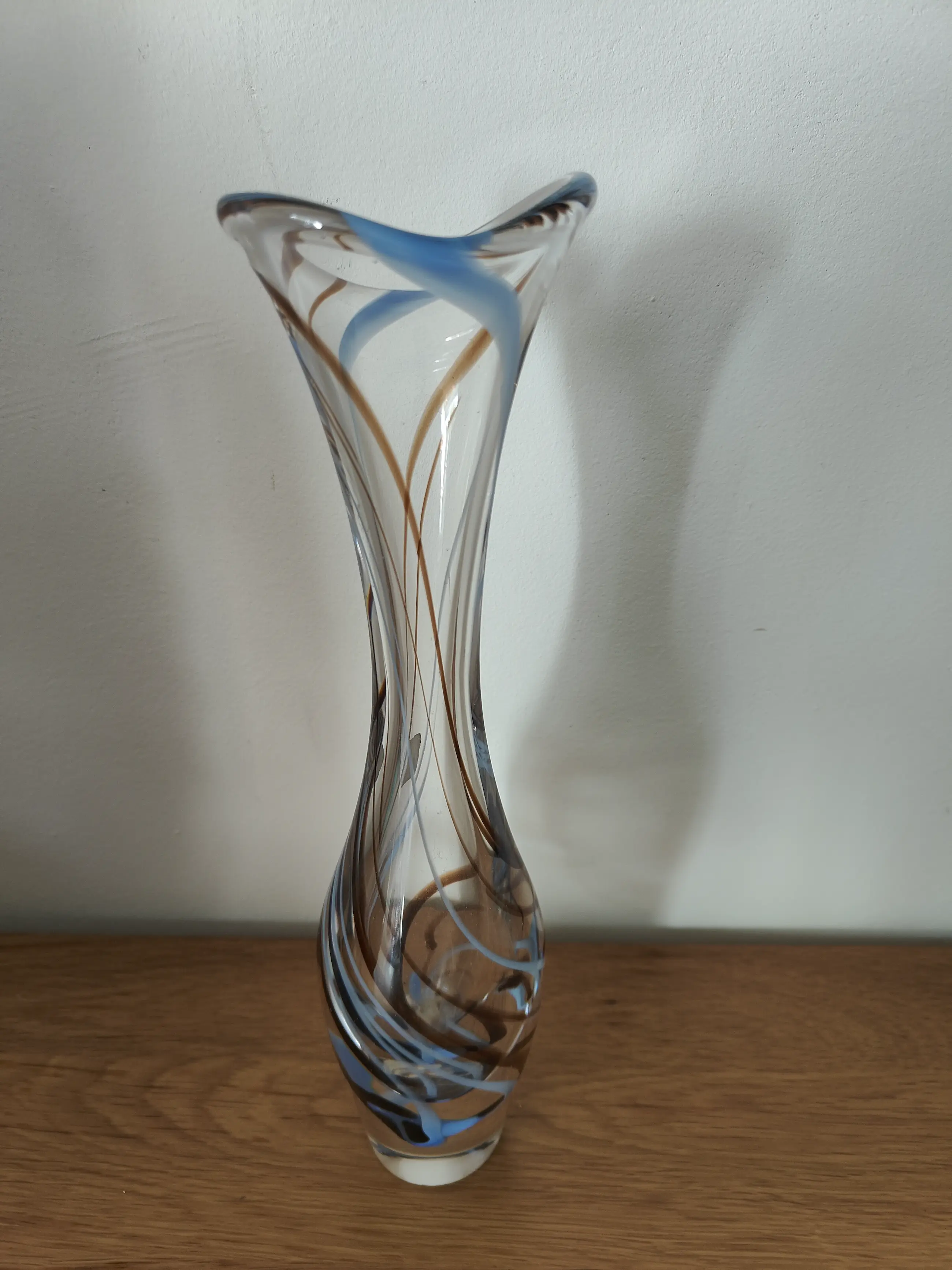 Prachtige vaas van Max Verboeket handgemaakt en handgesigneerd in de voet 28 cm hoog en 7 cm breed uit de periode 1960-1980. De signering in de voet is nog zeer duidelijk. De vaas heeft de kenmerkende gekleurde "slierten". De kleuren bruin en blauw zijn zeer apart en redelijk zeldzaam naar de maatstaven van Max Verboeket. Een prachtig voorbeeld van het werk van Max Verboeket en voor mij de meest bijzondere vaas die ik ooit van Max Verboeket heb gehad.