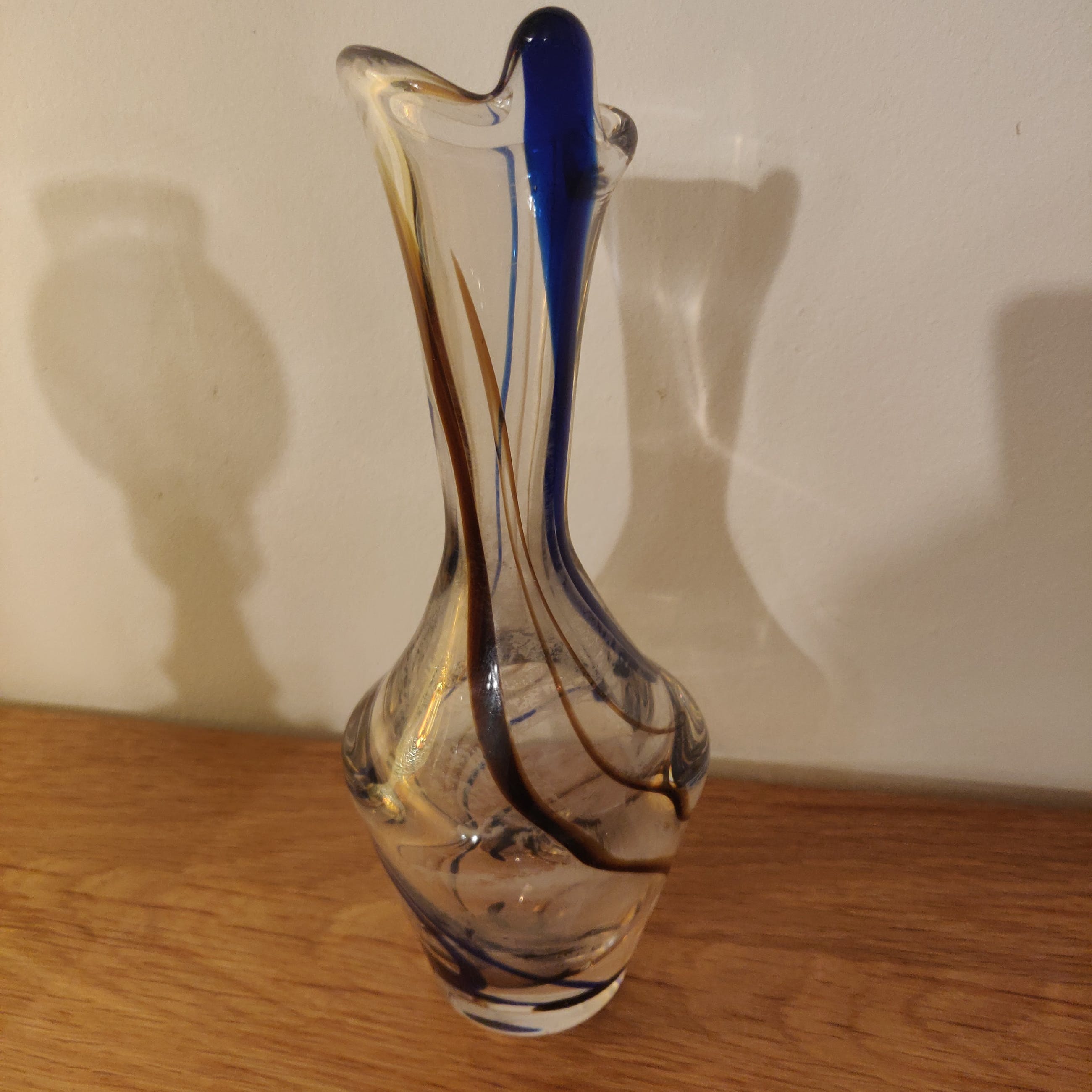 Prachtige vaas uit 1990 van Max Verboeket van kristal. Gesigneerd in de voet van de vaas. De vaas is 19 cm hoog en 8 cm breed en er zijn blauwe en bruine decoratieve kleuren verwerkt in het glas