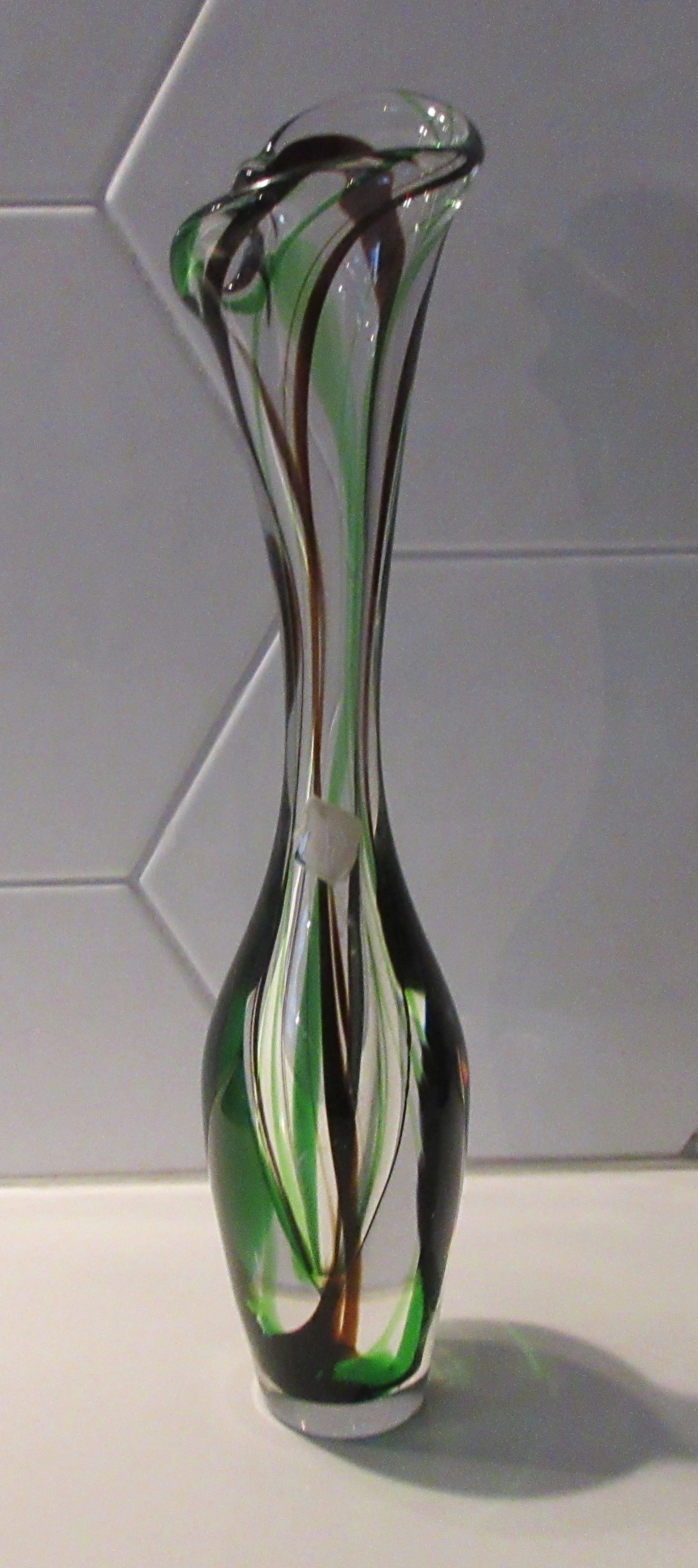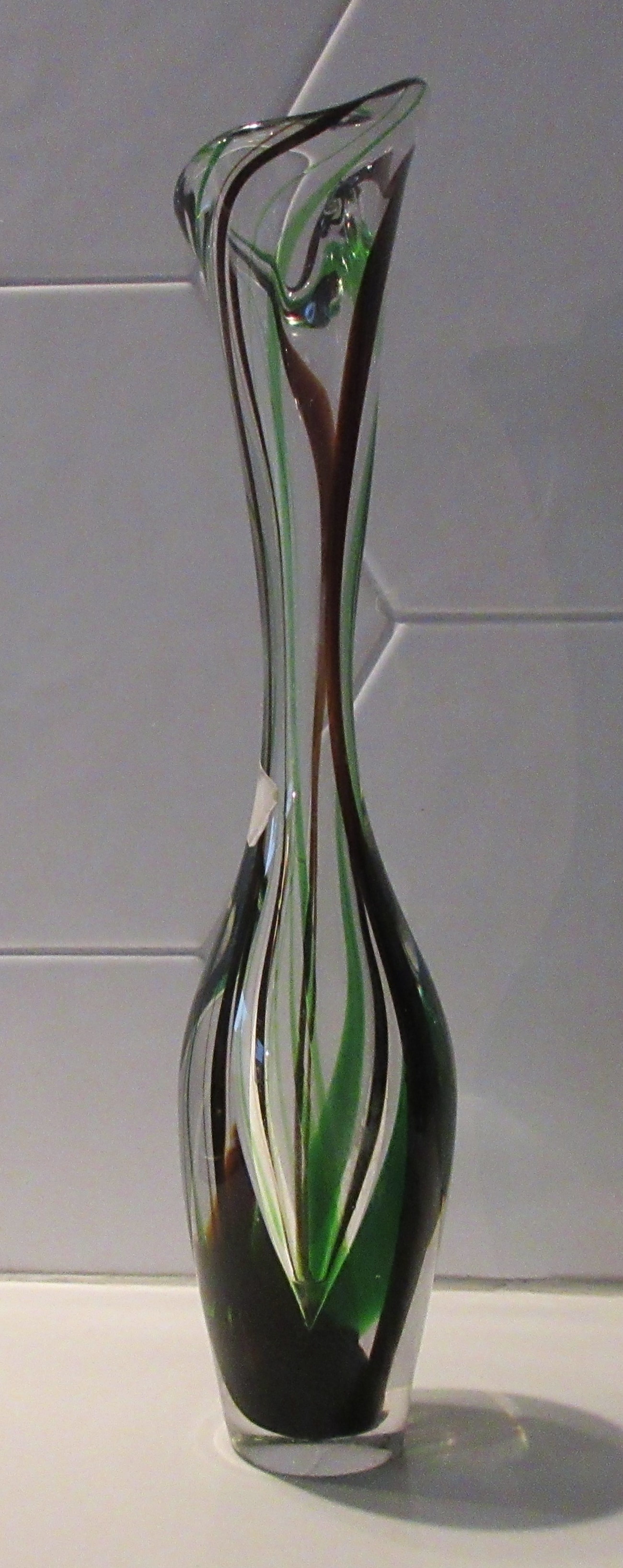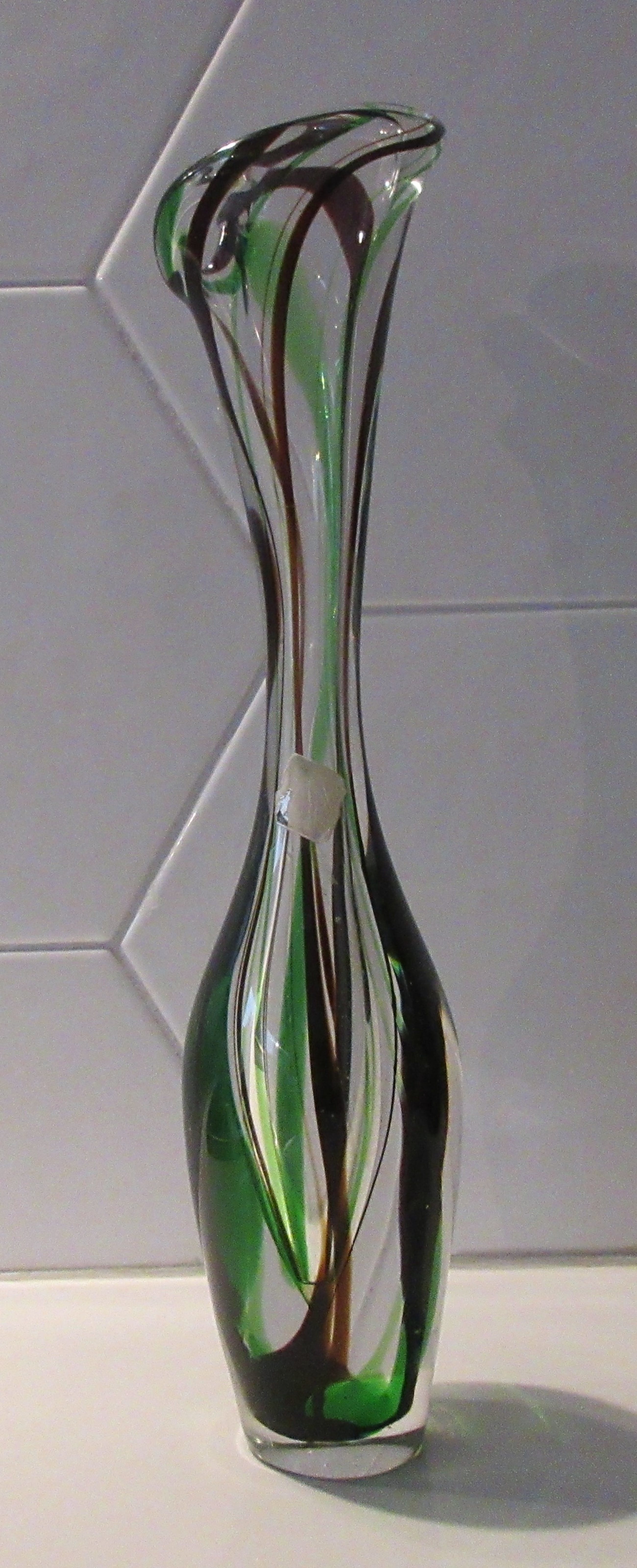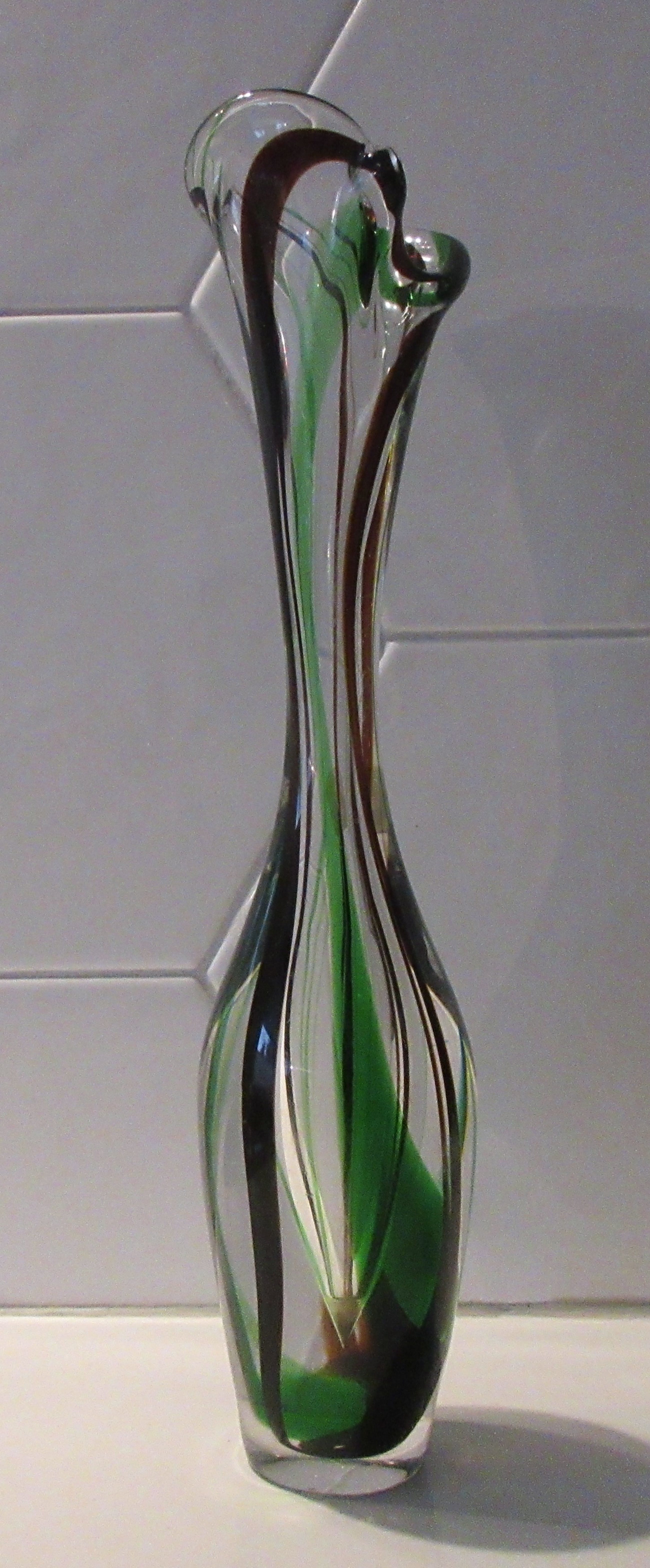 Mooie ranke Kristaluniek vaas model A9 met groene en donkerrode linten of draden. In prima conditie. Aan de onderzijde met de hand gesigneerd; Max Verboeket, Maastricht en A9. En aan de voorzijde nog voorzien van een restant van een merksticker.