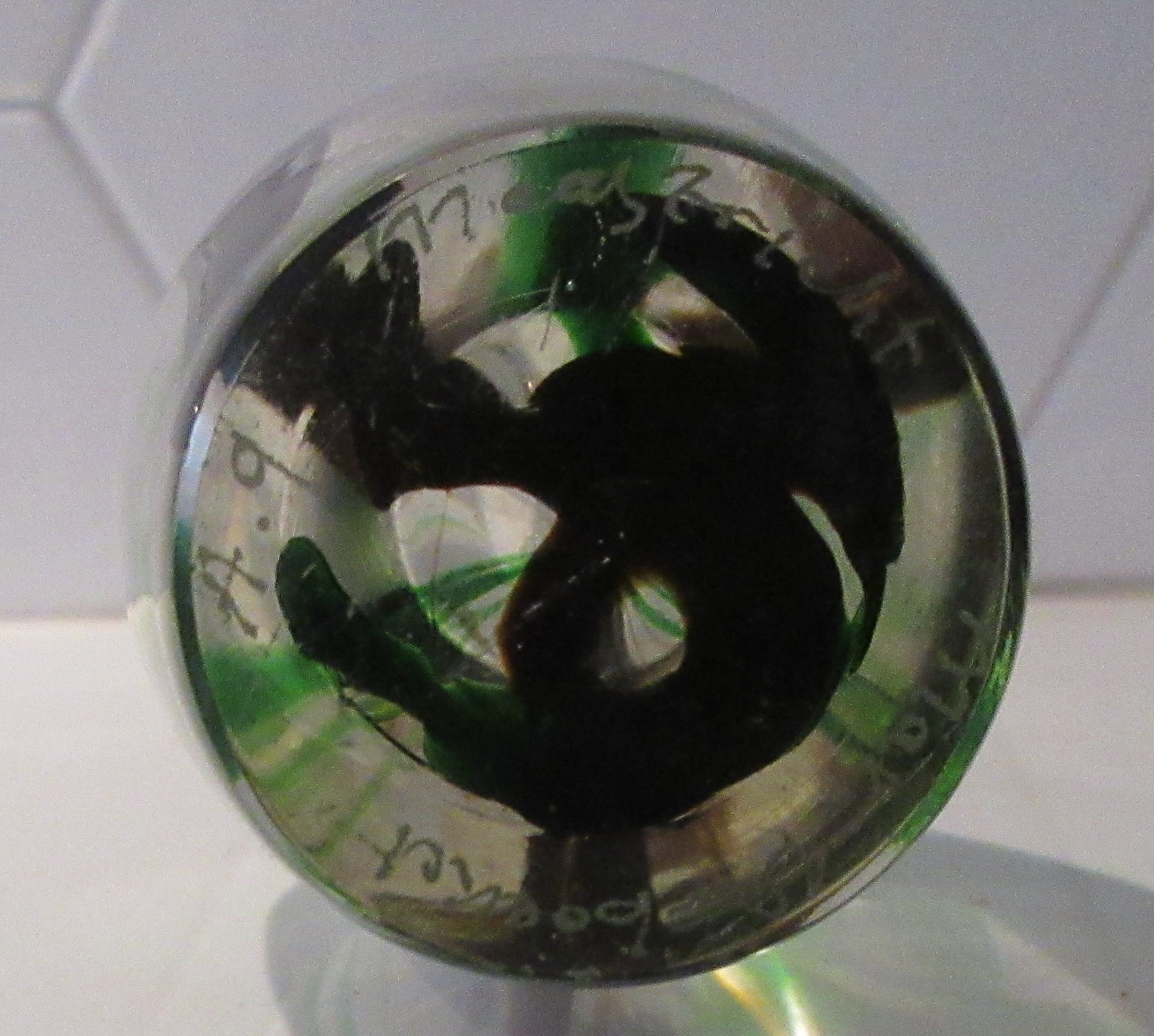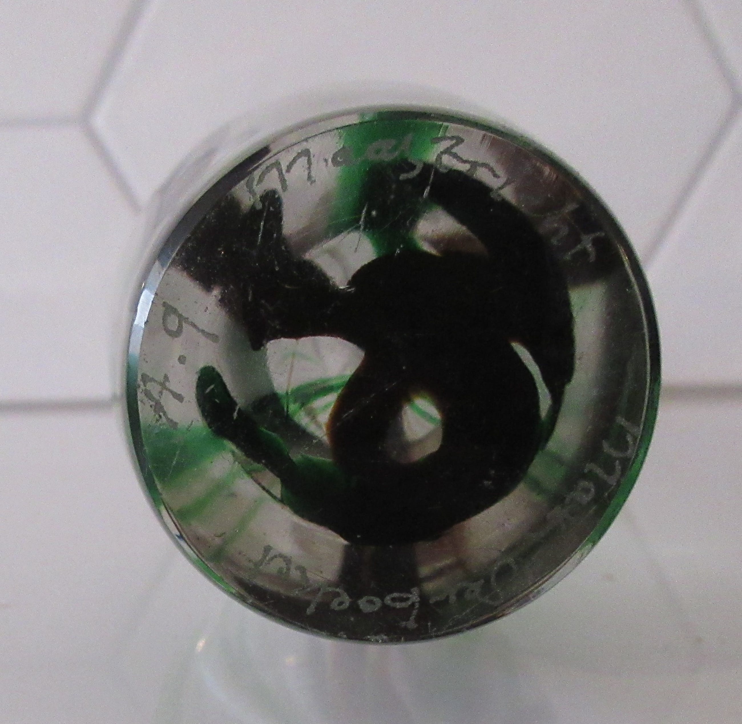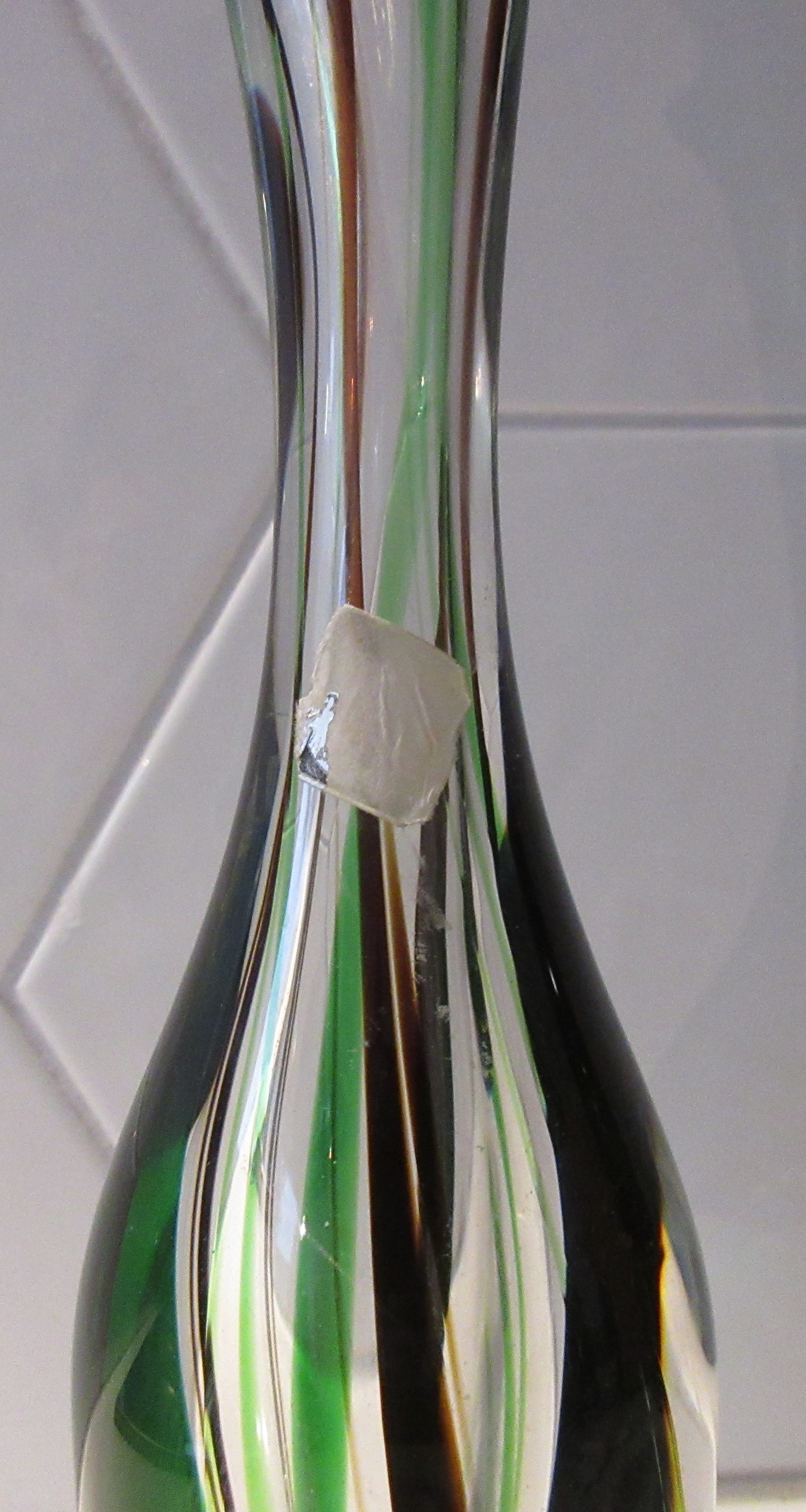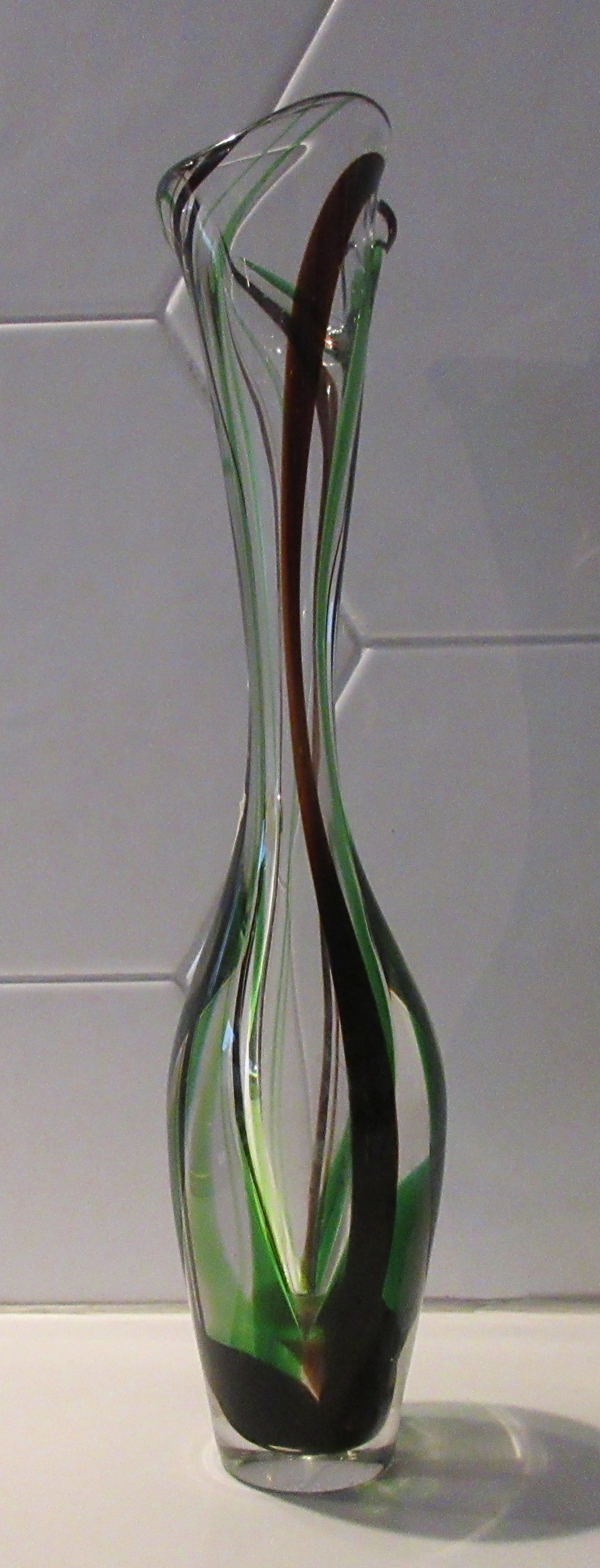 Mooie ranke Kristaluniek vaas model A9 met groene en donkerrode linten of draden. In prima conditie. Aan de onderzijde met de hand gesigneerd; Max Verboeket, Maastricht en A9. En aan de voorzijde nog voorzien van een restant van een merksticker.
