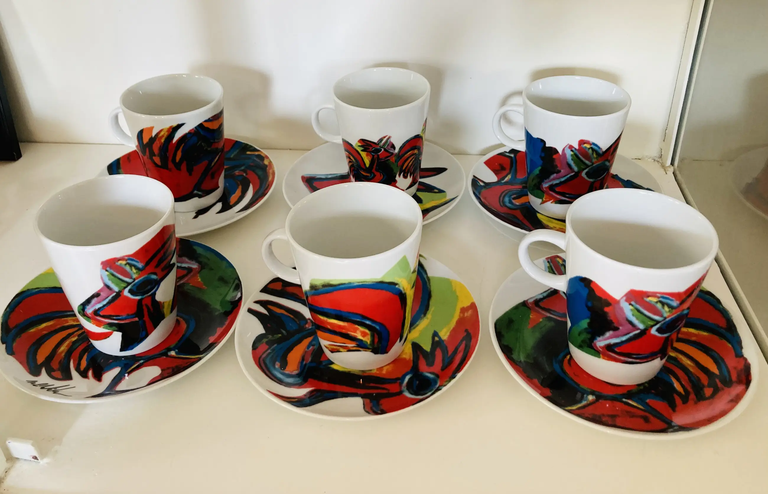 Daarbij 6 mokken met diverse afbeeldingen van kippen. Hoogte ca 10 cm. Diameter ca 8 cm.
