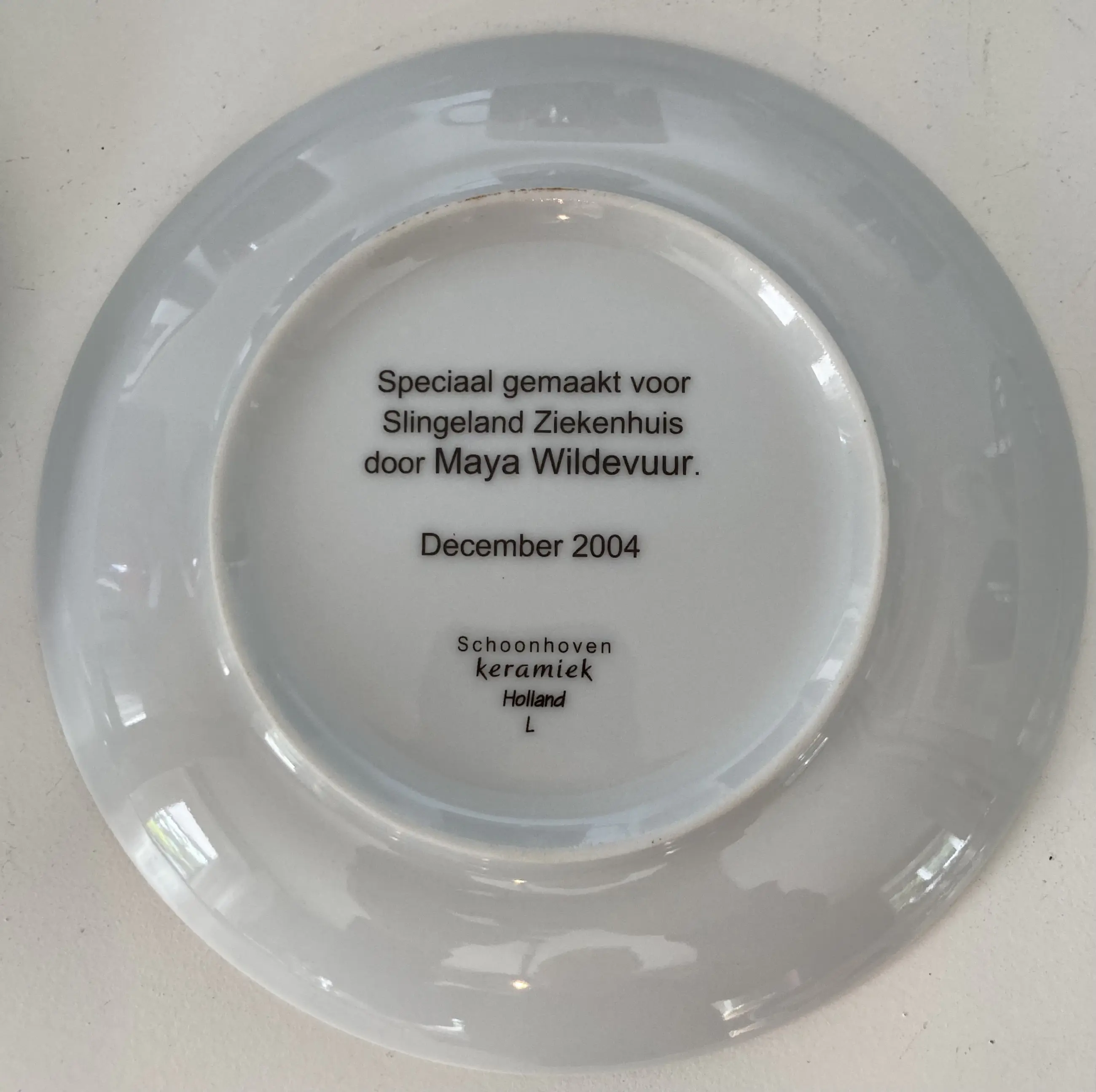 Gemaakt in 2004 voor het Slingeland ziekenhuis. Totaal 6 mokken en 6 schaaltjes Gemaakt door Schoonhoven keramiek.
