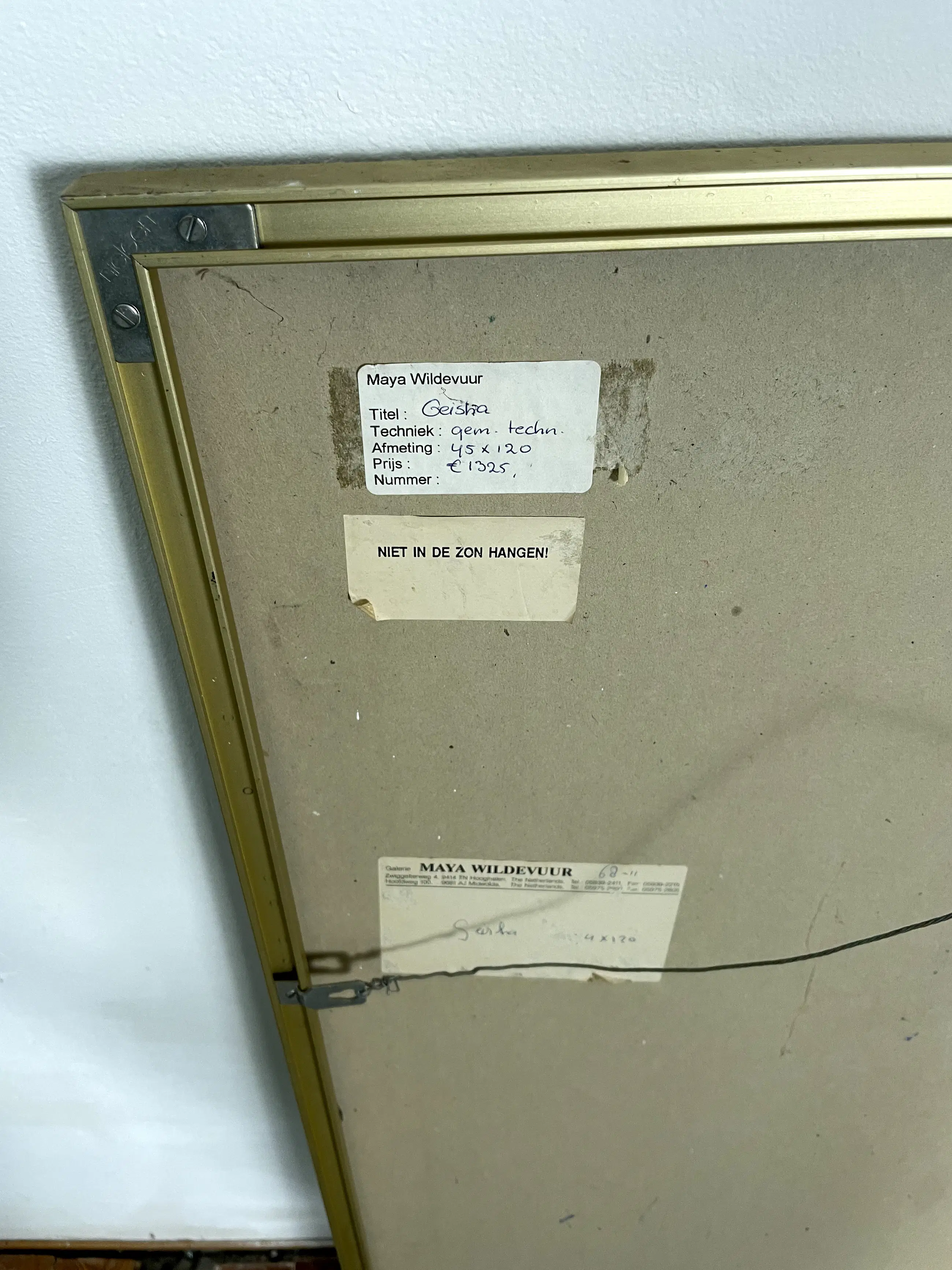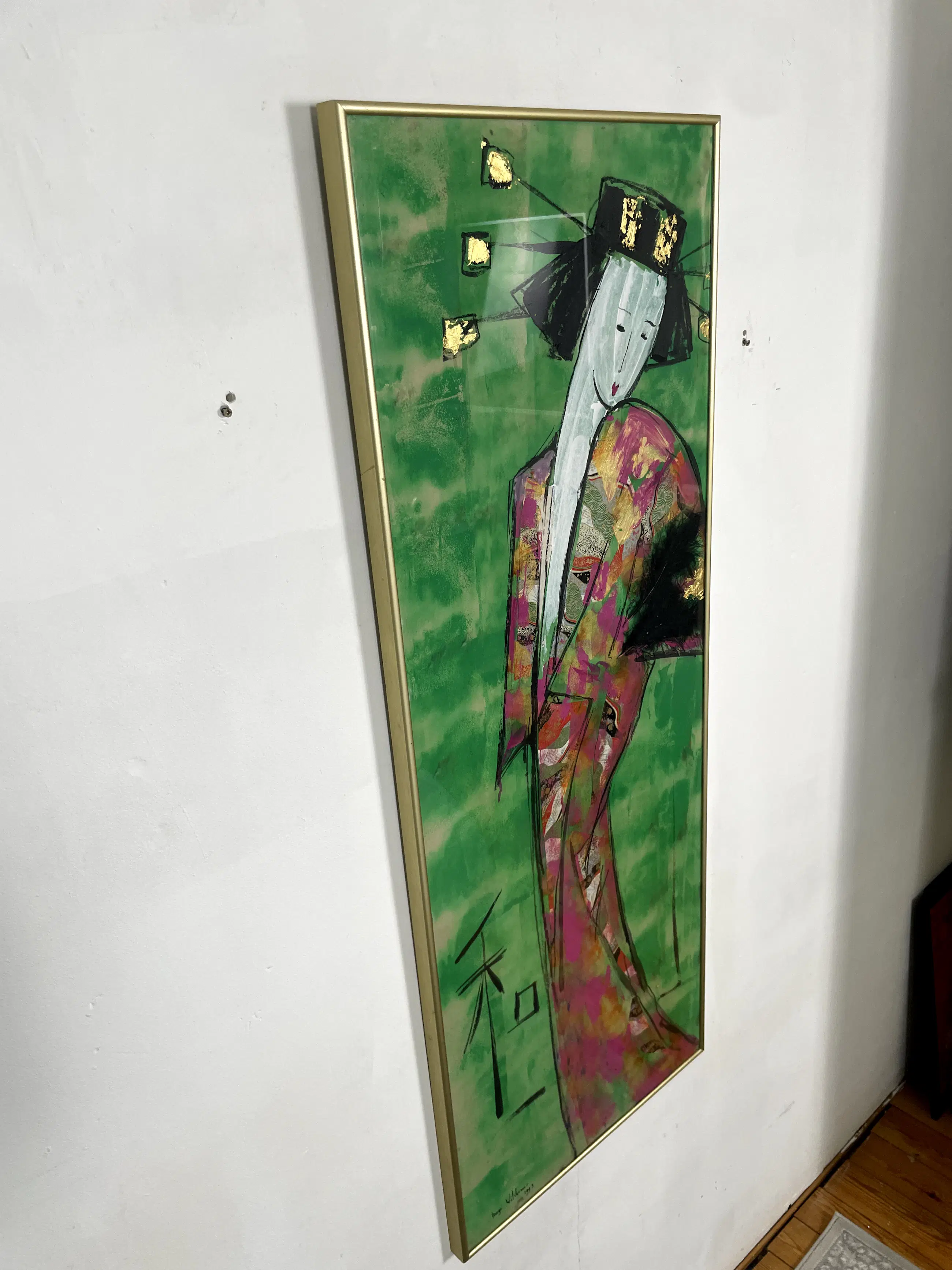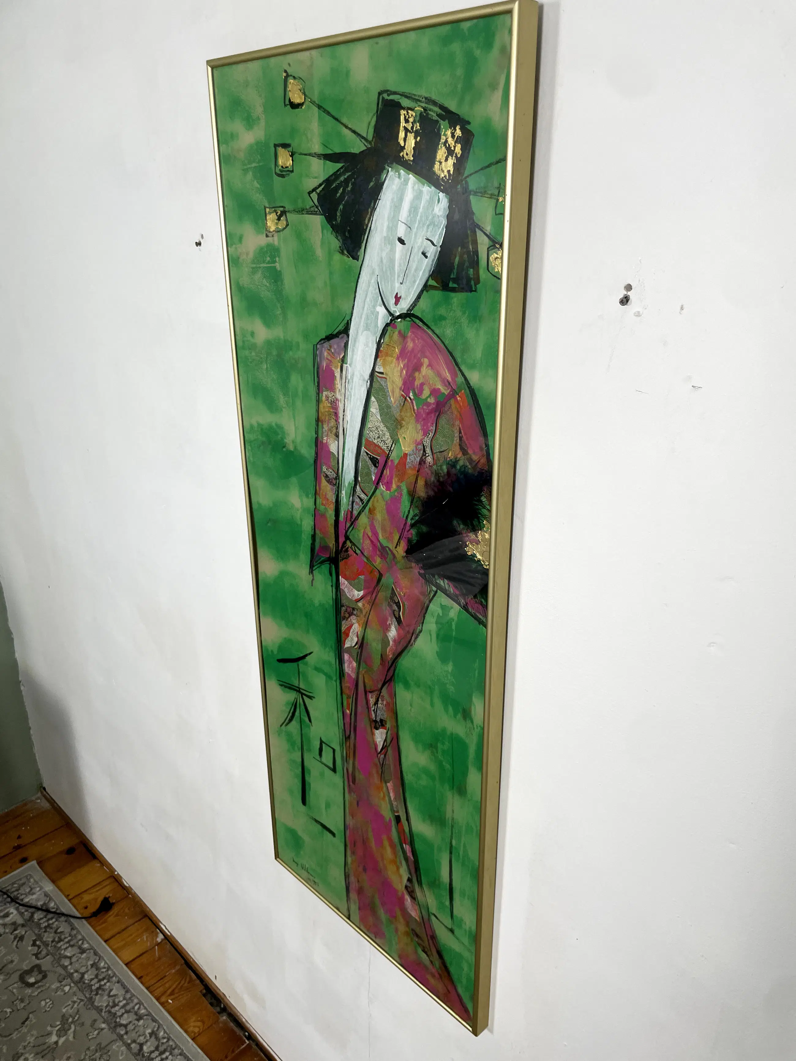 Geisha. Ingelijst schilderij van een Aziatische dame, met een verfijnde en serene uitstraling.